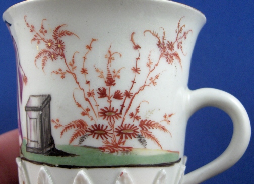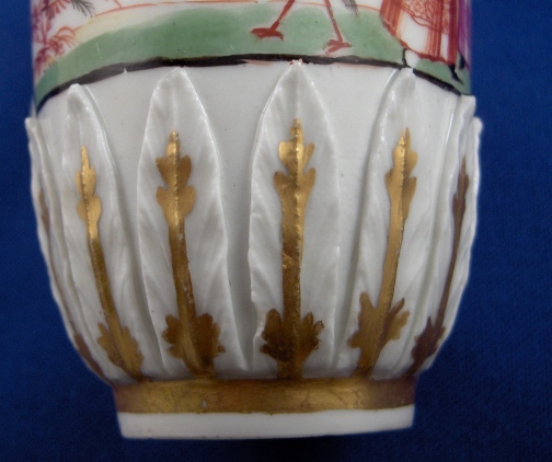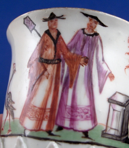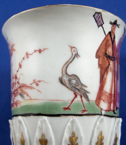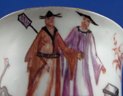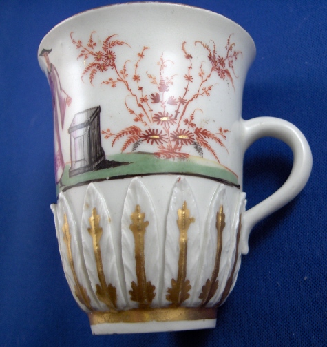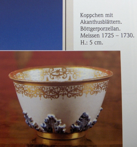 This is a very early cup made by Meissen in about 1725. It is handpainted with a chinoiserie scene and has the modelled arcarnus leaves highlighted with gold on the bottom part. This is just a superb piece and almost as early as it comes for Meissen. Had it looked at by a true expert in Germany and he agreed it is Boettger porcelain. The cup is in good condition with a restored chip to the rim where the figures are as well as a smaller one on the other side. A bit of the top rim gold has been redone. The rest is all original and in superb shape. The interesting thing is the provenance on this piece. It comes from the palace of Versailles and was restored by the restorer of the Louvre museum in France and was bought by a lady who I got it from. The cup is unmarked but obviously Meissen. Not sure of the painter but it is not Hoeroldt that much I can tell. It is probably either J.P Dannhöffer or Chr. D. Busch in Bayreuth. The cup is 3.125 inches tall and 2.625 inches in diameter at the top. It has a simple handle only which point to an early date as well since Kaendler said when he arrived that he needed to make some decent handles :) Please email me for more information or other pictures.