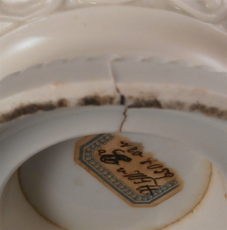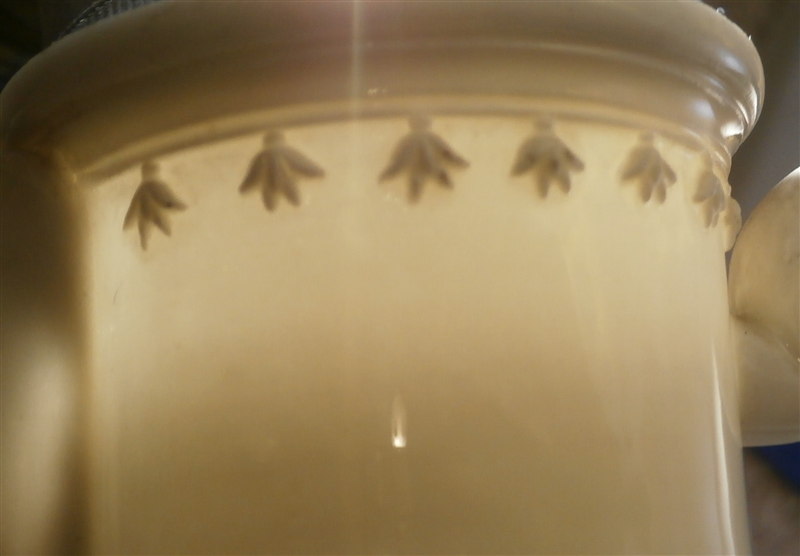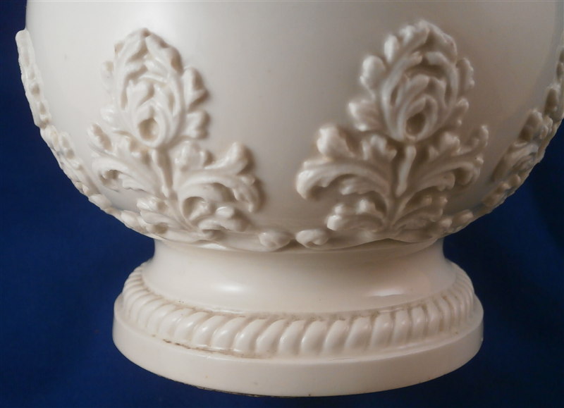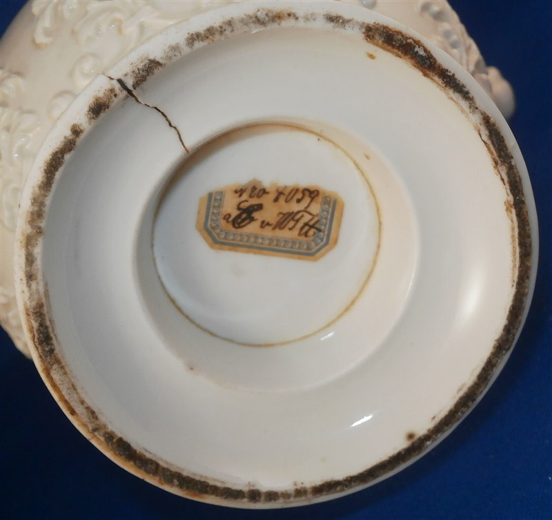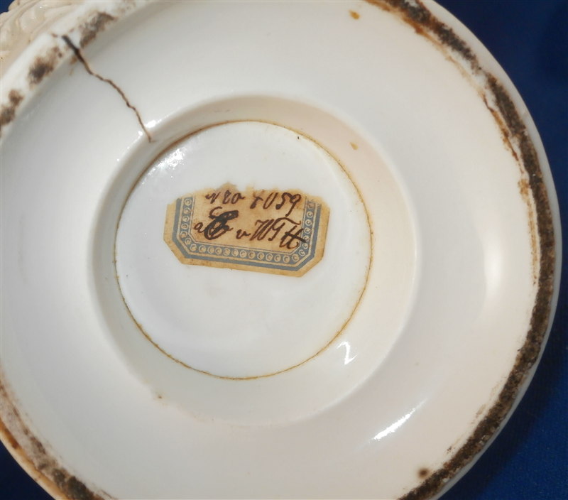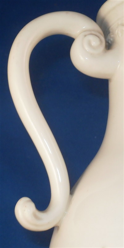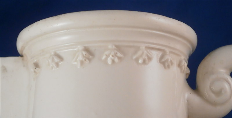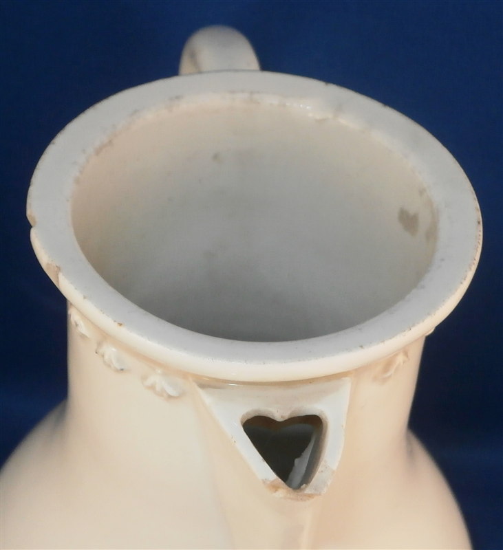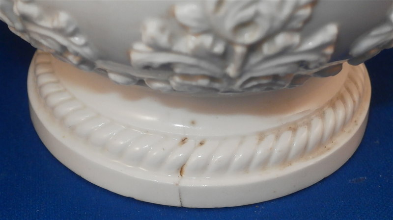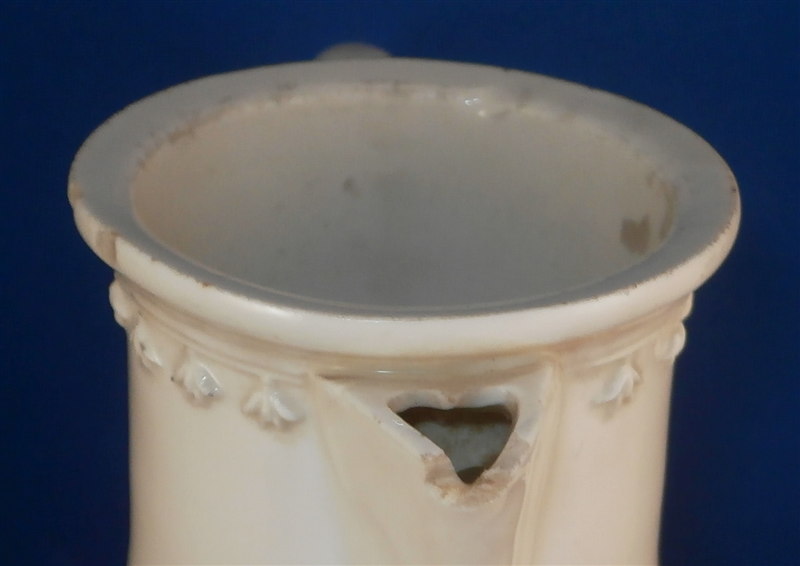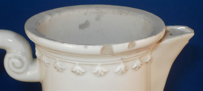 This is a super early coffee pot made by Meissen in about 1713. This is as early as you can find Meissen in true white porcelain - Böttger porcelain. The piece is about as nice as you can find in terms of the early pieces since they were left in the white and just had applied decorations. In this case the pot has a superb applied floral decoration around the bottom part of the body - probably thistles by the look of it which were popular during this time as decoration. The footring has a nice robe design to it and the top has a small leaf (?) design applied to it as well as some rings in the paste. Typical early handle shape and small spout. The pot is really in great condition with two small rim chips to the top edge, the spout has the tip borken off and a firing crack to the base as shown. Some manufacturing marks, etc. which are completely normal to the early pieces! All in all a superb piece of amazing quality. Nice and white better than some later pieces one sees. Probably had a lid at some point but that is long gone. The piece is 6.75 inches tall and 4.25 inches in diameter. The pot is not marked which is completely normal on the early Meissen pieces as none were marked yet. They didn't come up with the crossed swords for a few years yet and the other earlier marks were not in use yet either. All in all one of the best pieces I have ever owned and deifnitely the earliest one can find. Please email me for more information or other pictures.