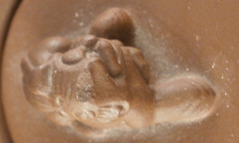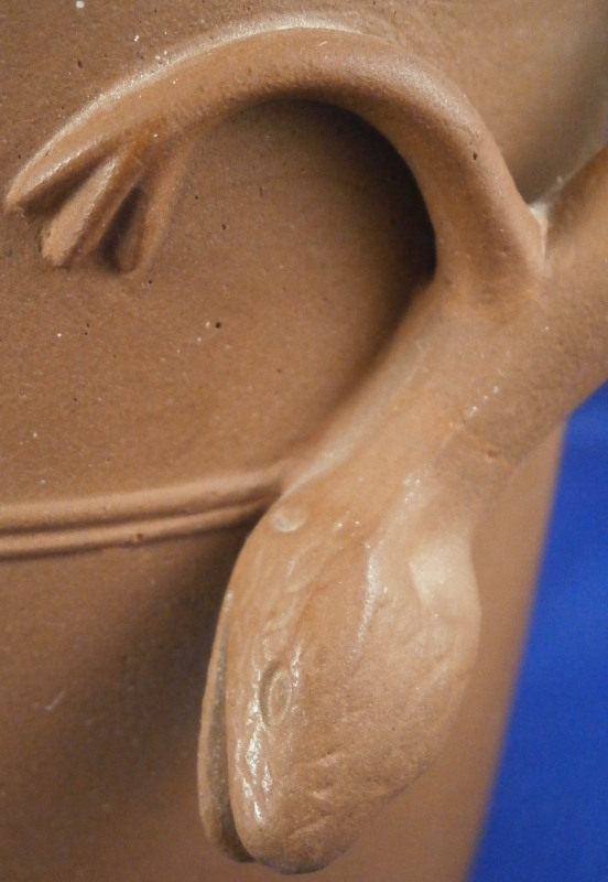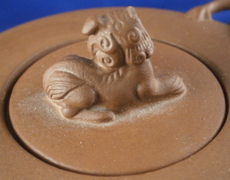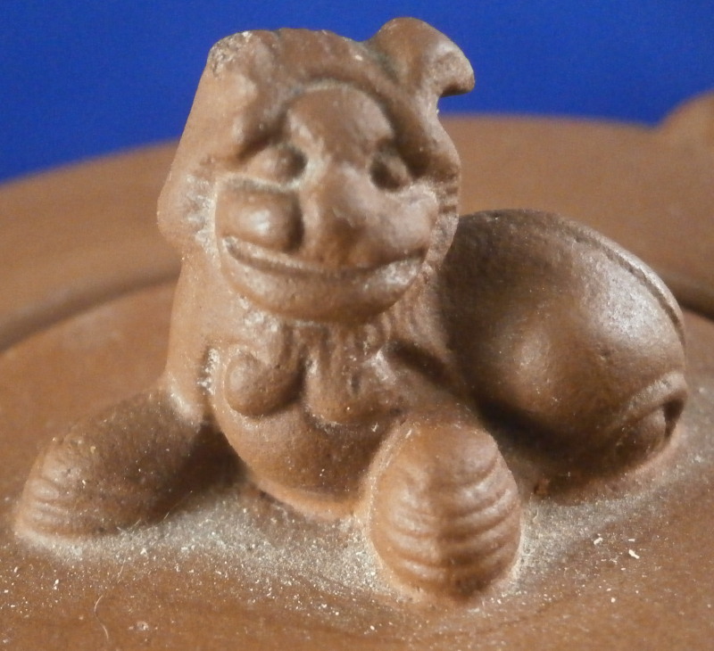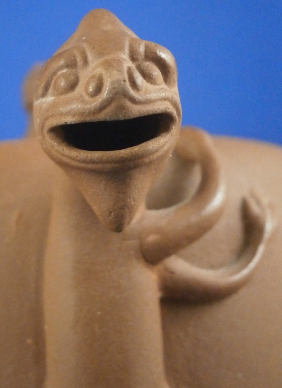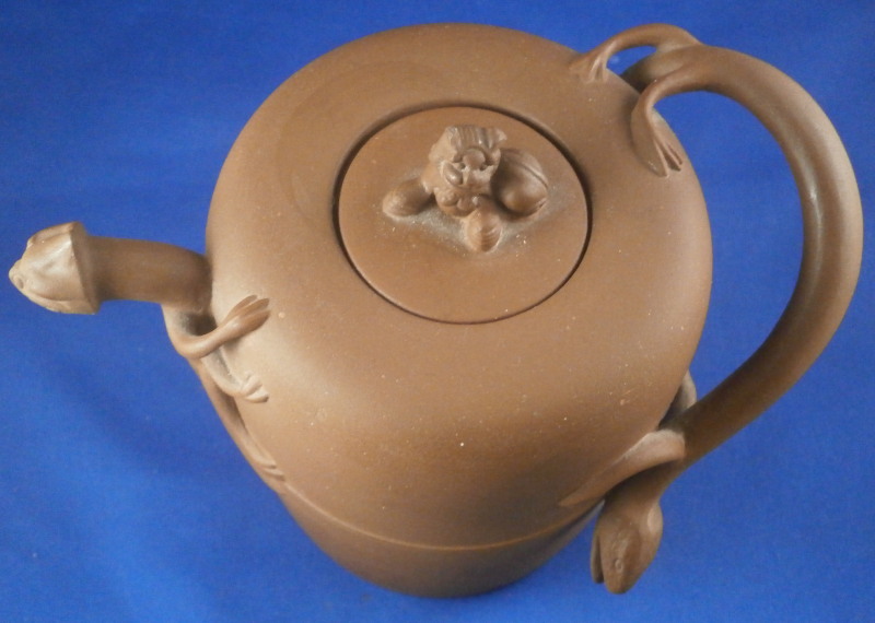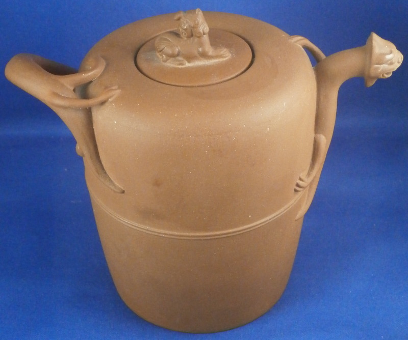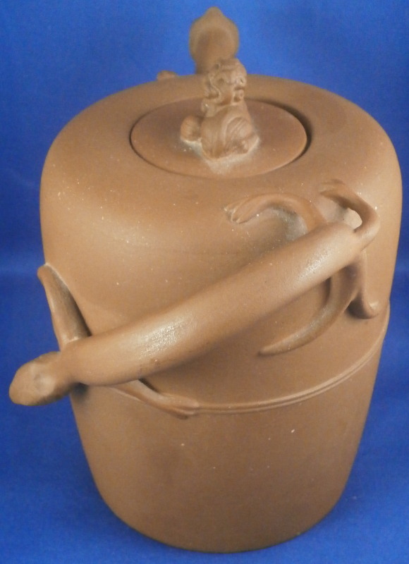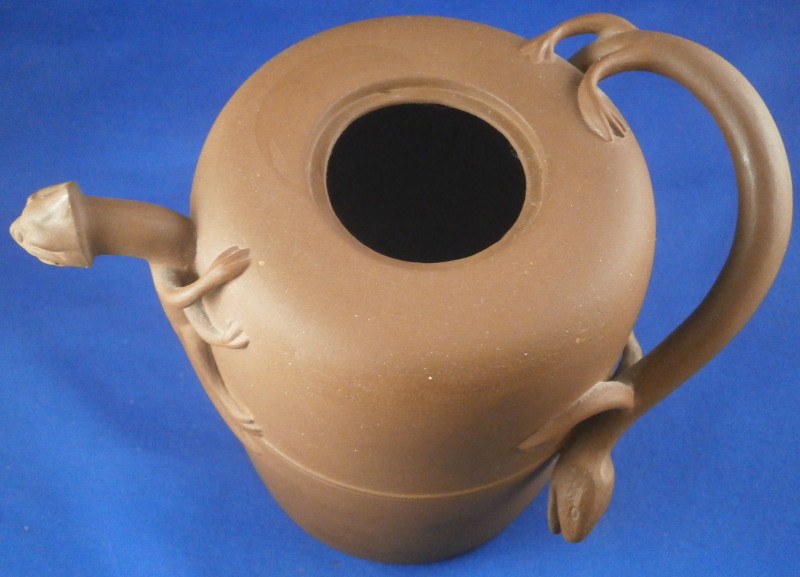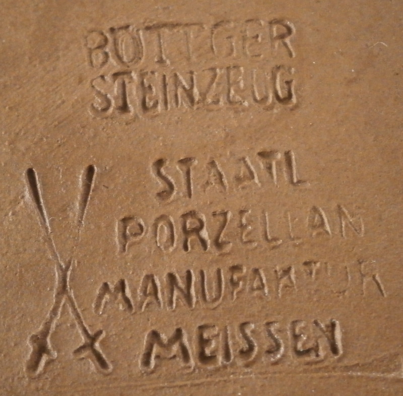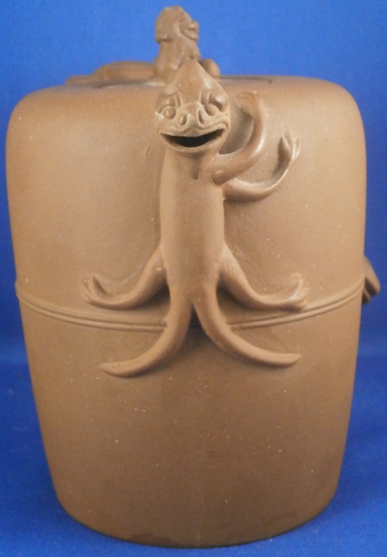 This is a really fun teapot made in Böttger Steinzeug by Meissen in the 20th century after an early 18th century original. This sort of stoneware is really hard stuff unlike the fragile porcelain. The piece is nicely modeled as a simple teapot with a decorative relief double ring around the center but the fun part is the handle and spout are both in the form of some sort of lizard and the finial on the lid a stylized lion or Foo dog type figurine. Really a super fun piece. It is nice to see a piece by them using their brown stoneware instead of the usual white porcelain and nice to see them redoing the super early stuff that no normal person could ever afford anyway. The pot is in great condition with a teeny chip to the bottom edge not visible when the pot is standing on the table. One ear of the figural finial is broken off. Not sure how that happened seeing how hard this stuff is. The piece displays perfectly and is jsut plain fun! It is marked underneath with the impressed crossed swords mark as well as the words Boettger Steinzeug as well as an impressed O228 and Staatl. Porzellan Manufaktur Meissen so from the time when it was still udner East German hands. The piece is 5.25 inches tall, 6.375 inches from handle to spout and 3.875 inches in diameter. Please email me for more information or other pictures.