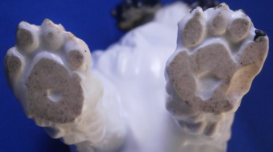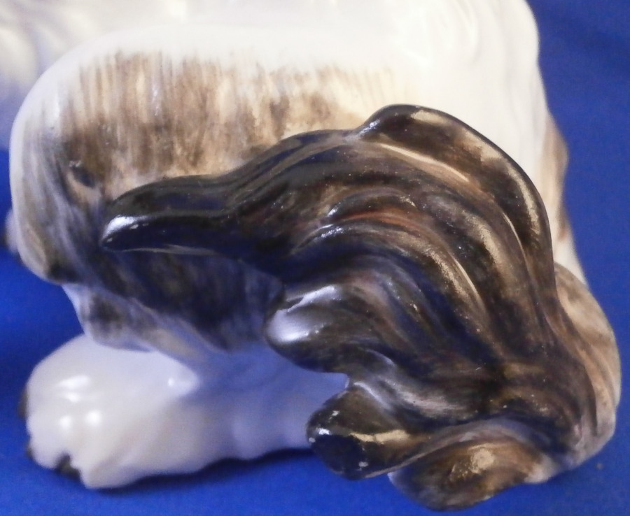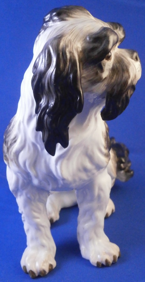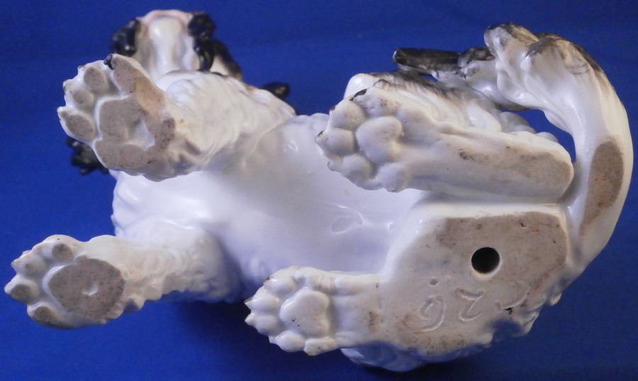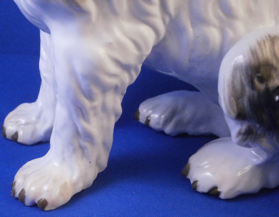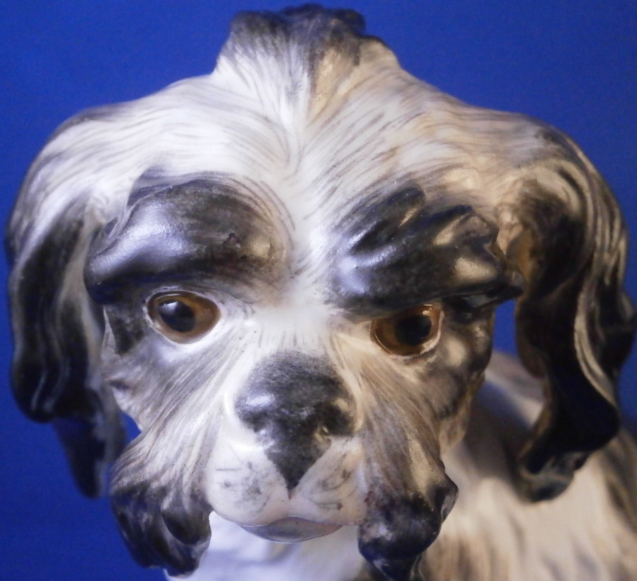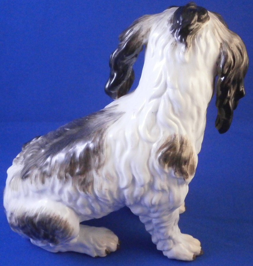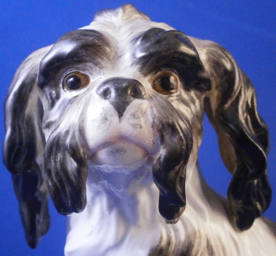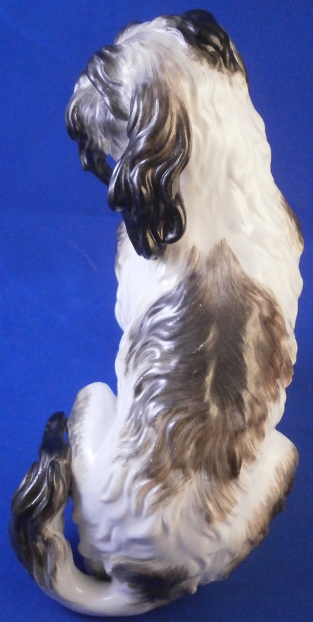 This is a rare dog figurine of a King Charles Spaniel also often called a Bolognese Terrier though I am fairly sure it is the first type of dog breed. Either way it was made by Meissen in the early to mid 19th century. He was originally modelled by the famous Kaendler in the 18th century with lots of detail and is very well hand painted. The difference in terms of quality to more modern Meissen dogs of this type is obvious. He even has the paws modelled underneath. A heavy figurine with just the typical one air hole underneath it's butt :) Marked with the blue crossed swords as shown though they are quite faint. Just in case one has its doubt it also has the incised model number C26 to show the authenticity of the figure! There would have been a companion piece facing the other way but I don't have him. The figurine is of a good size not tiny like most dogs. The dog is in superb condition with just a touch of wear to the back but as nice as they come! There is what looks like a chip to the underside of the front laft paw but it is from when it was made and does not show when on display. The figurine is 5.75 inches tall, 5.5 inches long and about 3.75 inches deep. Please email me for more information or other pictures.