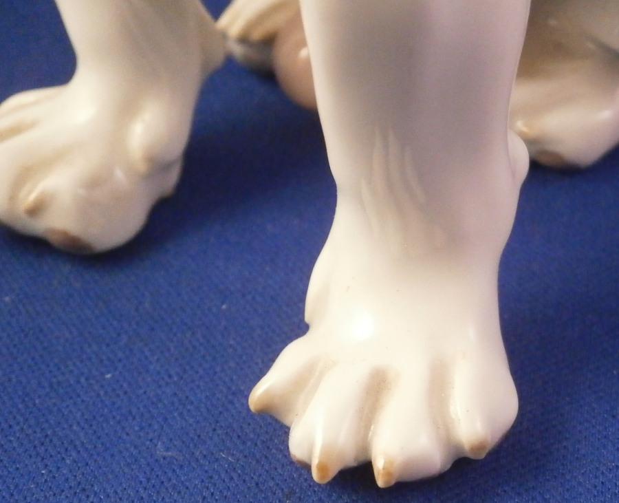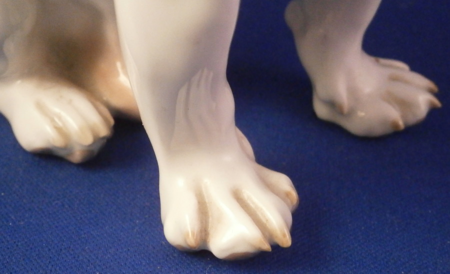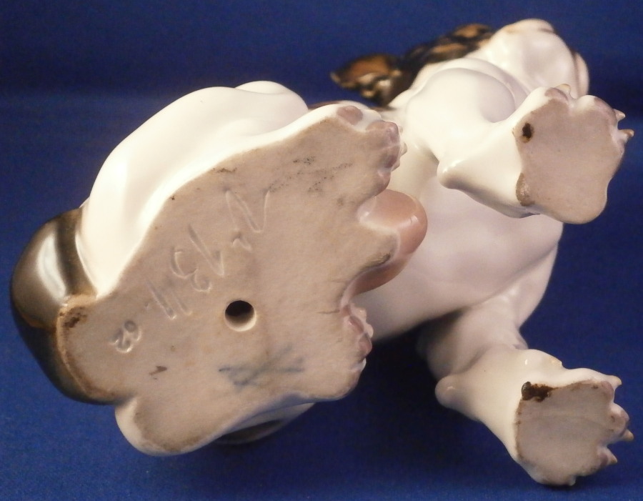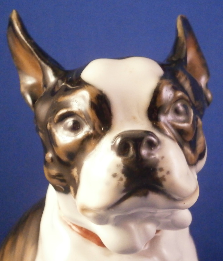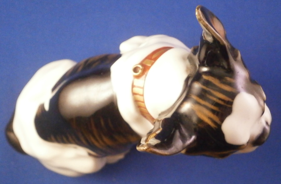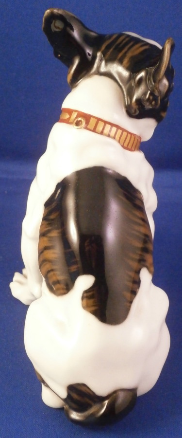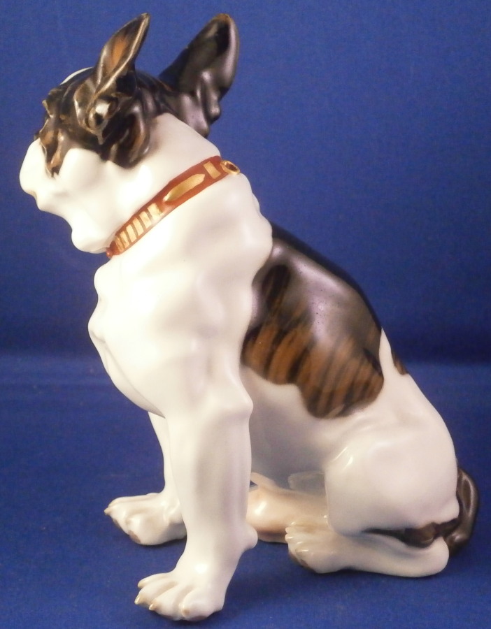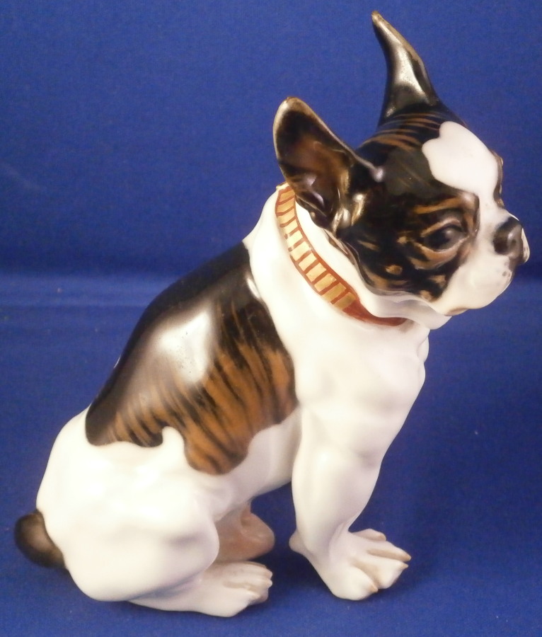 This is a superb figurine of a dog made by Meissen during the Pfeiffer period of the 20th century. I have seen this described both as a Boston terrier pup and a French Bulldog pup and since I suck at dogs I don't which one is true. Either way he is modelled superbly and hand painted to perfection with the rare under glaze colors Meissen used occasionally on these types of figures. A really nice early version fo this model. The colors look quite stunning! The figure was first modeled by Erich Hösel in 1911 I believe. The figurine is in perfect condition which is always nice! It is marked underneath with the under glaze blue crossed swords mark with the dot between the tops as well as the usual impressed / incised marks as shown. The piece is 5.375 inches tall, 2.625 inches wide and 4.5 inches long. Please email me for more information or other pictures.