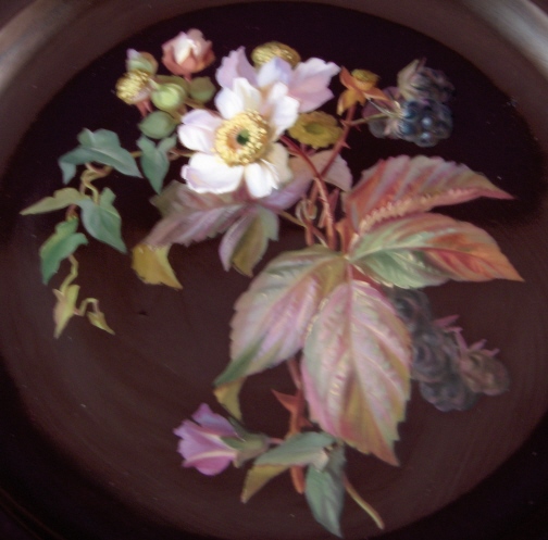 This is an amazing plate made by Meissen in the 19th century. It is a plate decorated by Professor Julius Eduard Braunsdorf who worked at Meissen from 1858 until 1906 and is famous for the most beautiful and real looking flowers at Meissen if not anywhere! Prof. Braunsdorf studied at the Art Academie in Dresden before coming to Meissen and is amoung the most important floral painters ever. This plate is a perfect example of his work and these types of plates are very very rare and hard to find. The entire plate is handpainted with a chocolate / dark brown ground with a blackberry painted in the center that has leaves, blossoms in different stages and fruit and these look real enough to want to grab and eat them. There is also a small ivy plant in the mix which is neat. The nicely shaped rim has three blackberry bud and blossoms in full bloom on it as well as a nice gold trim to the edge. The plate is in perfect condition with the tiniest of wear to the gilding, basically none at all and one small spot of wear in the brown ground but the white does not come through. It is marked with underglaze blue crossed swords mark underneath as well as an impressed 3. This beauty is 1.125 inches tall and 8.125 inches in diameter. Please email me for more information or other pictures.