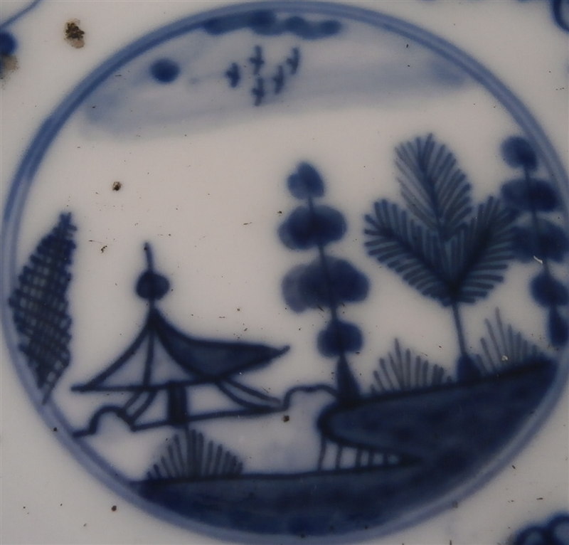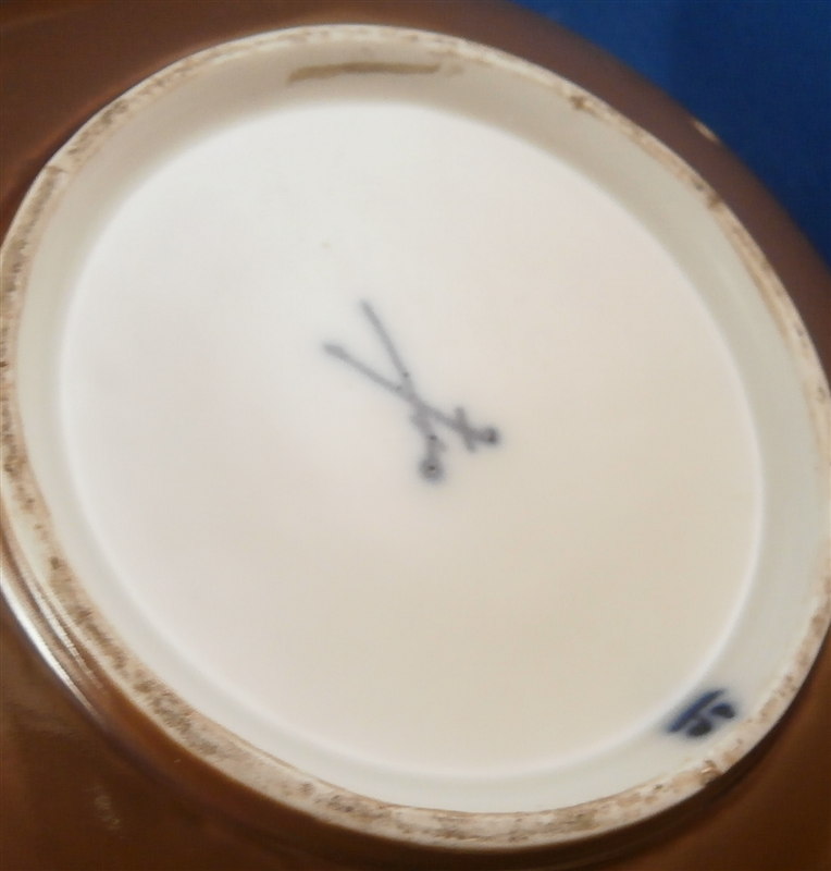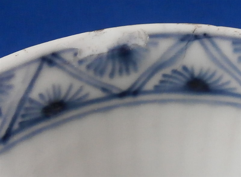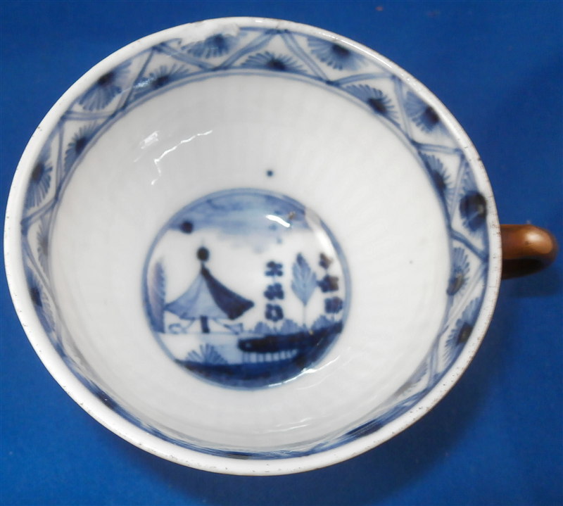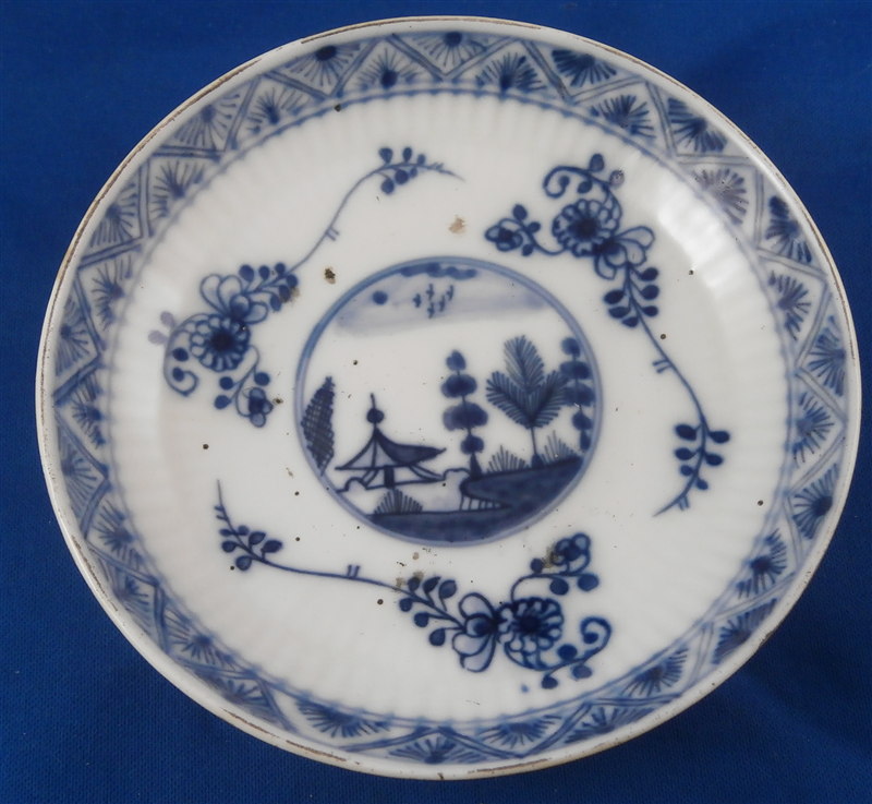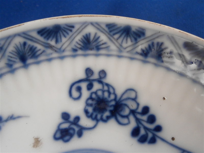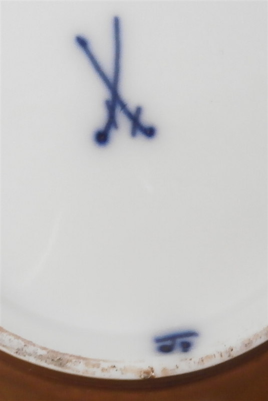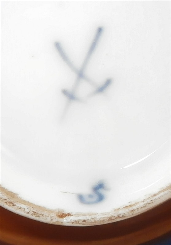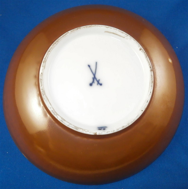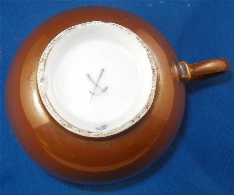This is a rare cup and saucer made by Meissen in the mid 18th century around 1740. Both the cup and saucer have a handpainted underglaze blue design related to the strawflower design with an addition of a scene in the center including buildings and plants. They both have the ribbed design to the paste that looks really nice plus the bonus of the brown color on the outside / underside one rarely sees. All in all a superb set! The cup and saucer are in good condition with some glaze missed on the saucer that are not unusual on the very early pieces and a chip to the top rim of the cup mostly to the inside as shown. The saucer is 1.25 inches tall and 5.125 inches in diameter. The cup is 1.875 inches tall and 3 inches in diameter. Both pieces are marked with the underglaze blue crossed swords mark with the one on the cup looking very early and the one on the saucer almost 19th century (which it is not) Both also ahve the blue painter's mark which one only sees on the early pieces. Also blue painters mark to the footring and hard to see incised marks. Please email me for more information or other pictures.