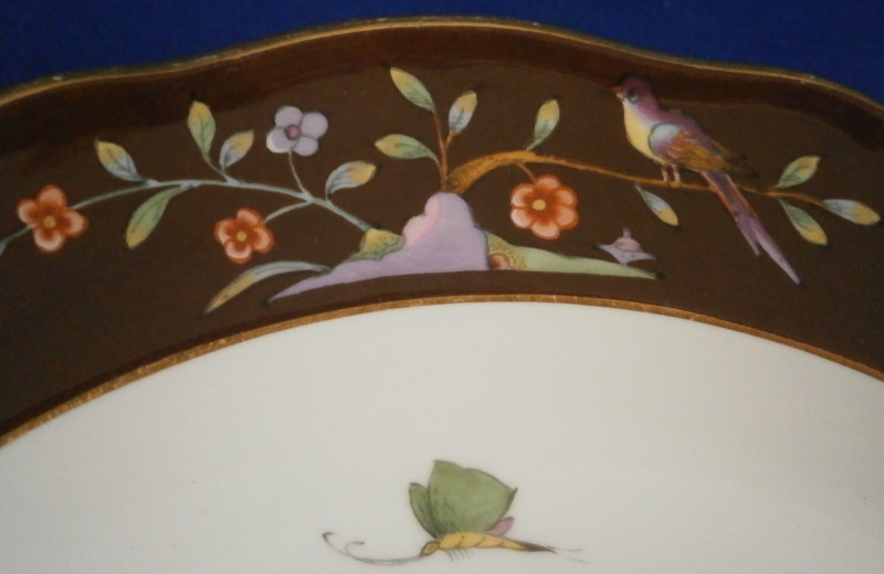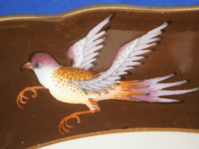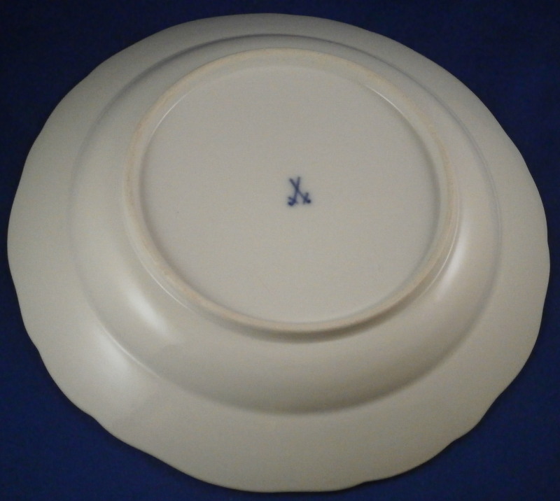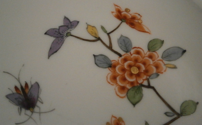 This is a plate made by Meissen in the late 19th century. It is hand painted with superb detail in the 18th century Kakiemon style with a polychrome design on white ground in the center and some more flowers and birds on brown ground on the rim. Simple gold trim on the nicely shaped edge. Lots of birds, flowers and insects all over the plate which looks stunning. The piece is in great condition with some minor use marks but it displays perfectly. It is marked with the underglaze blue crossed swords mark underneath as well as the usual impressed numbers one finds on Meissen of this period. The plate is 1.25 inches tall and 8.25 inches in diameter. Please email me for more information or other pictures.