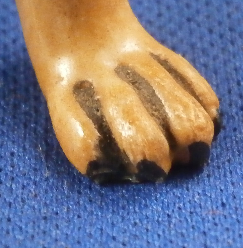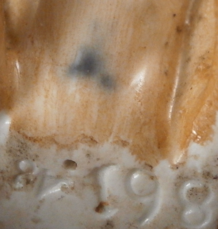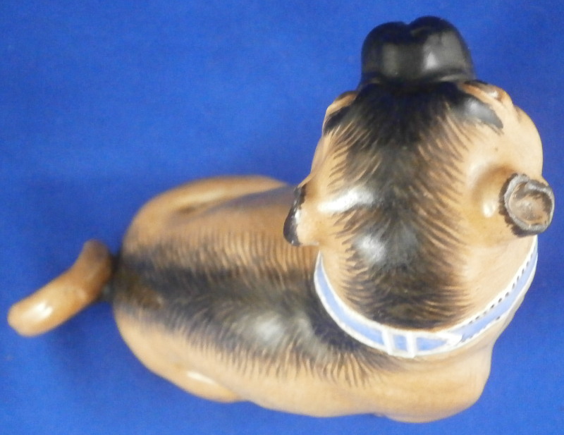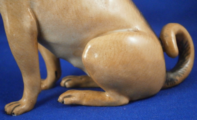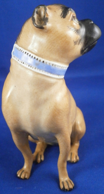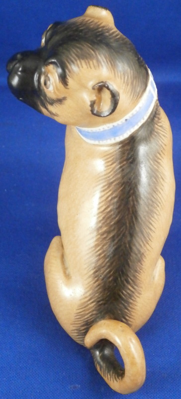 This is a figurine of a female pug dog made by Meissen in the mid 19th century. The nicely modeled and hand painted brown version with black going down the center and around the face and ears. Simple blue collar as opposed to the often seen collar with gold bells. Really well done and earlier than most one sees so that's nice. The figure is in great condition with a tiny chip to the right toe on the left front paw but since it is colored it might have been made this way. It's really tiny if it is a chip. You have to feel it to find and he displays perfectly! The piece is marked with the blue swords that are a bit hard to see under the brown paint but he also has the typical impressed marks - model number r98 I believe and impressed number 48. First choice off course. She is 4 inches tall, 3.5 inches long and 1.75 inches wide. Please email me for more information or other pictures.