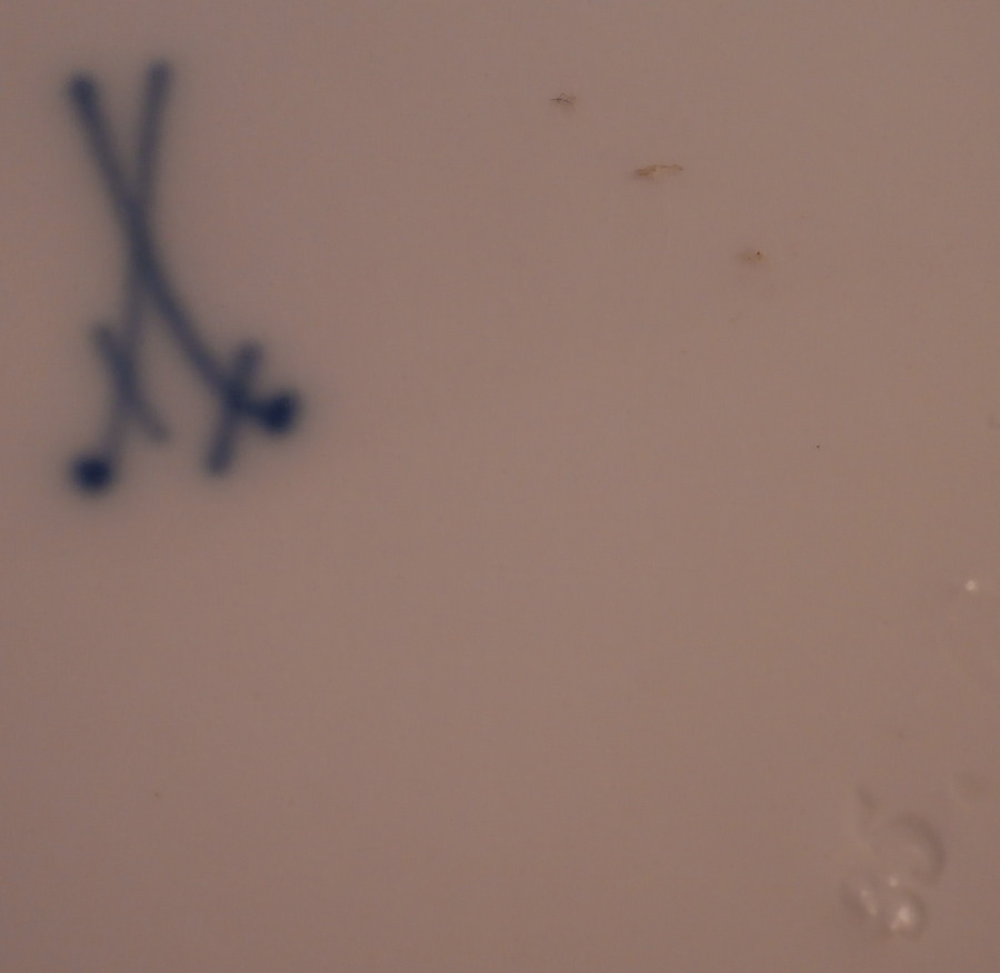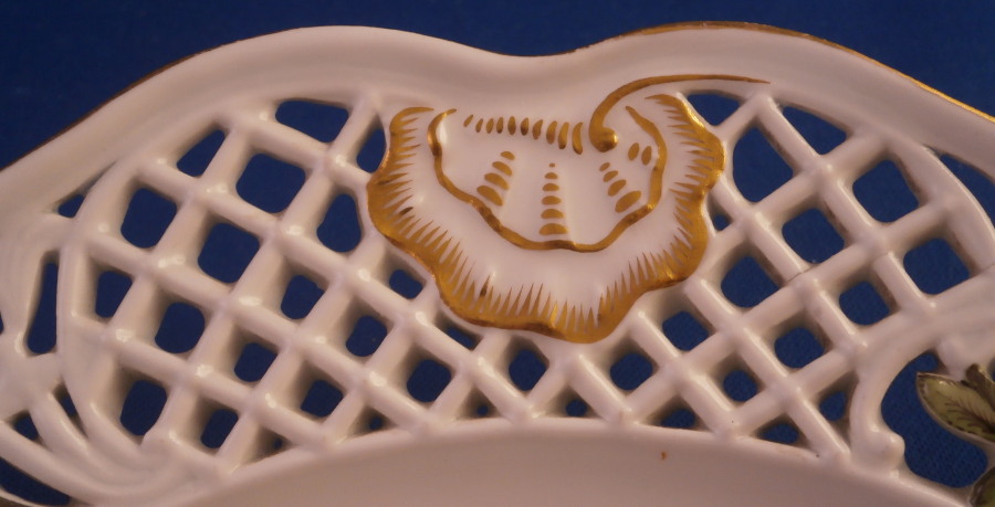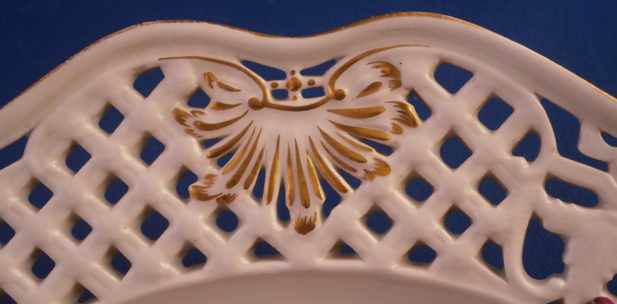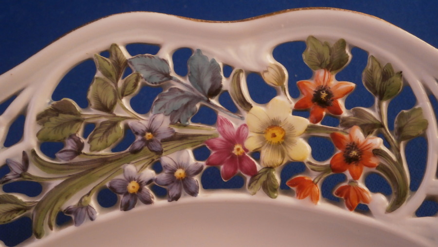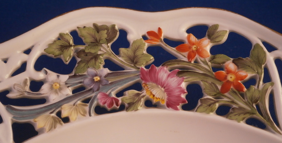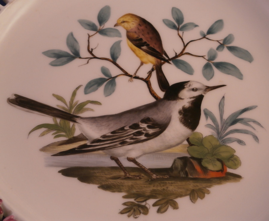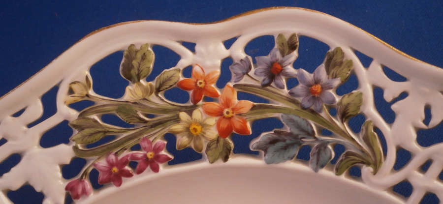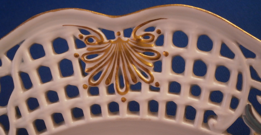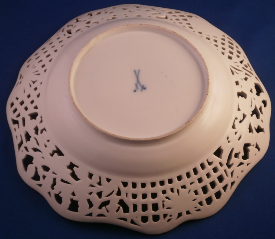 The porcelain superb plate was made by Meissen in the mid 19th century. It has a rim design called Brühlsches Allerei which includes the very fancy reticulated rim with lots of hand painted flowers and gold highlights which gives it its name. Each reticulated area is different with three that are more plain with just a touch of gilding and three more that are in the shape of a floral arrangement with each flower hand painted perfectly! The center has a large hand painted bird scene in it including two birds in a little landscape surrounding. One more often sees jsut flwoers or even fruit but the bird scene is extra nice! The Bruehlsches Allerlei design is one of the nicest rim designs one can own by Meissen - it was originally made for Count von Bruehl . The edge has a gold trim to it. The plate is in greatt condition with an area of the foot ring having been restored which does not affect the plate at all. Minor touch of wear to the gilding on the edge. It is marked with the under glaze blue crossed swords mark as well as the usual impressed numbers one find on Meissen of this period as shown. The plate is 1.75 inches tall and 9.875 inches in diameter which is a very nice size.