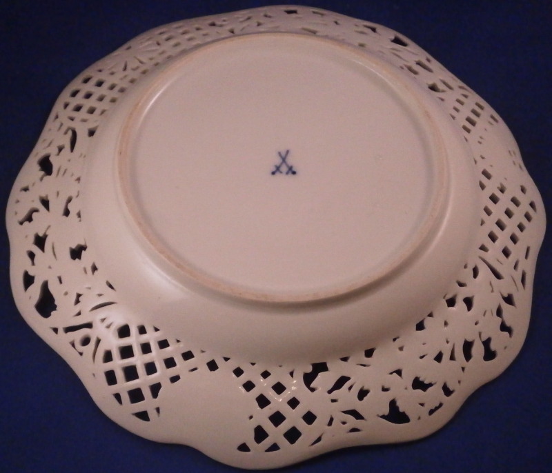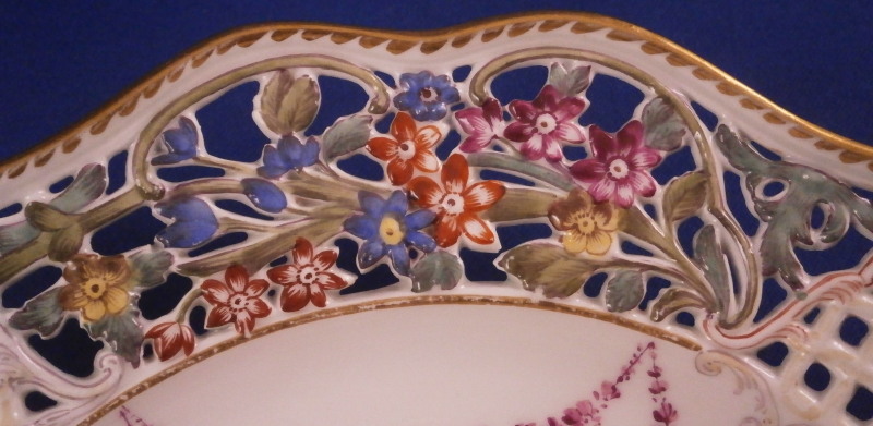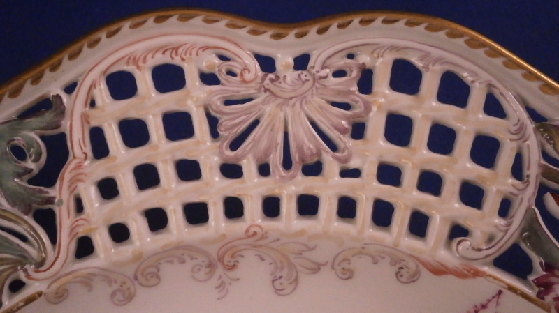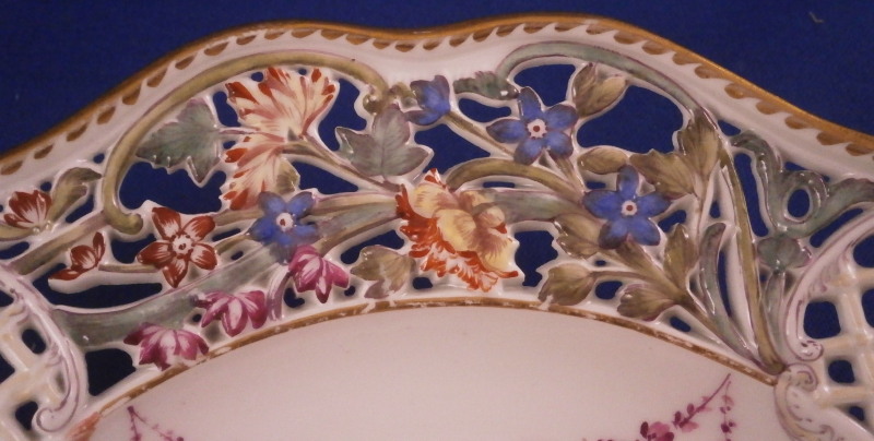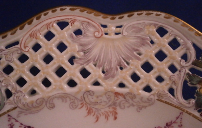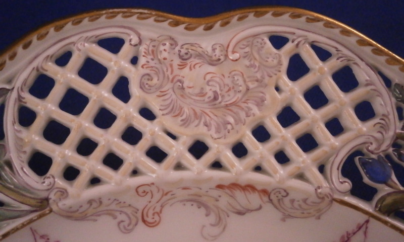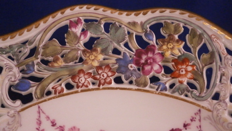 This is a superb plate made by Meissen in the mid 19th century. The plate has a rim design called Brühlsches Allerei which includes a hand painted puce floral arrangement in the center as well as puce floral swags / garlands along the well edge and a very fancy reticulated rim with lots of flowers. The unusual part are the puce flowers and the parts that are usually left mainly white in between the colorful flower sections of the rim are painted with a light yellow, purple and oorange decoration. A bit of gold trim to the edge makes this a very stunning plate! Each reticulated area is different with three that are in the shape of a floral arrangement with each flower hand painted perfectly! The Bruehlsches Allerlei design is one of the nicest rim designs one can own by Meissen - it was originally made for Count von Bruehl - hence the name. The plate is in superb condition which is always a bonus. Just a touch of wear to the gilding (very minor!). It is marked with the under glaze blue crossed swords mark as shown and the usual impressed marks, etc. one finds on Meissen of this period. The plate is 1.625 inches tall and 9 inches in diameter. Please email me for more information or other pictures.