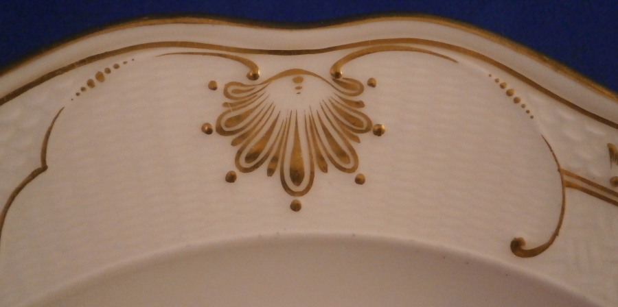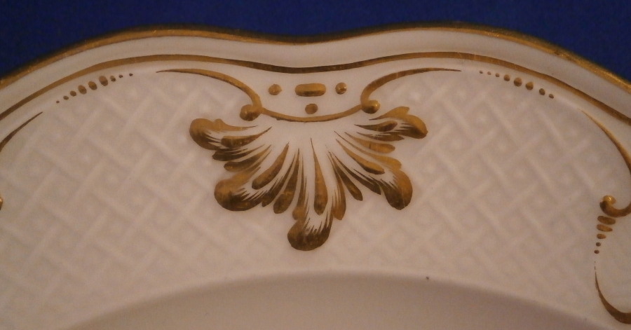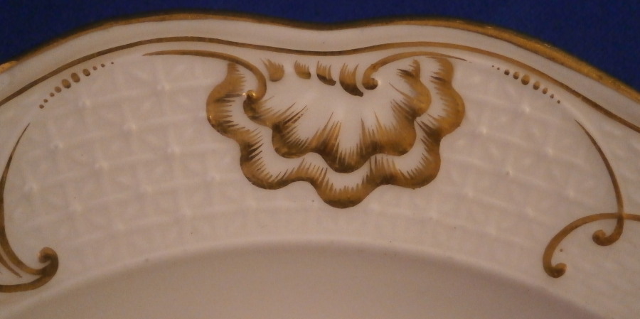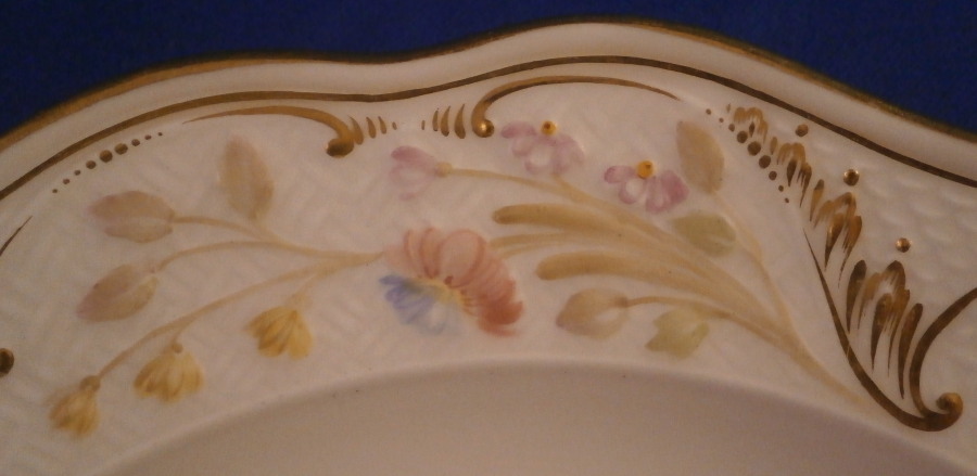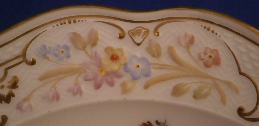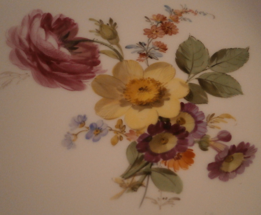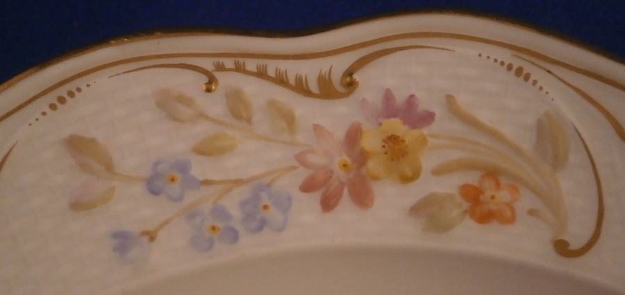 This is a really fun porcelain plate was made by Meissen in the mid to later 19th century. It has a rim design very similar to the typical Brühlsches Allerei except it is not reticulated at all. I think it looks nice and is more practical for use than the one with all the cutouts. The design includes three panels of hand painted relief flowers surrounded with a relief patterns to the white paste and some gold trim. Each relief pattern around the flowers is different! In between the floral panels are three panels with a relief gilded design to it again surrounded with a relief design to the white paste and some smaller design in between the panels. Quite fancy and the rim looks amazing! The center has a large hand painted floral arrangement to it as well as three small single flowers. Nicely shaped edge with gold trim to it. A stunning looking plate and not one you'll see to often again! The plate is in perfect condition. It is marked with the under glaze blue crossed swords mark as well as the usual impressed numbers one find on Meissen of this period as shown and a red painter's mark. The plate is 1.125 inches tall and 8.75 inches in diameter which is a very nice size. I have a few more in this style on the site if you'd like a pair or more. If you have any questions just send me an email!