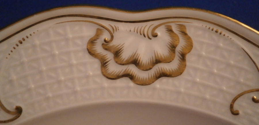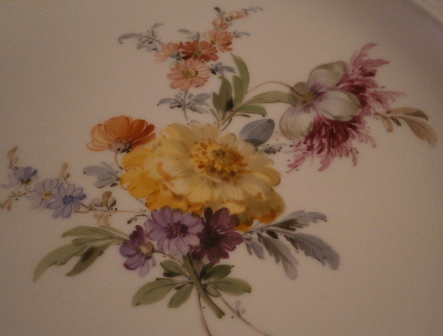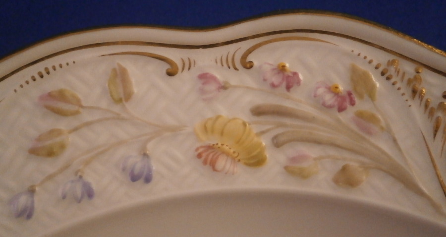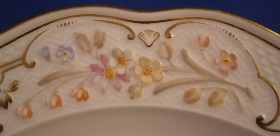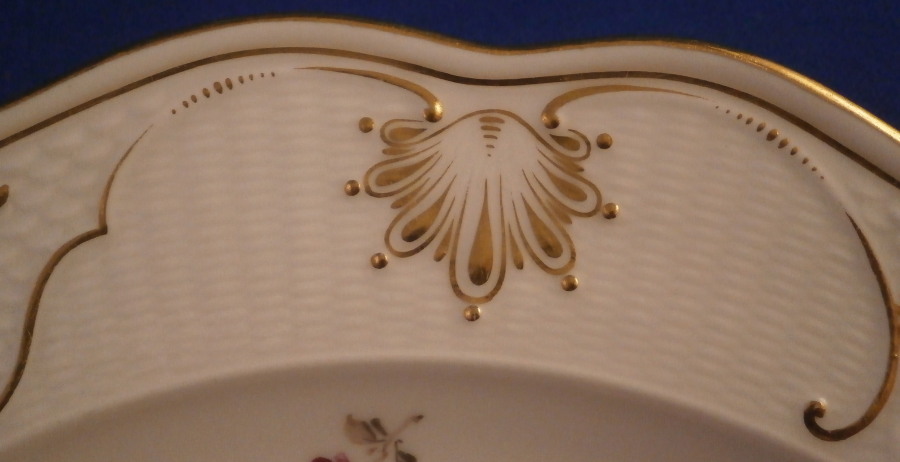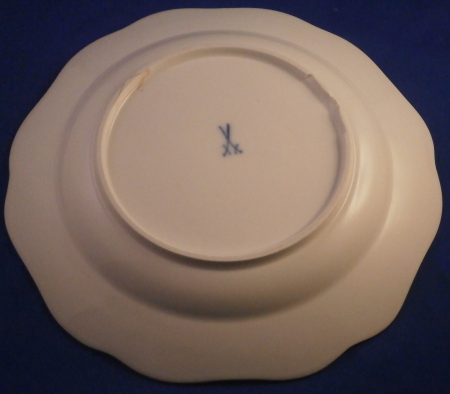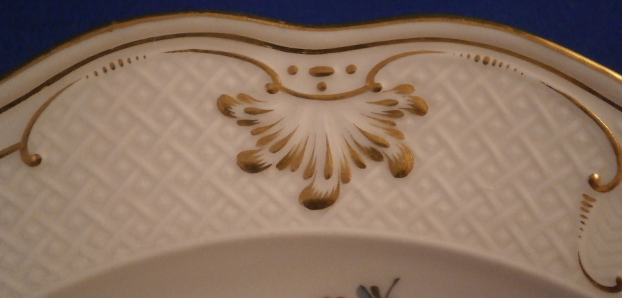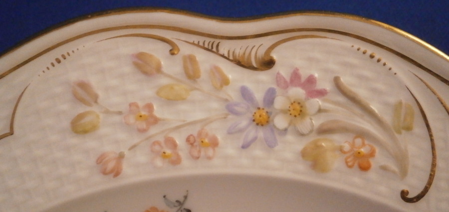 This is a really fun porcelain plate was made by Meissen in the mid to later 19th century. It has a rim design very similar to the typical Brühlsches Allerei except it is not reticulated at all. I think it looks nice and is more practical for use than the one with all the cutouts. The design includes three panels of hand painted relief flowers surrounded with a relief patterns to the white paste and some gold trim. Each relief pattern around the flowers is different! In between the floral panels are three panels with a relief gilded design to it again surrounded with a relief design to the white paste and some smaller design in between the panels. Quite fancy and the rim looks amazing! The center has a large hand painted floral arrangement to it as well as three small single flowers. Nicely shaped edge with gold trim to it. A stunning looking plate and not one you'll see to often again! The plate displays perfectly but has an almost chip to the foot ring as well as an area of the foot ring with chips as shown. It is marked with the under glaze blue crossed swords mark as well as the usual impressed numbers one find on Meissen of this period as shown. The plate is 1.125 inches tall and 8.5 inches in diameter which is a very nice size. I have a few more in this style on the site if you'd like a pair or more. If you have any questions just send me an email!