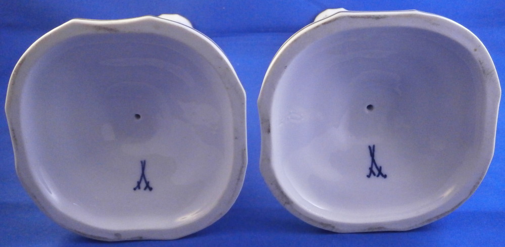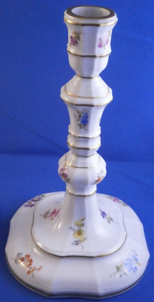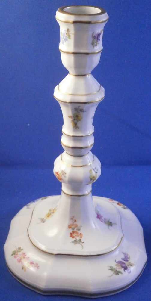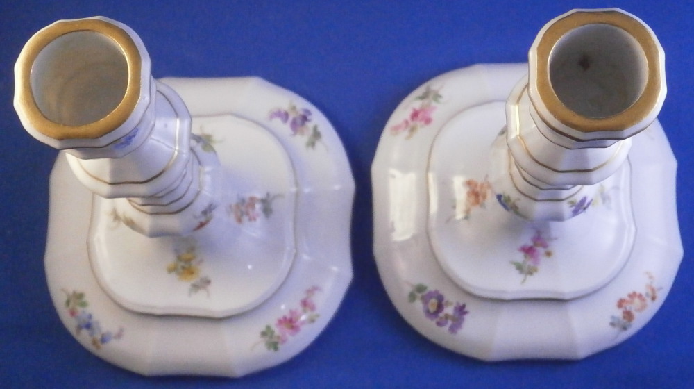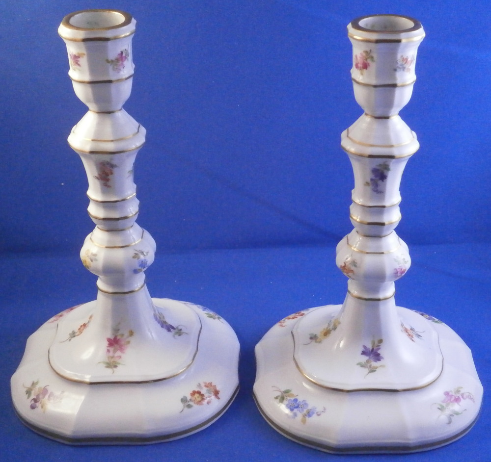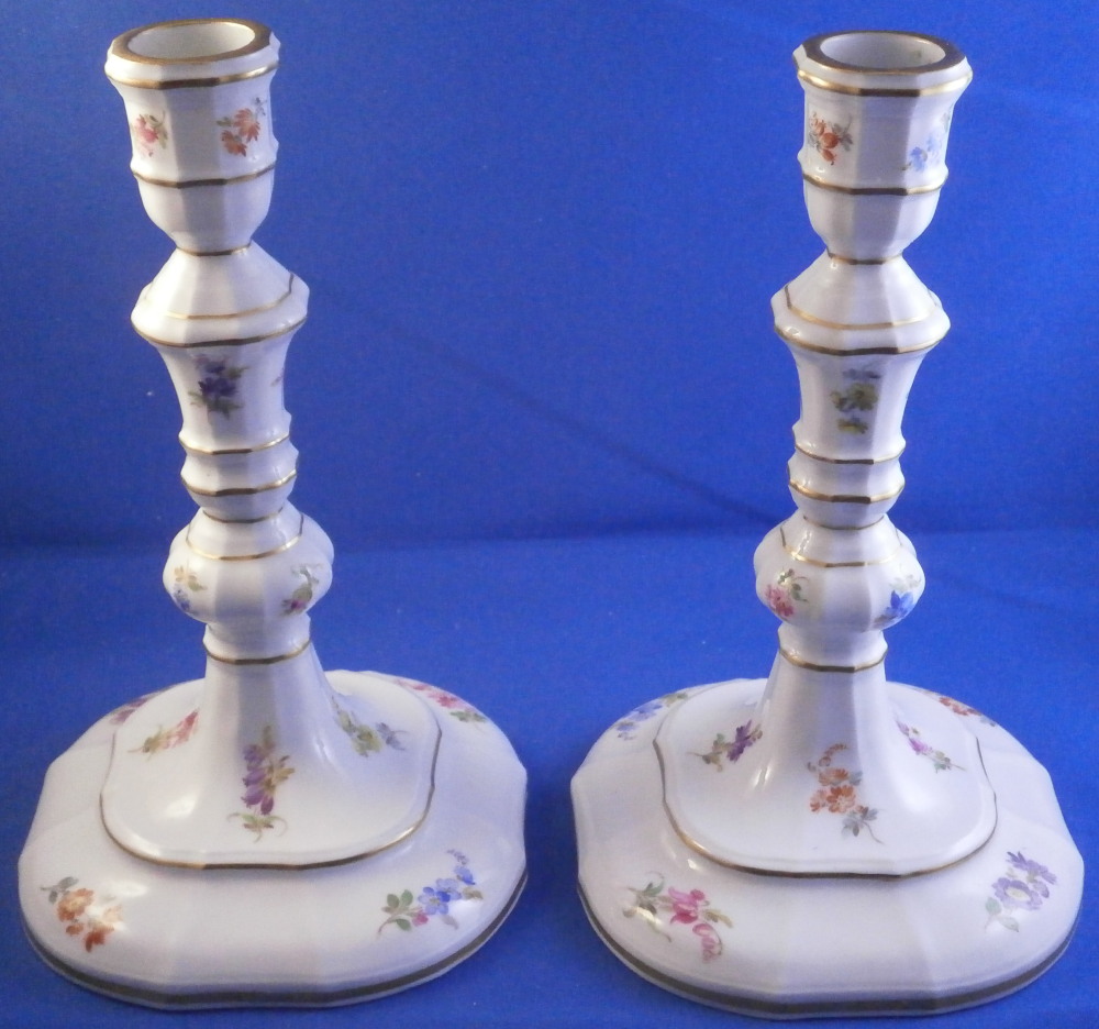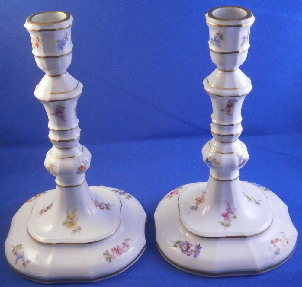This is a nice pair of candlesticks made by Meissen in the 19th century. They are decorated with their famous strewn / scattered flowers design which is a commonly found decoration btu I ahve not seen a pair of nice candleholders in this design! They have a nice shape to them with a wide base so they are very stable. The hand painted single flowers all around in combination with the shape and gold trim make this a very elegant looking set! Each stick is about 7.25 inches tall with a bottom diameter of 4.75 inches. The top where the candle goes into has an inner diameter of 0.875 inches and is a good 1.25 inches deep. They are in perfect condition with the tiniest of gold wear but they display perfectly! Each candlestick is marked underneath with the under glaze blue crossed swords mark and the usual incised / impressed marks as shown. Please email me for more information or other pictures.