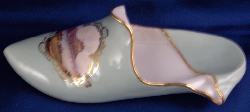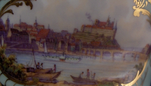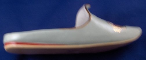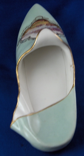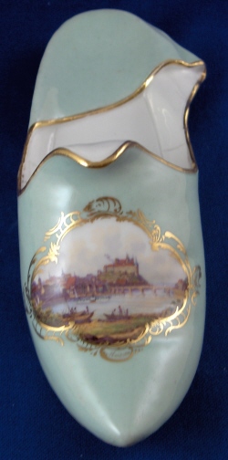 This is a superb and fun piece of porcelain made by Meissen in the mid to late 19th century. It is in the form of a shoe / slipper which is handpainted very nicely with a turquoise ground color, a nice gold trim, a red trim by the soles and the best part - it has a superb handpainted scenes of the Albrechtsburg aka the castle where Meissen and the whole history of European porcelain started. The scene is extremely detailed and has a nice fancy gold trim around it. The scene has the castle in the background, the river in the middle with some boats in the front and even a steam boat which kind of dates the pieces quite nicely! The shoe is in perfect condition with a little wear to the underside and a firing spot on the right side inside. It is nice that this is the largest version of the shoe being 2.125 inches tall, 6.75 inches long and 2.5 inches wide. It is marked underneath with the underglaze blue crossed swords mark as shown. Please email me for more information or other pictures.