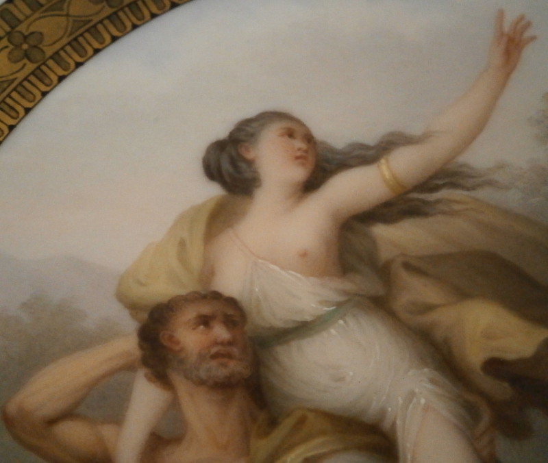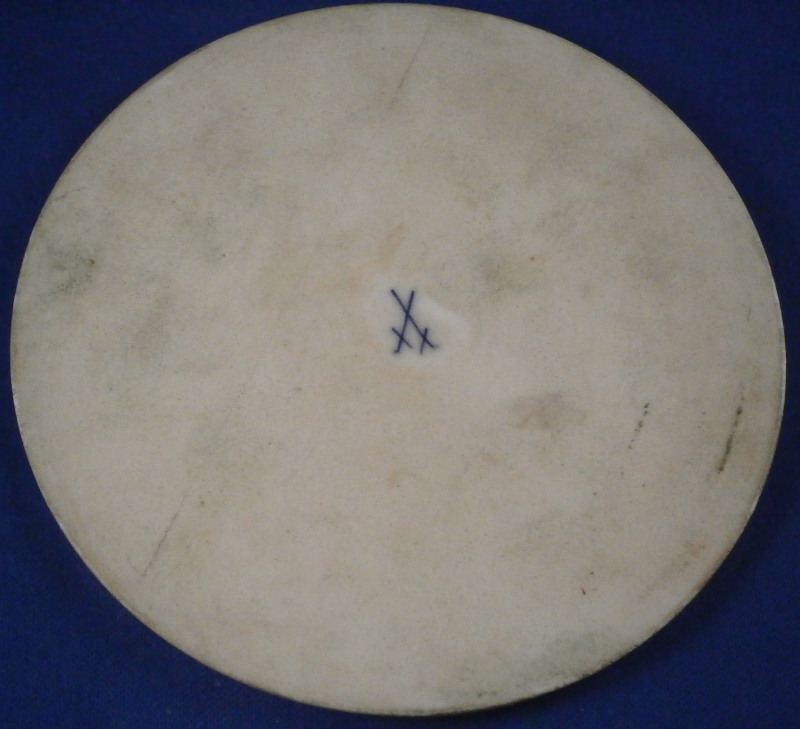This is an amazing round scenic plaque made by Meissen in the late 19th century. It is a true plaque with the sides glazed and not the center of a plate that was cut out or something like that. Quite rare to see plaques by them! It is hand painted with a top quality scene in the center of a centaur and a nymph (code for nude lady). The centaur is carrying the nymph into the water away from possibly cupid trying to shoot an arrow in the background. Nice landscape including trees and mountains. The scene is surrounded by a fancy black and gold trim that makes this a very elegant and stunning piece to look at. Probably made as an insert into a piece of furniture since there is still a white ring around the edge that would have been covered by the frame. The plaque is in perfect condition - it needs a new frame but that is easy enough and should be done by the buyer in their taste. The plaque is 4.75 inches in diameter. It is marked with the blue crossed swords mark (first choice). A rare find and a must have for the collector! I also have a matching second plaque if anyone is interested in a pair. Please email me for more information or photos.