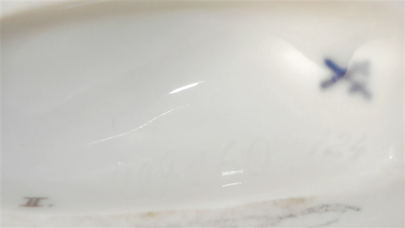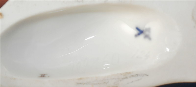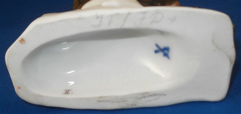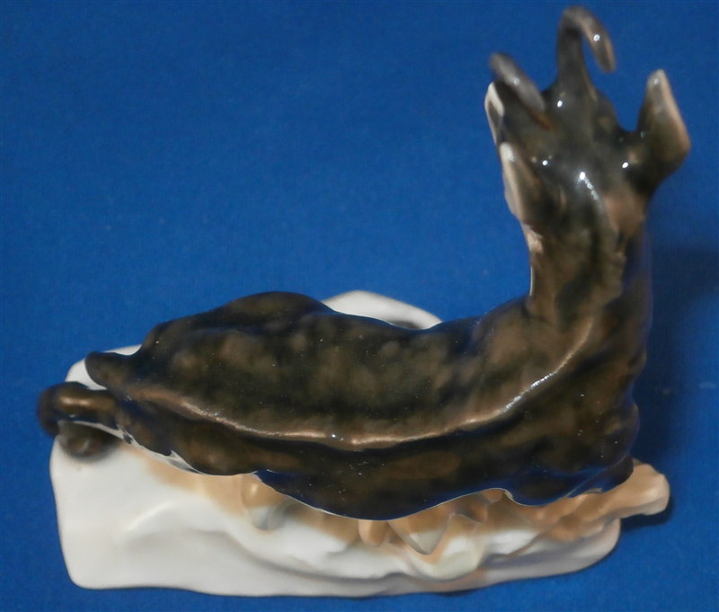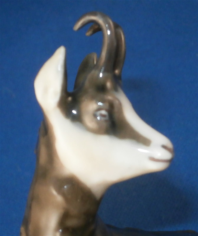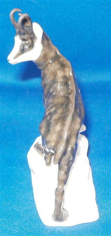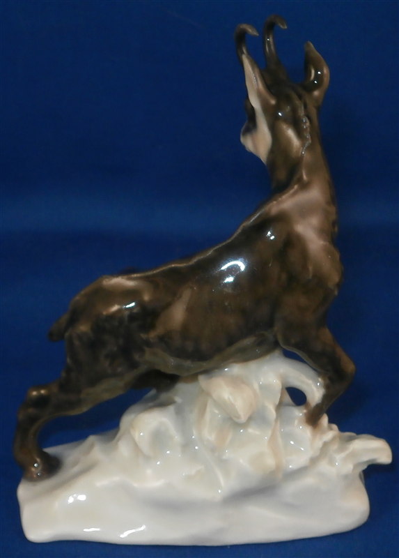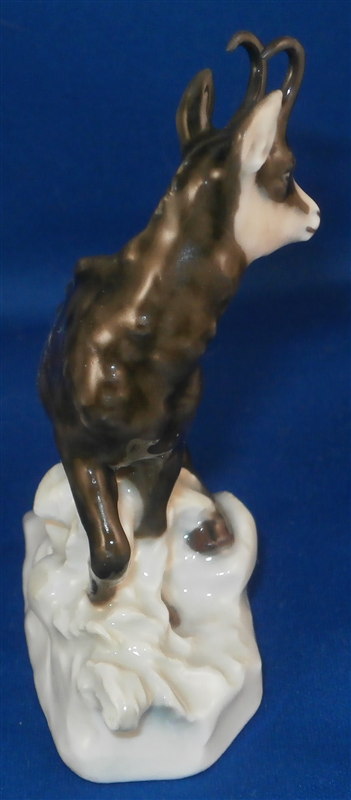 This is a superb figurine of a Chamois a sort of goat antelope made by Meissen in the 20th century. Not a piece I have seen before and quite nicely modeled and painted to be easily recognizable. The piece is in perfect condition which is nice since the horns looks very fragile! The figure is 3.75 inches tall, 1.375 inches wide and 3.125 inches long. The piece is marked underneath with the underglaze blue crossed swords mark as well as the usual impressed numbers and a black Roman numeral II. Please email me for more information or other pictures.