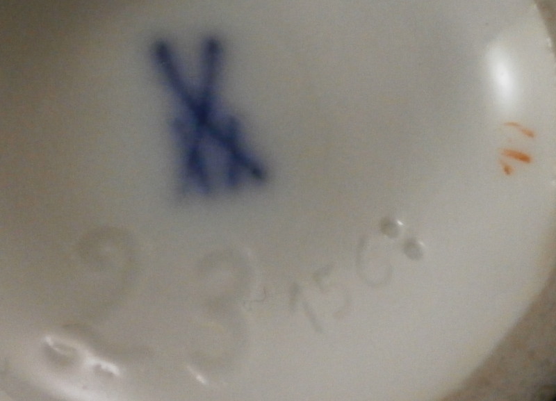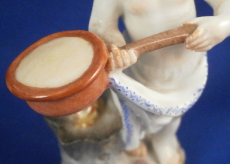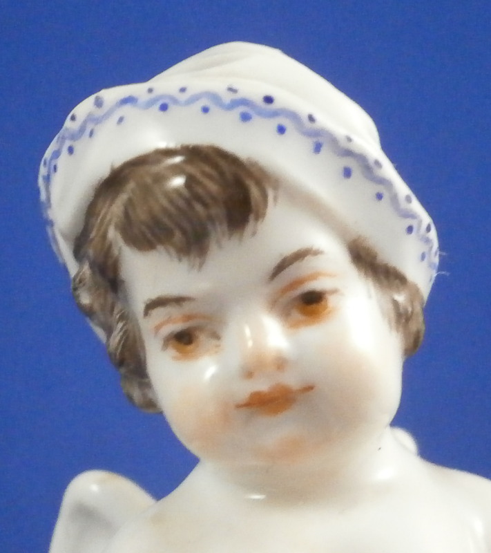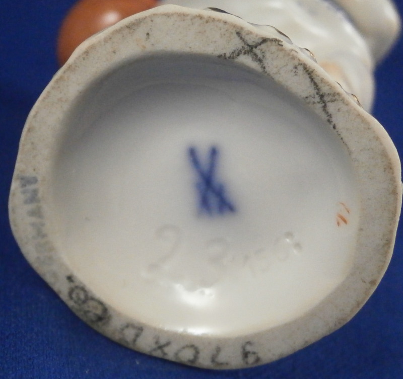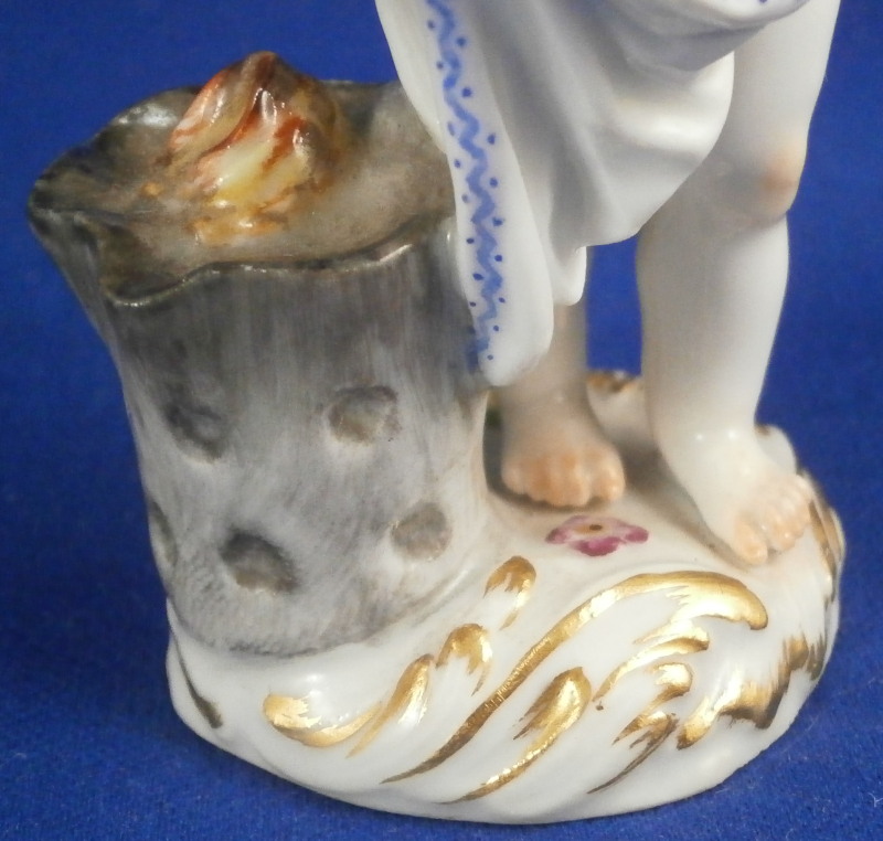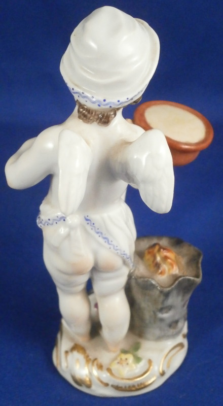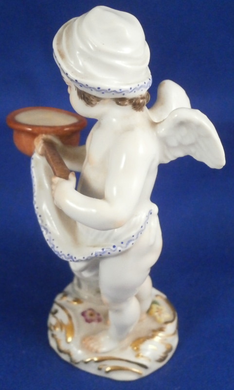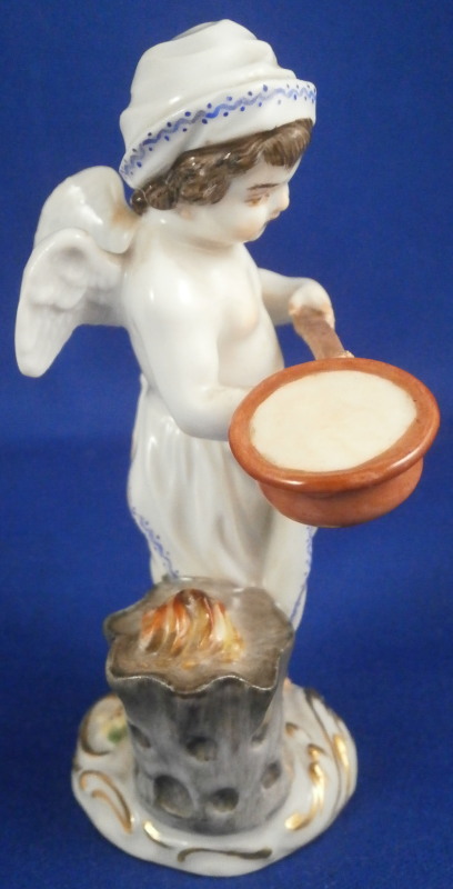 This is a figurine of a cherub made by Meissen in the 20th century. It is of Amor / Cupid / Eros in disguise as a chef with a pot in his hands and a fire by his side. The figure is standing on a nice base with some gold scroll work all around. Very nicely modeled and hand painted as one would expect from the top maker. The figurine is in perfect condition. and is 3.75 inches tall, 2 inches wide and 1.5 inches deep. The figure is marked with the under glaze crossed swords mark underneath the base as well as the usual impressed numbers, a painter's number in red and the word GERMANY along the base as shown. Please email me for more information or other pictures.