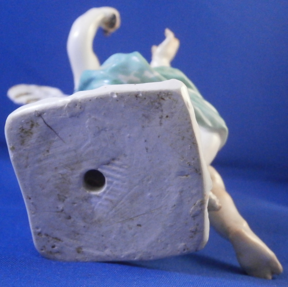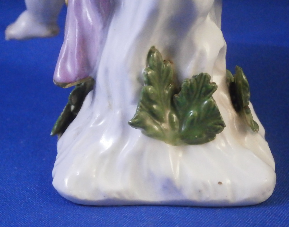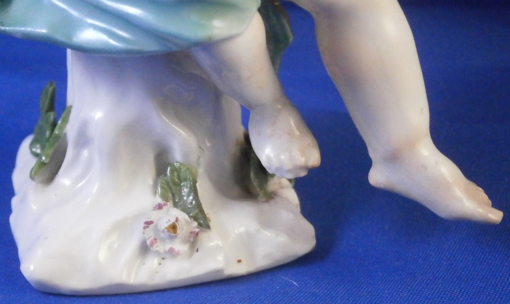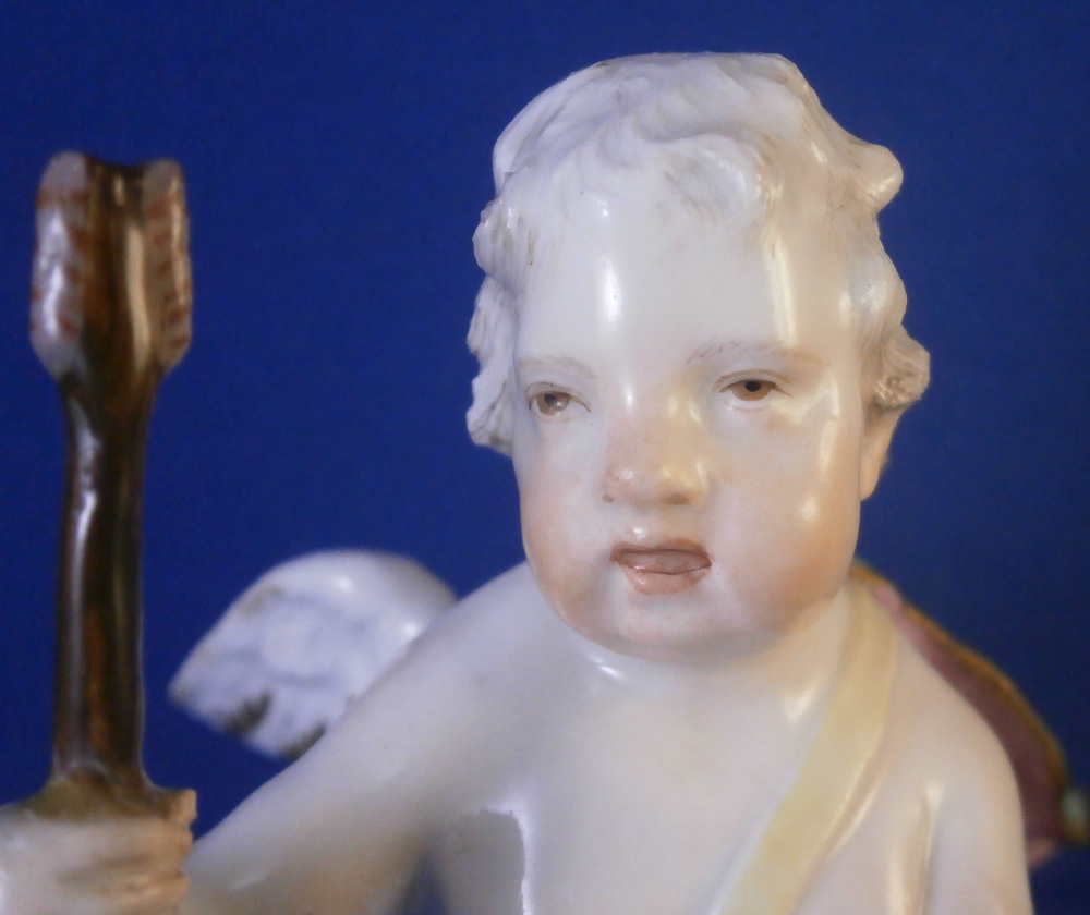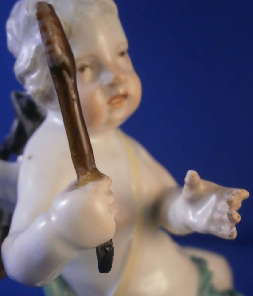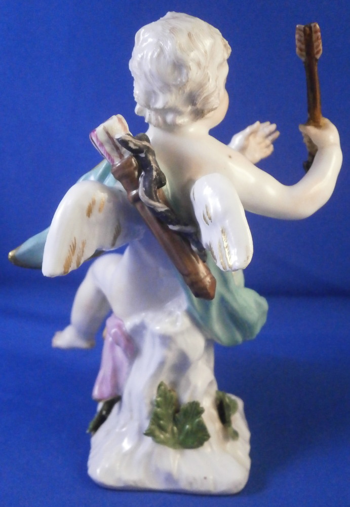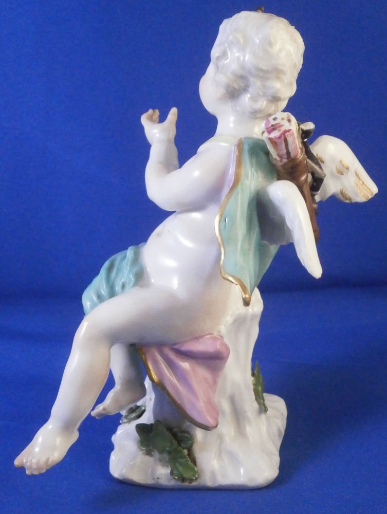 This is a figurine of a cherub / angel / Amor / Cupid made by Meissen in the mid 18th century or about 1750. Cupid is sitting on tree stump that forms the base and has some leaves and a flower attached as decoration. Cupid has a turquoise cloth around his mid section and is holding an arrow in his left hand with a quiver and bow in the back. These early figurines are amazingly modeled and hand painted. I wish they still made them this way today! The figure is in great condition with a restoration to the arrow and thenit broke above the hand again and was reglued. The bow is missing to the top end, the big toe of the left foot has been perfectly restored and some of the leaves are chipped. All in all as nice as they come, Wings, etc. are fine. The bottom of the base is flat and filled with only the air hole in it. Marked with the small blue crossed swords to the bottom back of the base. The figurine is 4.5 inches tall, 2.75 inches wide and 3.25 inches deep. Please email me for more information or other pictures.