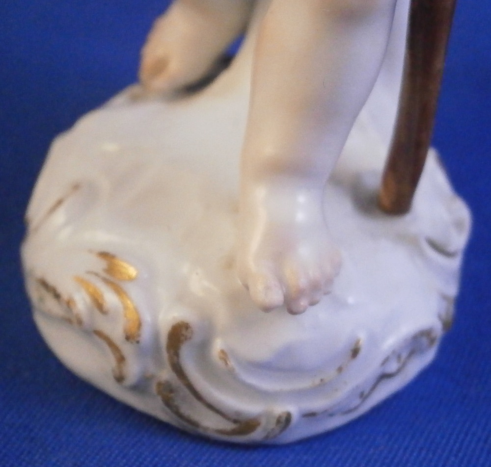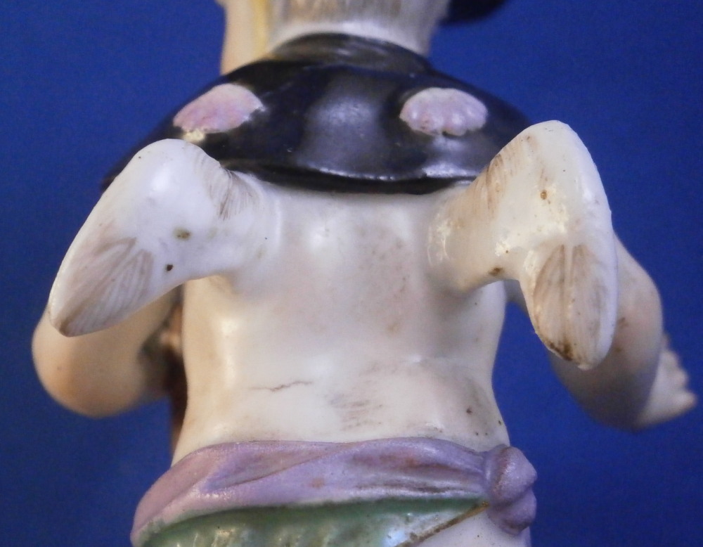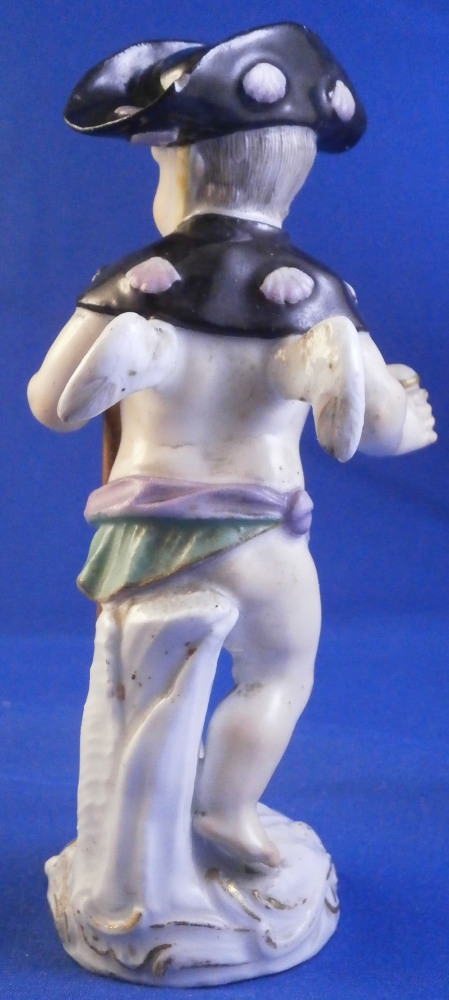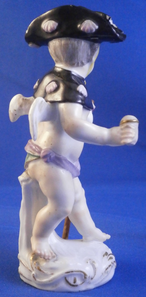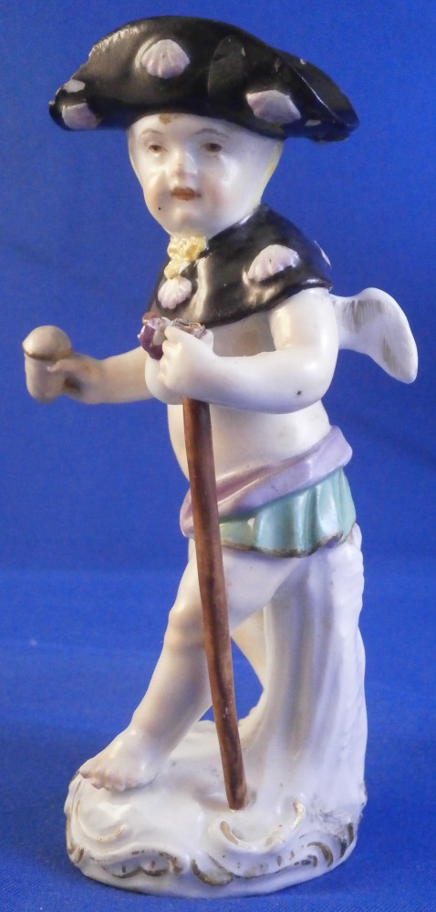 This is a great little figurine made by Meissen in about 1760. From the Amor / Cupid in disguise series - a cherub meant to be a pilgrim / wanderer with his walking stick. Oddly enough this one comes in different versions with the walking stick in the opposite hand sometimes. There are about 80 of these figures made by Kaendler / Acier all of cupids in different occupations. A really nice little figurine! A little later than the original 1750s pieces but still early and quite nice. He is wearing a black hat and collar with pink shell designs attached to it, a yellow little bow to the front of his neck, a walking stick and pouch in his left hand and a container with a slit in it in his right hand. Maybe for begging? Wings to the back nicely painted with feathers and a typical base with scrolls all around highlighted with gilding. A really nice figurine that is in good condition with some chips to his hat as shown as well as the top of the walking stick and the putple band of the pouch. Touch of wear but he displays very nicely! The bottom of the base is flat which is typical for these early pieces. Hint of the blue crossed swords mark to the back of the base but impossible to make out. I am ssume it is the one with the dot between the bottom looking at the style. The figurine is 3.875 inches tall, 1.625 inches wide and 1.625 inches deep. Please email me for more information or other pictures.