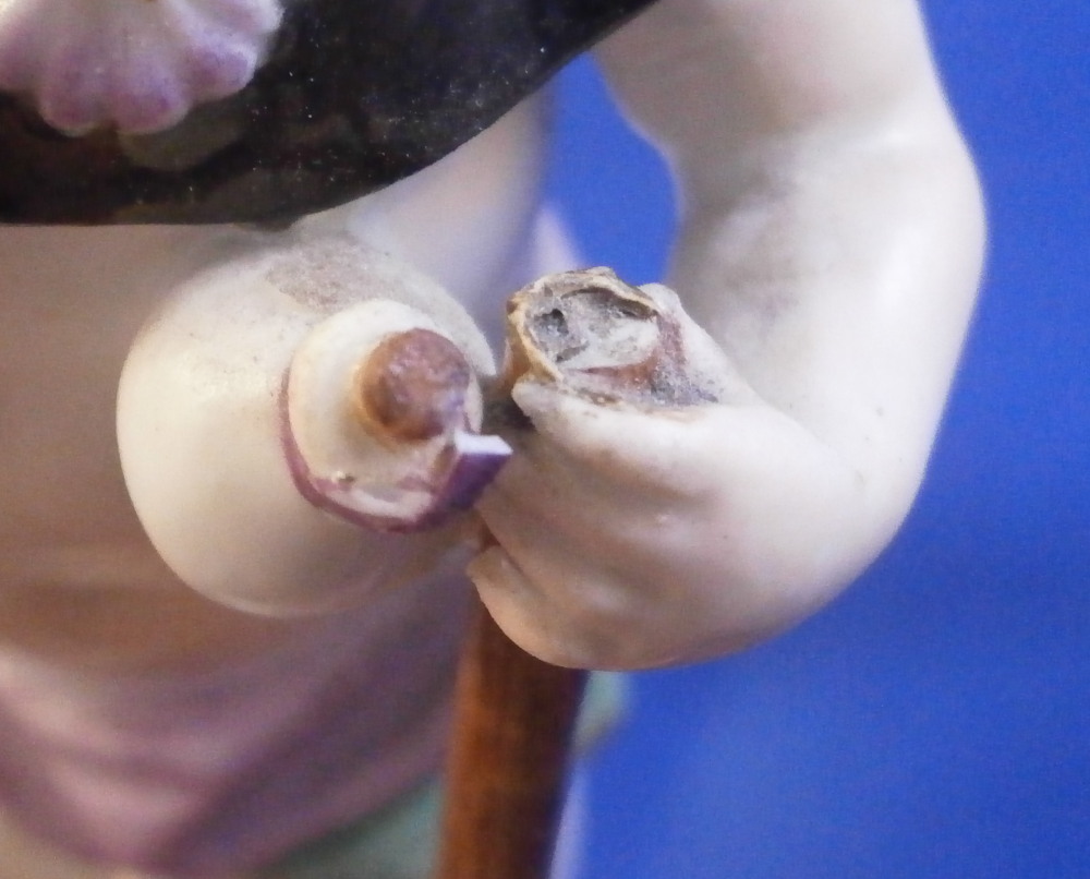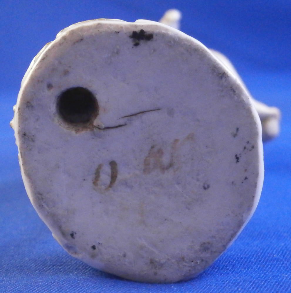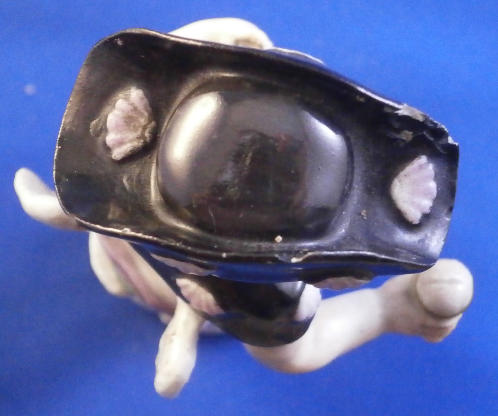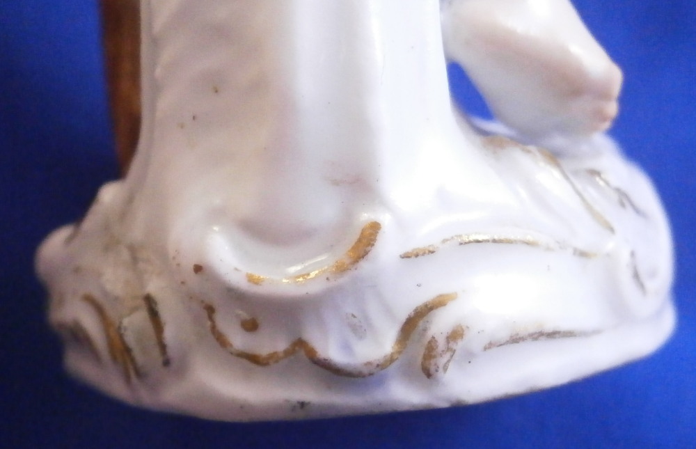 This is a great little figurine made by Meissen in about 1760. From the Amor / Cupid in disguise series - a cherub meant to be a pilgrim / wanderer with his walking stick. Oddly enough this one comes in different versions with the walking stick in the opposite hand sometimes. There are about 80 of these figures made by Kaendler / Acier all of cupids in different occupations. A really nice little figurine! A little later than the original 1750s pieces but still early and quite nice. He is wearing a black hat and collar with pink shell designs attached to it, a yellow little bow to the front of his neck, a walking stick and pouch in his left hand and a container with a slit in it in his right hand. Maybe for begging? Wings to the back nicely painted with feathers and a typical base with scrolls all around highlighted with gilding. A really nice figurine that is in good condition with some chips to his hat as shown as well as the top of the walking stick and the putple band of the pouch. Touch of wear but he displays very nicely! The bottom of the base is flat which is typical for these early pieces. Hint of the blue crossed swords mark to the back of the base but impossible to make out. I am ssume it is the one with the dot between the bottom looking at the style. The figurine is 3.875 inches tall, 1.625 inches wide and 1.625 inches deep. Please email me for more information or other pictures.