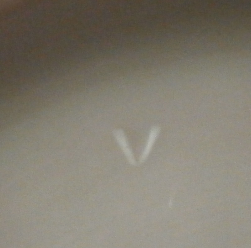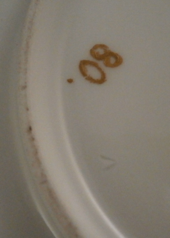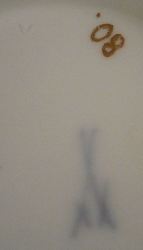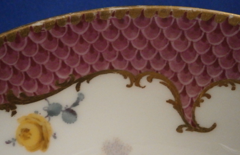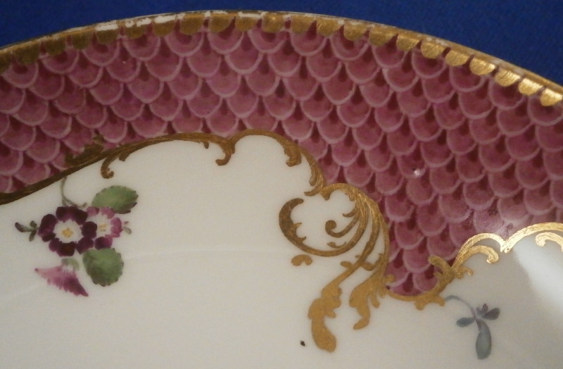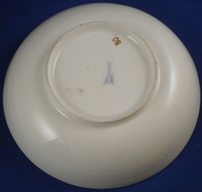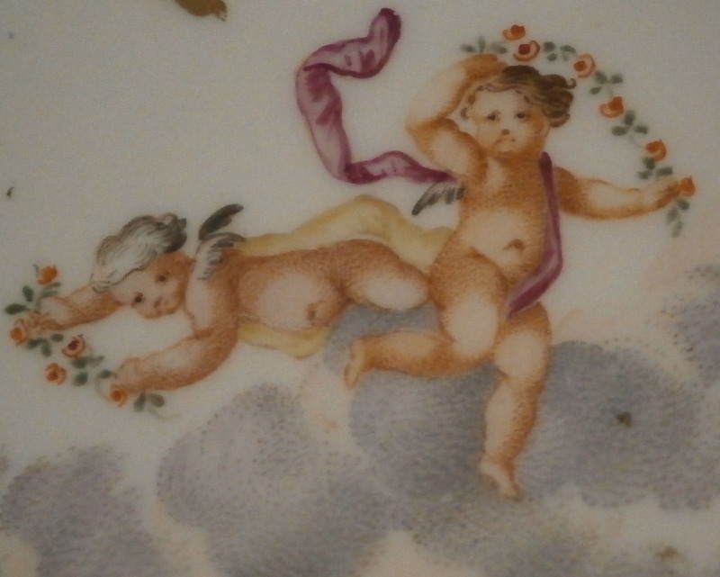 This is a superb saucer made by Meissen in about 1750. It is hand painted with a nice scene in the center of two cherubs / putti frolicking in the clouds but my favorite part is the superb puce scale type trim to the rim with some gilding and a nice scroll work along the bottom edges of the trim. A couple of flowers along the bottom edge of the trim as well. One of the best trims they had and with the quality of the scene this would have been a top piece for this period. Sadly no cup though - but one never knows! The saucer are in perfect condition with some very minor wear to the very edge. It is about 1.25 inches tall and 5.375 inches in diameter and is marked with the underglaze blue crossed swords mark as well as a gilders mark 80. Oddly no impressed number which would normally mean it was made before 1740 but there is a V as shown and it might just be a bad imprint of a 4 or something. Please email me for more information or other pictures.