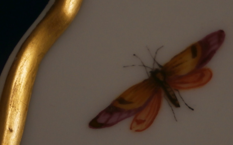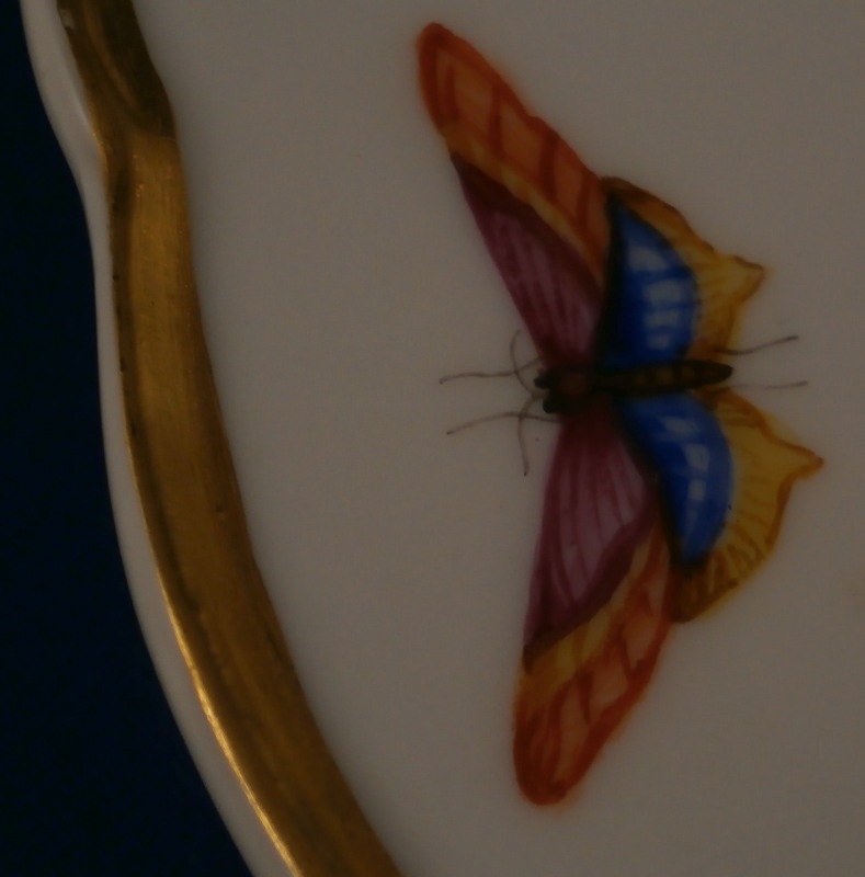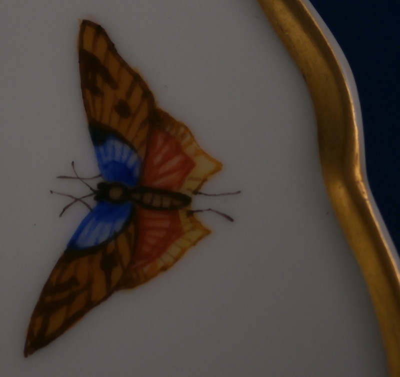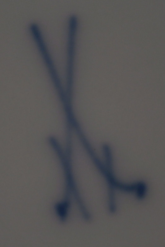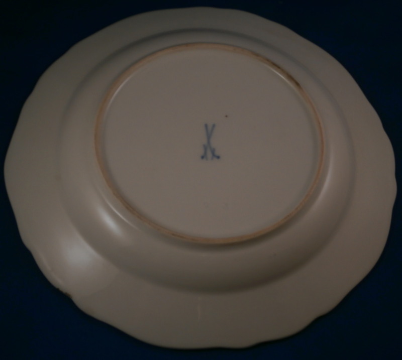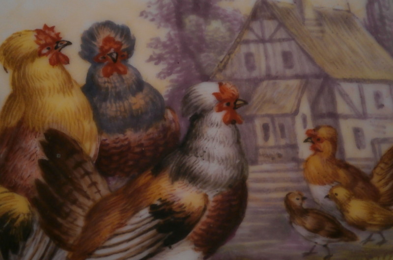 This is a fun plate made by Meissen in the late 19th or early 20th century. It is hand painted with a great scene in the center including three large fancy chicken as well as a hen with two chicks in the background by an old style house in a landscape surrounding. Gold ring around the nicely shaped edge and five butterflys scattered along the rim. One of those makes you happy to look at kind of plates :) The plate is in perfect condition. It is marked with the underglaze blue crossed swords mark underneath as well as two numbers impressed as shown. The plate is 1.125 inches tall and has a diameter of 8.75 inches. Please email me for more information or other pictures.