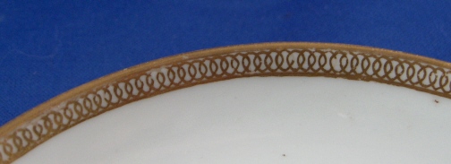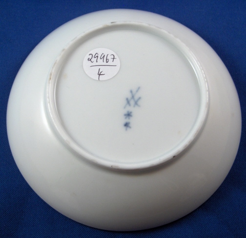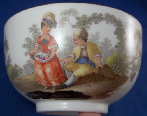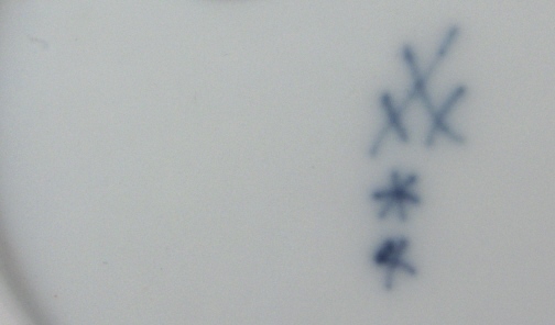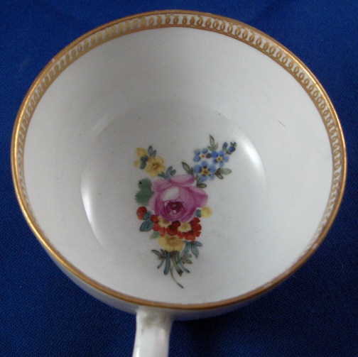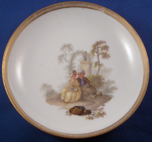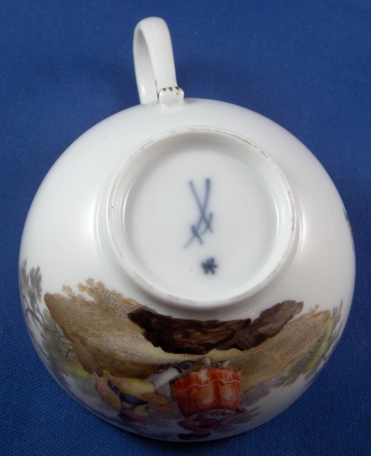 This is a cup and saucer made by Meissen in about 1780. Both the cup and saucer have a handpainted large scene in the center of a couple (their faces look very young) in a landscape surrounding with a nice gold trim at the rim. The cup also has a nice floral arrangement in the bottom inside and two small flowers on the sides by the handle. The cup and saucer are in great condition with a tiny bit of wear to the gold trim. The saucer is about 1.125 inches tall and 5.25 inches in diameter. The cup is 1.75 inch tall and 3.125 inches in diameter. Both pieces are marked with the underglaze blue crossed swords mark with the star between the bottom of the Marcolini period. The saucer also has a number 4 underneath the other mark. Please email me for more information or other pictures.