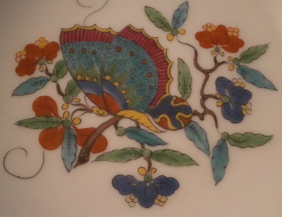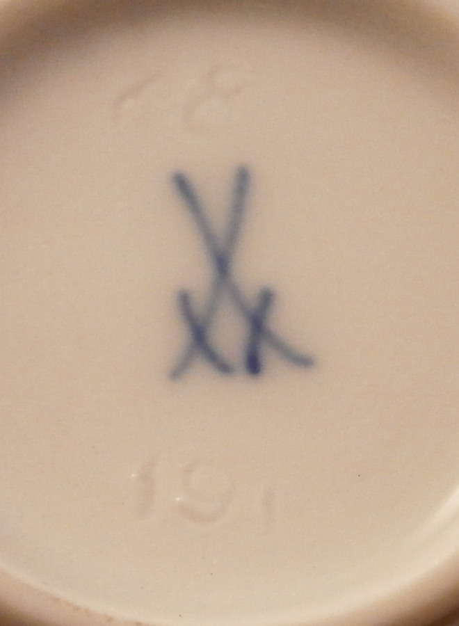 This is a mocha or espresso coffee demitasse cup and saucer made by Meissen in the 20th century. Both pieces are decorated with one of the nicest Kakiemon patterns there is I think. It is called the Chinese Butterfly design. Each piece is hand painted with a nice polychrome butterfly sitting in a colorful plant with more colorful flowers along the rim. There is a light brown trim just under the nicesly shaped edge and an extra flower to the bottom inside of the cup - a sure sign of quality! The handle of the cup is superb as well. This size cup is not easy to find and I like them better than regular sized pieces since they take up less room in the cabinets plus this design is just amazing! The set is in perfect condition which never hurts either :) It is marked with the under glaze blue crossed swords mark underneath (first quality) as well as the usual impressed and painted marks one expects from pieces of this period as shown. The cup is 2 inches tall and 2.5 inches in diameter. The saucer is about 0.875 inches tall and has a diameter of 4.125 inches. Please email me for more information or other pictures.