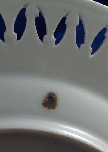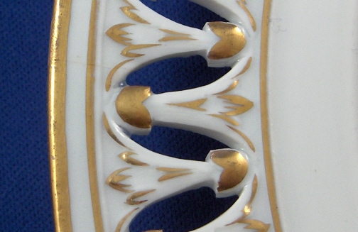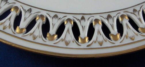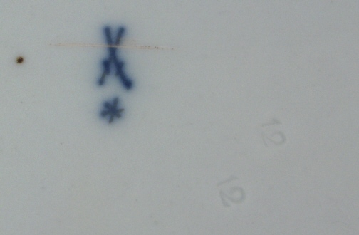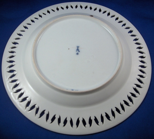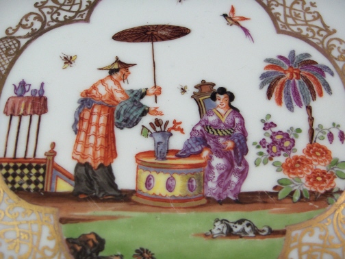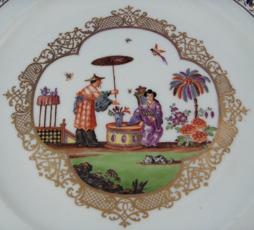 This is a porcelain plate made by Meissen around 1780 in the Marcolini period. It is handpainted with a superb Chinoiserie scene of amazing quality and color almost as good as the original ones from the early 18th century. It has strong colors and a nice design be it a bit funny since the male looks more Chinese while the lady looks Japanese. There is also a small dog in the front a colorful palm tree to the right and some nice birds and insects on top. The scene is surrounded by a fancy gold trim and the reticulated rim also has gold highlights. All in all a very stunning plate! This plate is in great condition with a big black firing spot in the back which is the cause of it being a second quality piece, a tiny bit of wear and a short hairline to the rim which cannot grow and is perfectly stable. The plate still rings true despite the hairline! The plate is 1 inch tall and 9.125 inches in diameter. Marked underneath with the underglaze blue crossed swords with the star underneath as well as two impressed number 12s, a blue 4 and some blue dots as well as an incised number 62. Please email me for more information or other pictures.