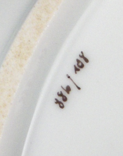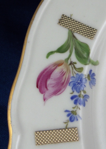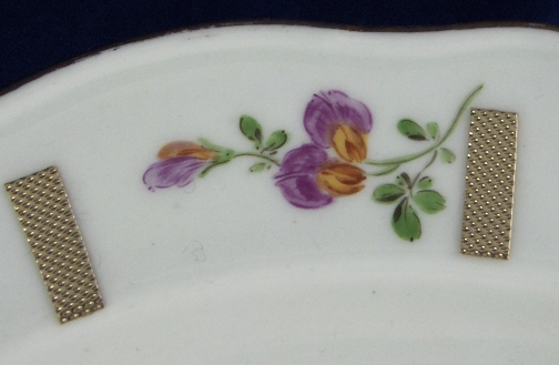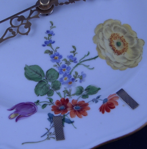 This is a fun clock from a plate made by Meissen in the mid to late 20th century. The plate is handpainted with a nice floral arrangement to the right side of the plate as well as two smaller flowers on the other side. Someone made it into a clock with the rim having golden markers where the hours would be and a nice gold colored metal set of hands. Just what the Meissen nut like me needs in his office :) The piece is in great condition with the tiniest of wear to the gold trim on the edge. It is marked on the back with their typical black numbers as well as an impressed 3 with the swords behind the plastic battery case which I am not taking off. The clock is 1.75 inches tall (including the black battery case underneath and has a diameter of 8.5 inches. Please email me for more information or other pictures.