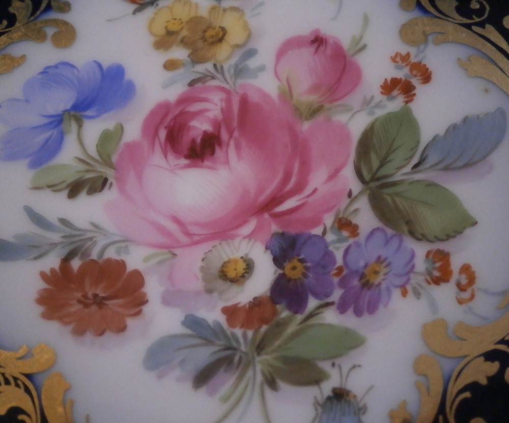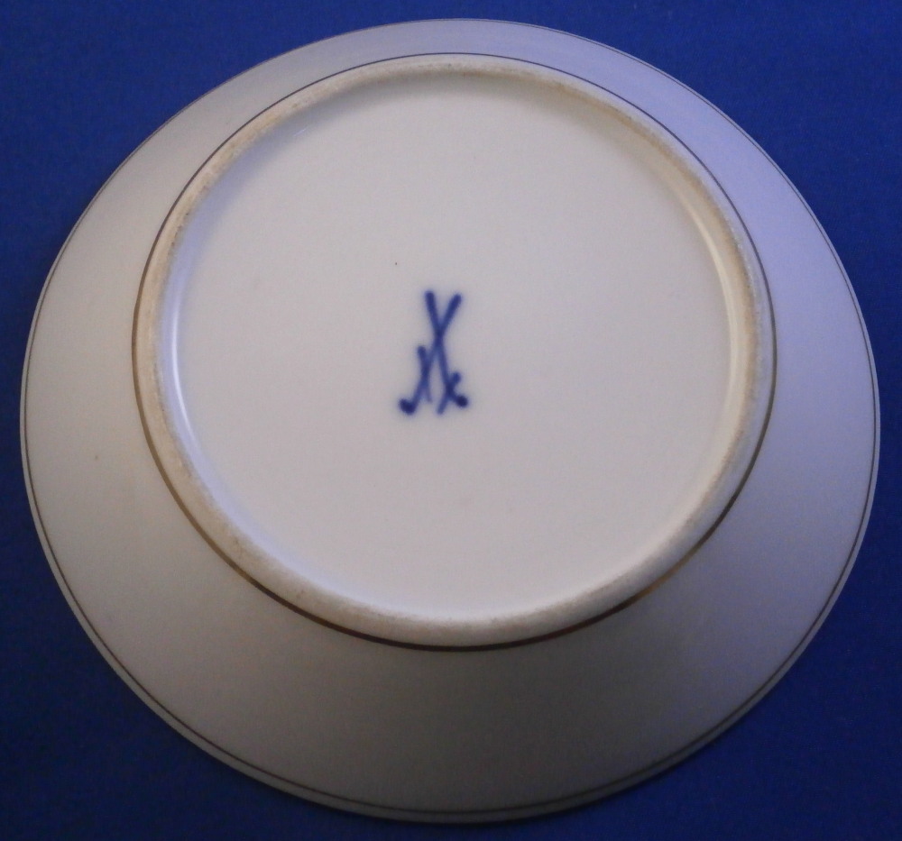 This is a really nice saucer made by Meissen in the 19th century . The piece is hand painted with a panel of a floral arrangement on white ground surrounded by some fancy gold trim with the rest of the piece having a deep cobalt blue ground color and some more fancy gold trim to the inside. That blue and gold combination has to be among the very best in the porcelain world! Looks amazing. The saucer is in perfect condition which is always nice and is marked with the under glaze blue crossed swords mark underneath as well as the usual impressed number as shown. The saucer is 1.125 inches tall with a diameter of 5.125 inches. Please email me for more information or other pictures.