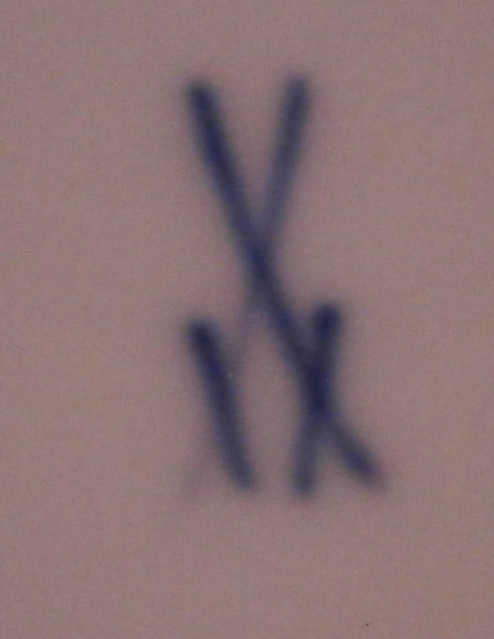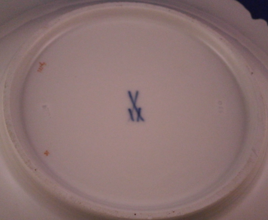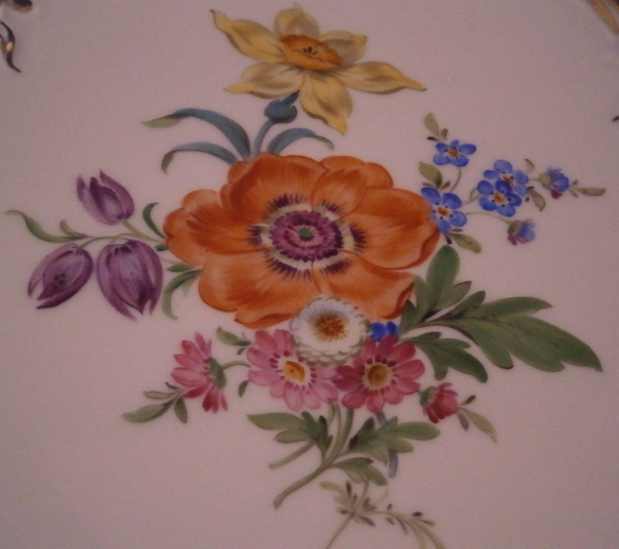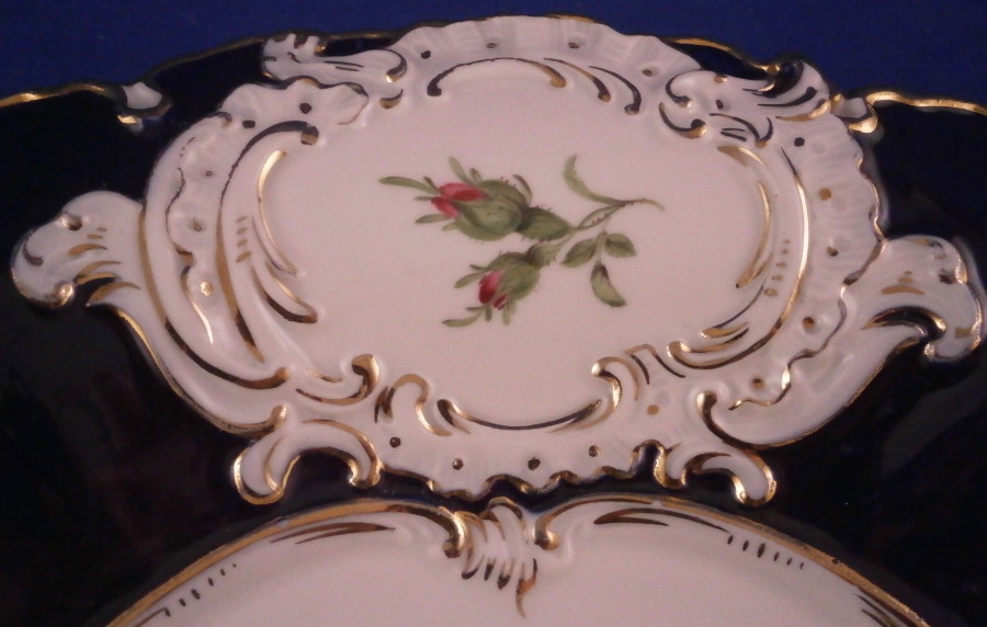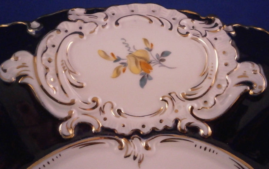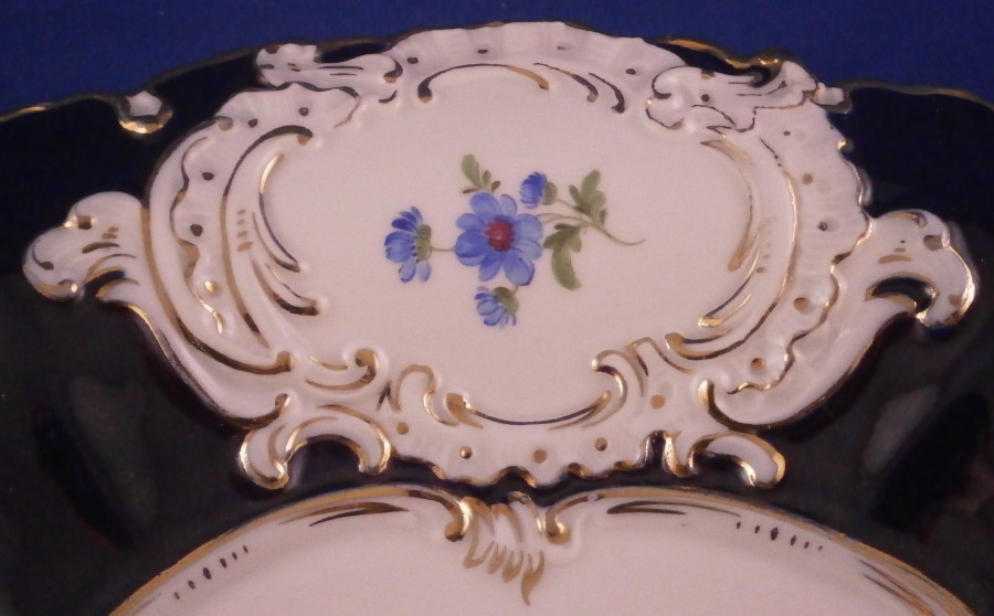 This is a really nice large display plate made by Meissen during the 20th century. Not an uncommon piece but it is of a nice size and the cobalt blue ground color with the relief design highlighted with gilding and large floral design in the center is one of the best combinations in my view. The plate has three panels of single flowers along the rim and a really nice floral arrangement hand painted in the center. A really stunning look! The piece is in perfect condition. It looks amazing! The piece is marked underneath with the under glaze blue swords mark (first choice) as well as the usual impressed and painter's marks, etc. as shown. The plate is 1.875 inches tall and 11.75 inches in diameter. So a really nice large charger type plate! Please email me for more information or other pictures.