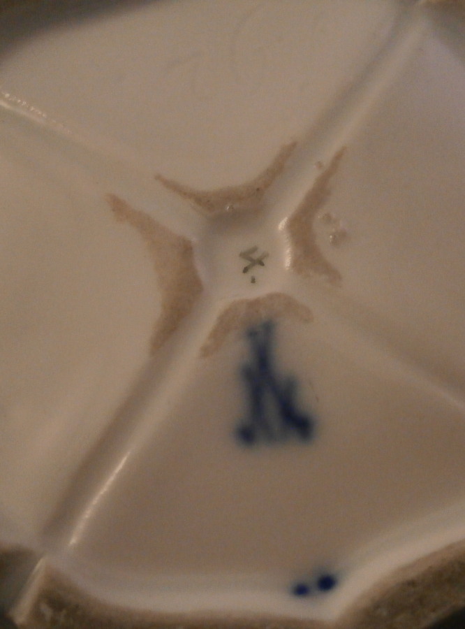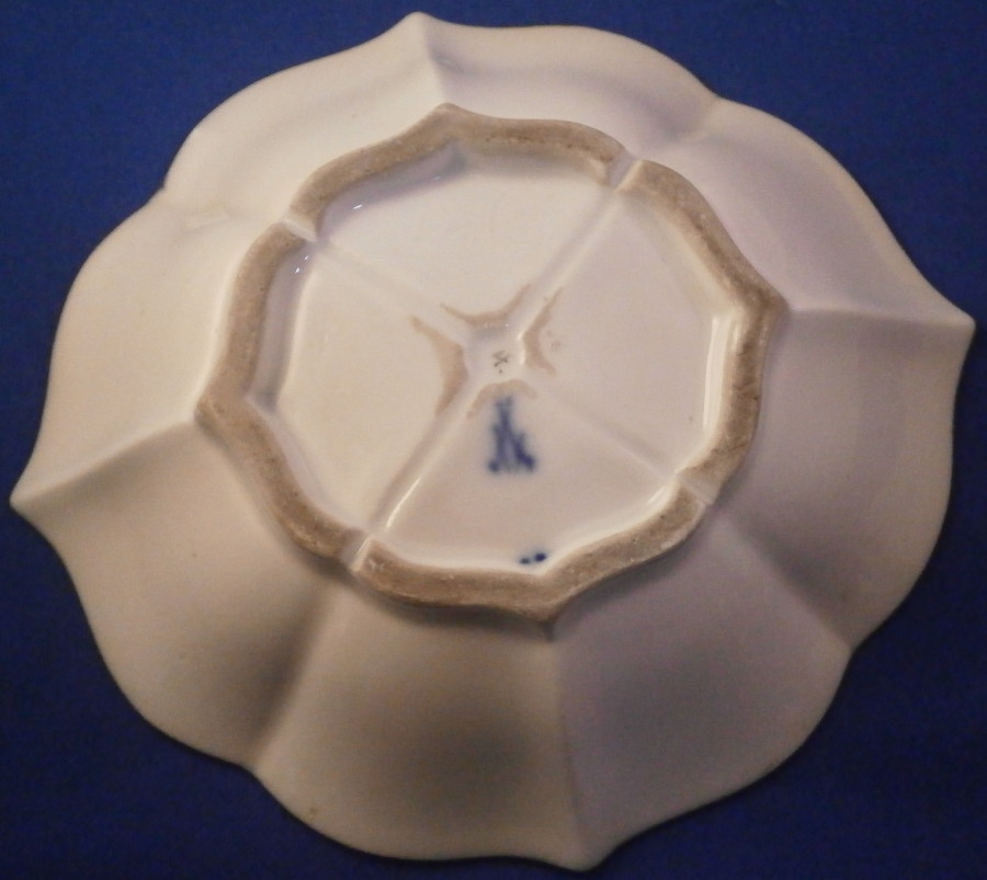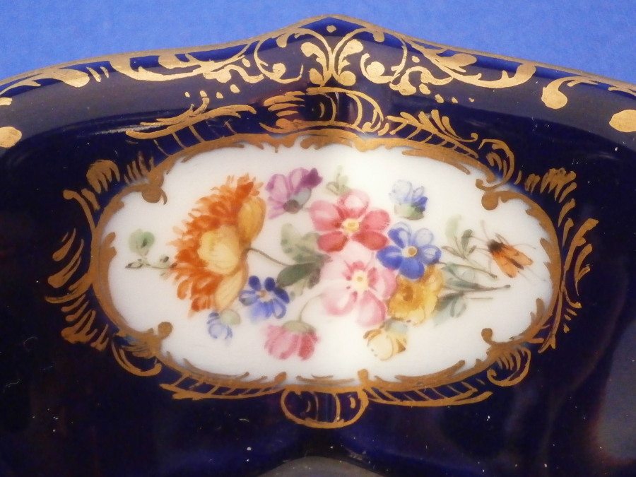 This is a nice saucer made by Meissen in the 19th century. A rare shape that would ahve come with a quatrefoil cup with an 18th century style handle to it. Alas that is missing here so it's jsut a lone saucer. It is hand painted with two cartouches of polychrome flowers on white ground surrounded by some fancy gilding. The rest of the dish is a deep cobalt blue with lots of fancy gold trim along the rim. The piece is in perfect condition. It is marked with the under glaze blue crossed swords mark (first quality) underneath as well as the usual incised marks, two blue dots along the edge and a painter's number 4. The underplate is 1.125 inches tall, 5.5 inches wide and 5.125 inches deep. Please email me for more information or other pictures.