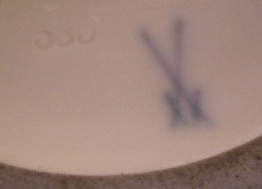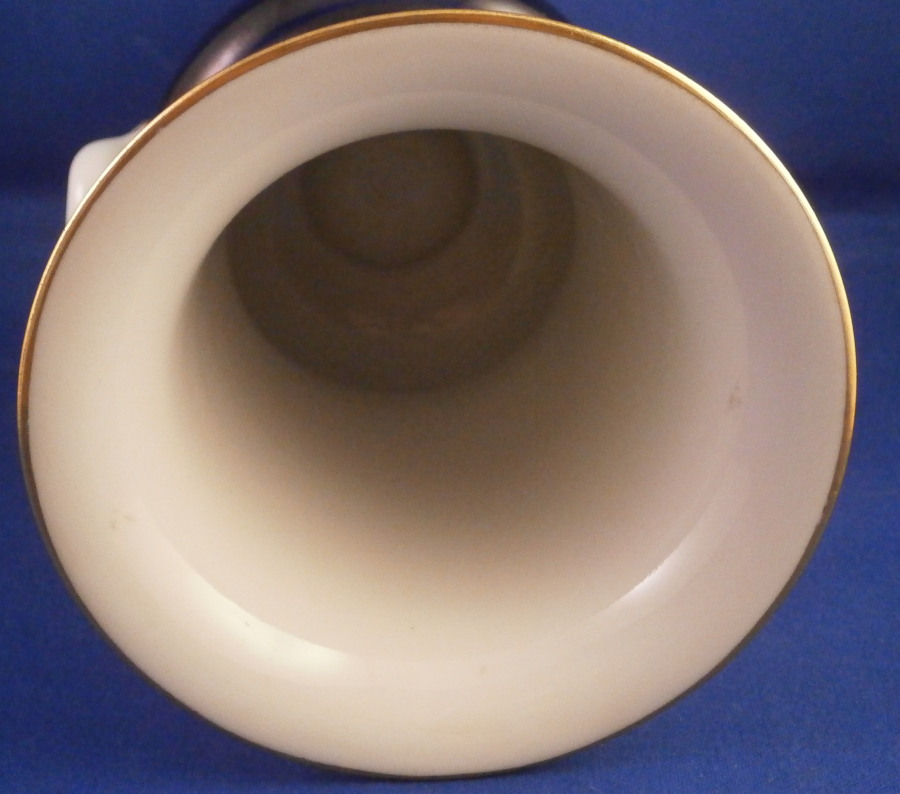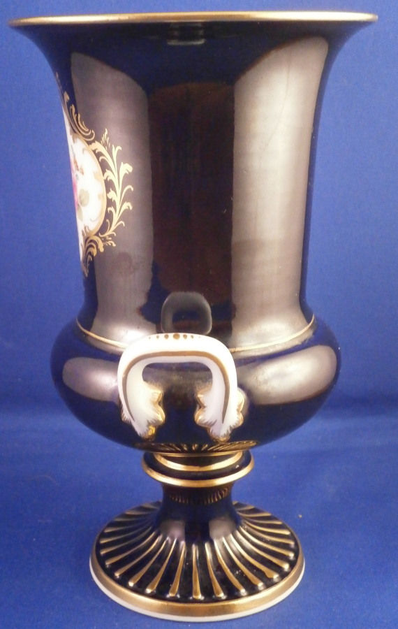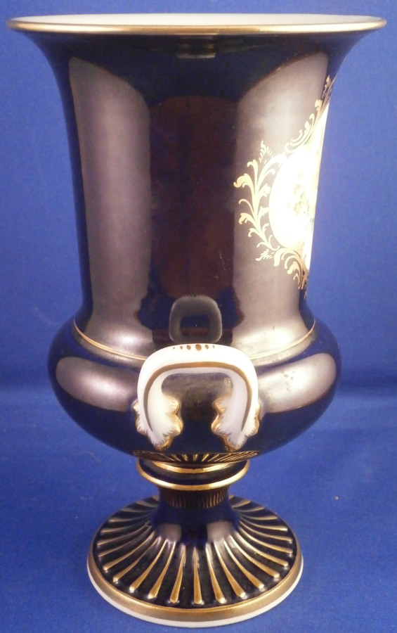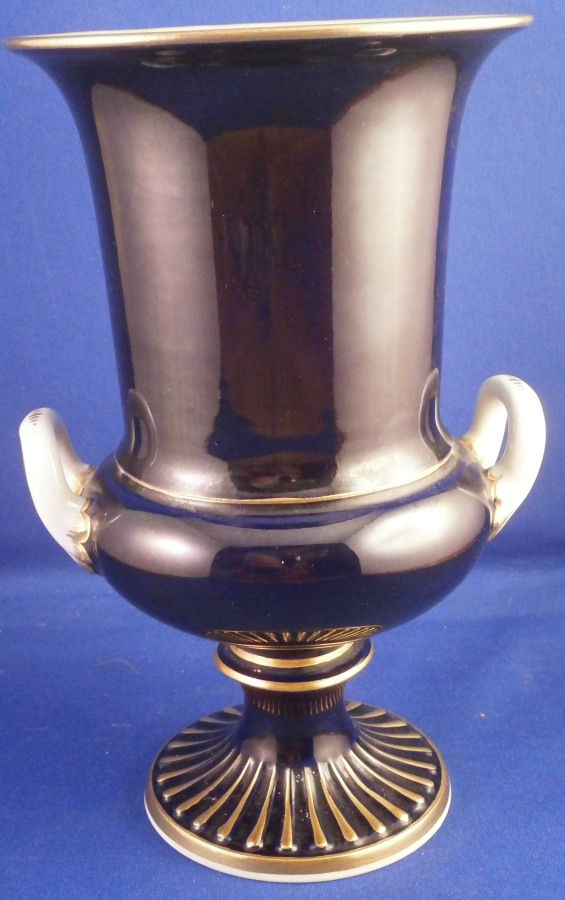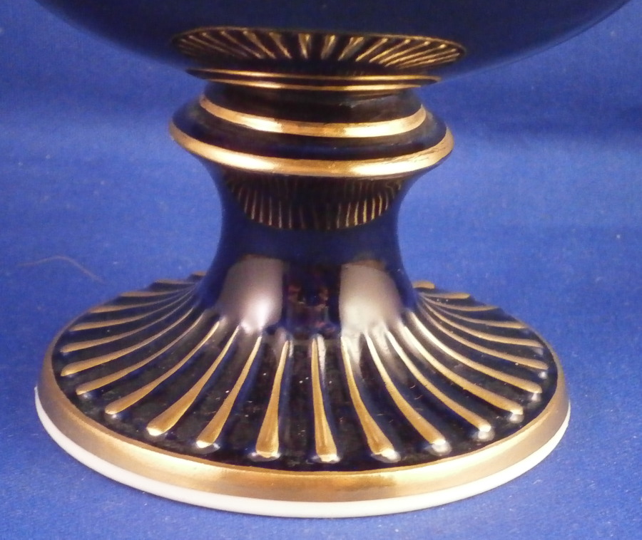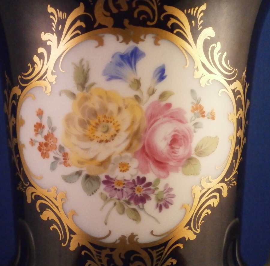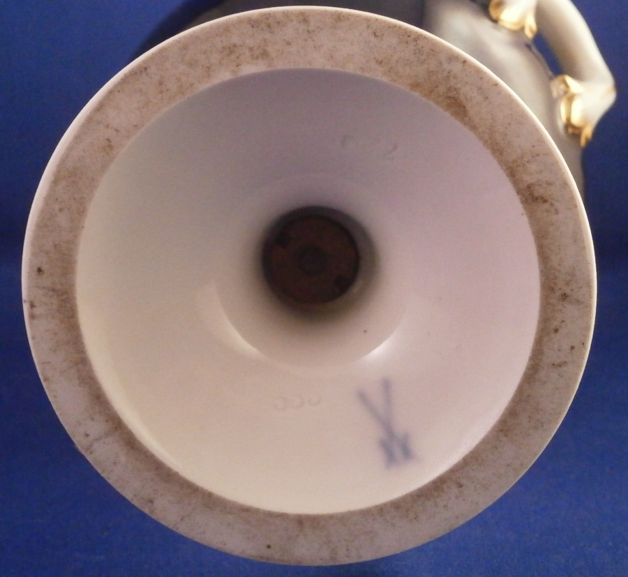 This is a really nice urn or Medici shaped vase made by Meissen in the 20th century. It is hand painted with a nice floral arrangement to the front on white ground surrounded by some fancy gilding with the rest of the vase having that superb deep cobalt blue ground color and a bit more gold trim. A handle to each side with gilding to it make this a very elegant piece! The vase is in great condition. Needs a bit of a cleaning but that is it. It is marked with the under glaze blue crossed swords on the underside as well as the usual other impressed marks as shown. First choice off course. The vase is 7.5 inches tall with a top diameter of 4.5 inches - the handles stick out a bit from there. Please email me for more information or other pictures.