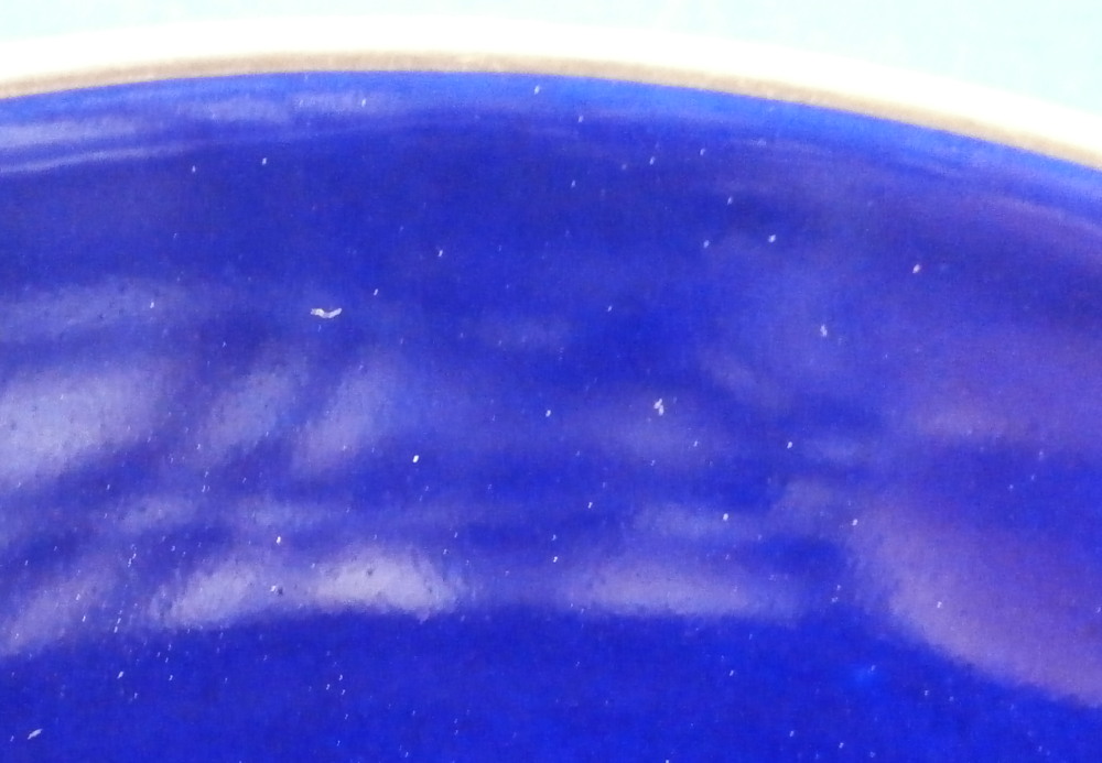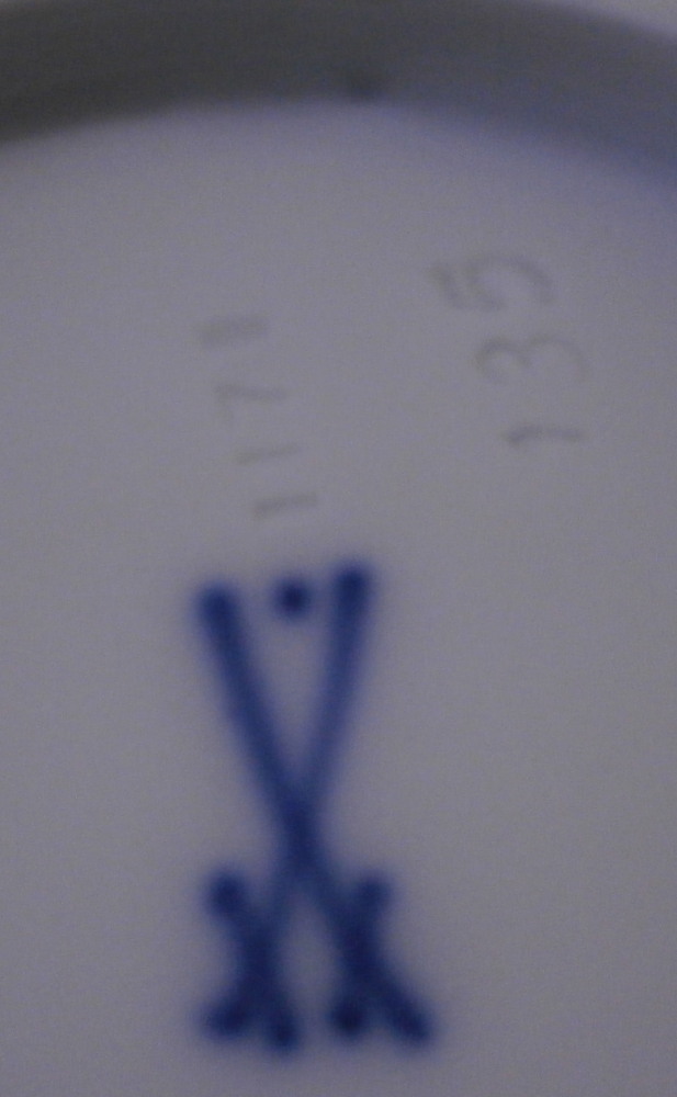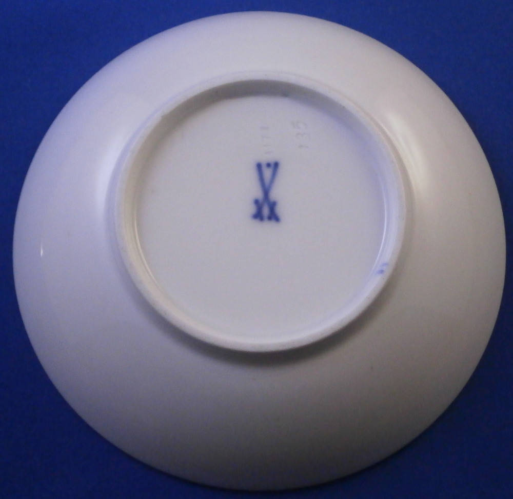 This is a simple suacer for a demitasse / mocha or espresso coffee cup made by Meissen during the Pfeiffer period around the late 1920s. Simple in design with the entire peice having a cobalt blue ground color to it with just a simple gold line to the edge but it would work for any floral or scenic demitasse with a cobalt blue ground. So if you are msising a saucer here is your chance :) The cobalt blue and gold combo always looks stunning! The saucer is in great condition with just some minor use marks. It displays perfectly! The piece is marked underneath with the under glaze blue crossed swords mark with the dot between the tops, a painter's number and the usual impressed numbers as shown. It is 1 inch tall and 4.5 inches in diameter. Please email me for more information or other pictures.