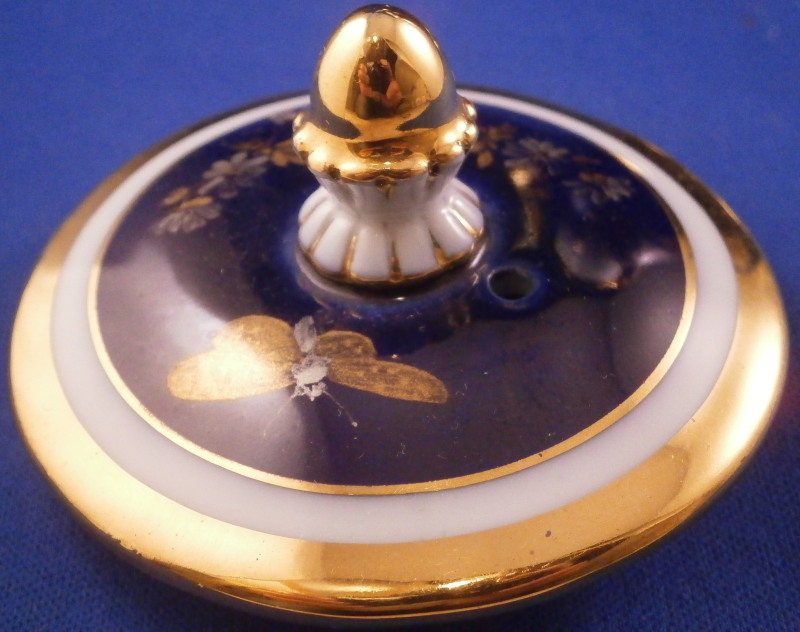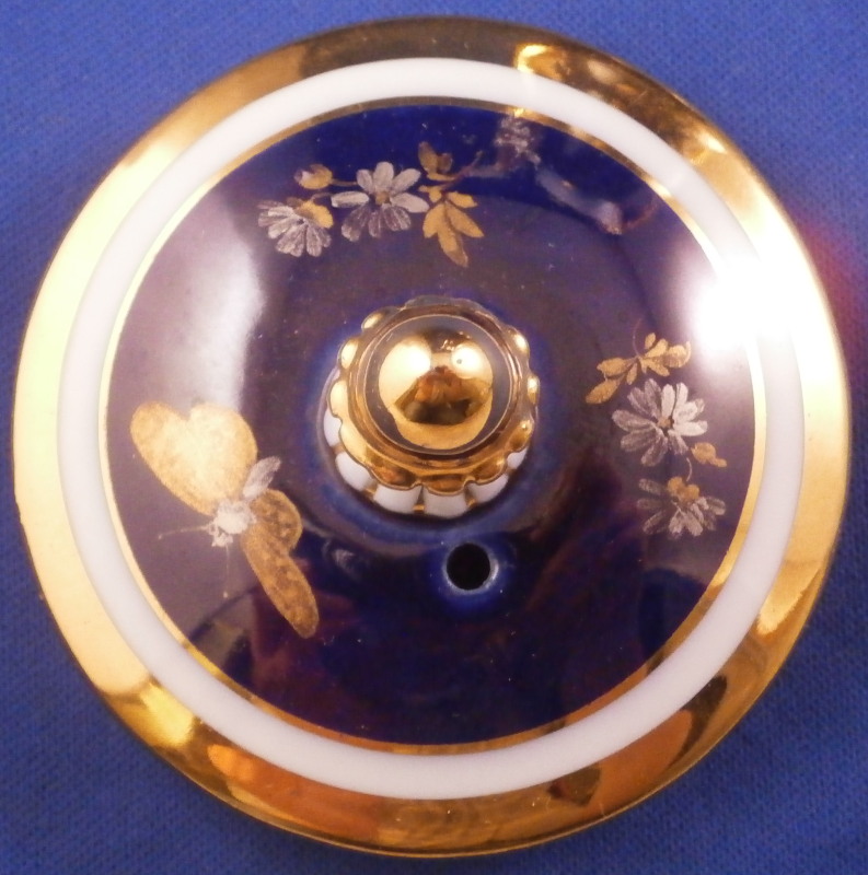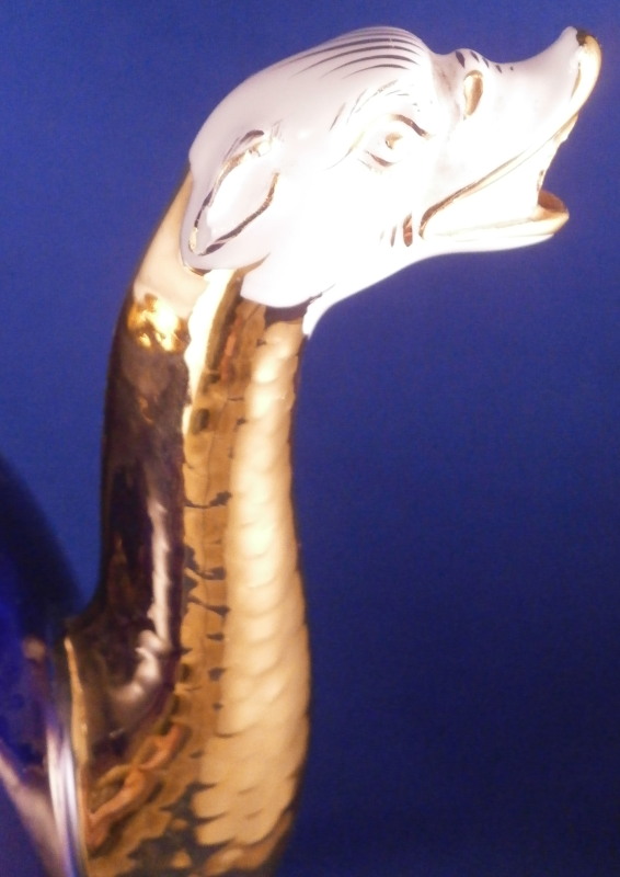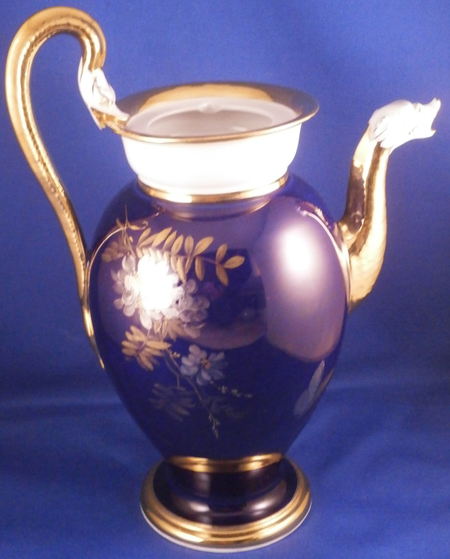 This is a stunning lidded coffee pot made by Meissen in the mid to late 19th century. Both pieces are decorated with a superb deep cobalt blue ground color and are hand painted with one of the nicest and also rarest decorations - the platinum and gold flowers on a cobalt blue background. I especially like the butterfly on the lower front of the main pot and on top of the lid! The lid has two smaller flowers to it as well. The top part of the main body and outside area of the lid were left in the white with lots of gold trim to the edges, etc. Nice acorn finial highlighted with gilding. The handle is in the shape of a snake with the head biting into the top rim and the scaly body forming the handle which fully gilded looks amazing! The spout also has the relief scales to the gilded part and a dragon head spout highlighted with gilding. Superb! One very rarely sees this design on a coffee pot and I also have the creamer and sugar dish on the site from this set! The pot and lid are in perfect condition and the main body is marked with the under glaze crossed swords mark underneath as well as the usual impressed / incised marks of the period. First choice off course. The piece is 9.75 inches tall including the handle, 7.25 inches from handle to spout and 4.5 inches in diameter. Please email me for more information or other pictures.