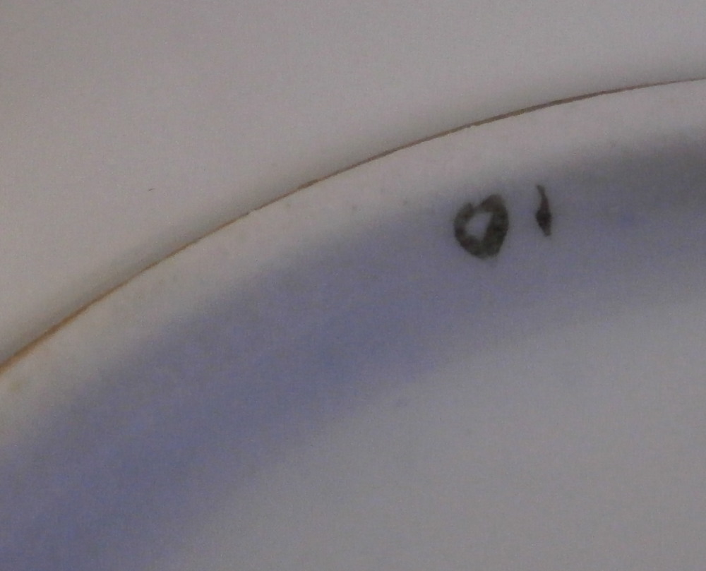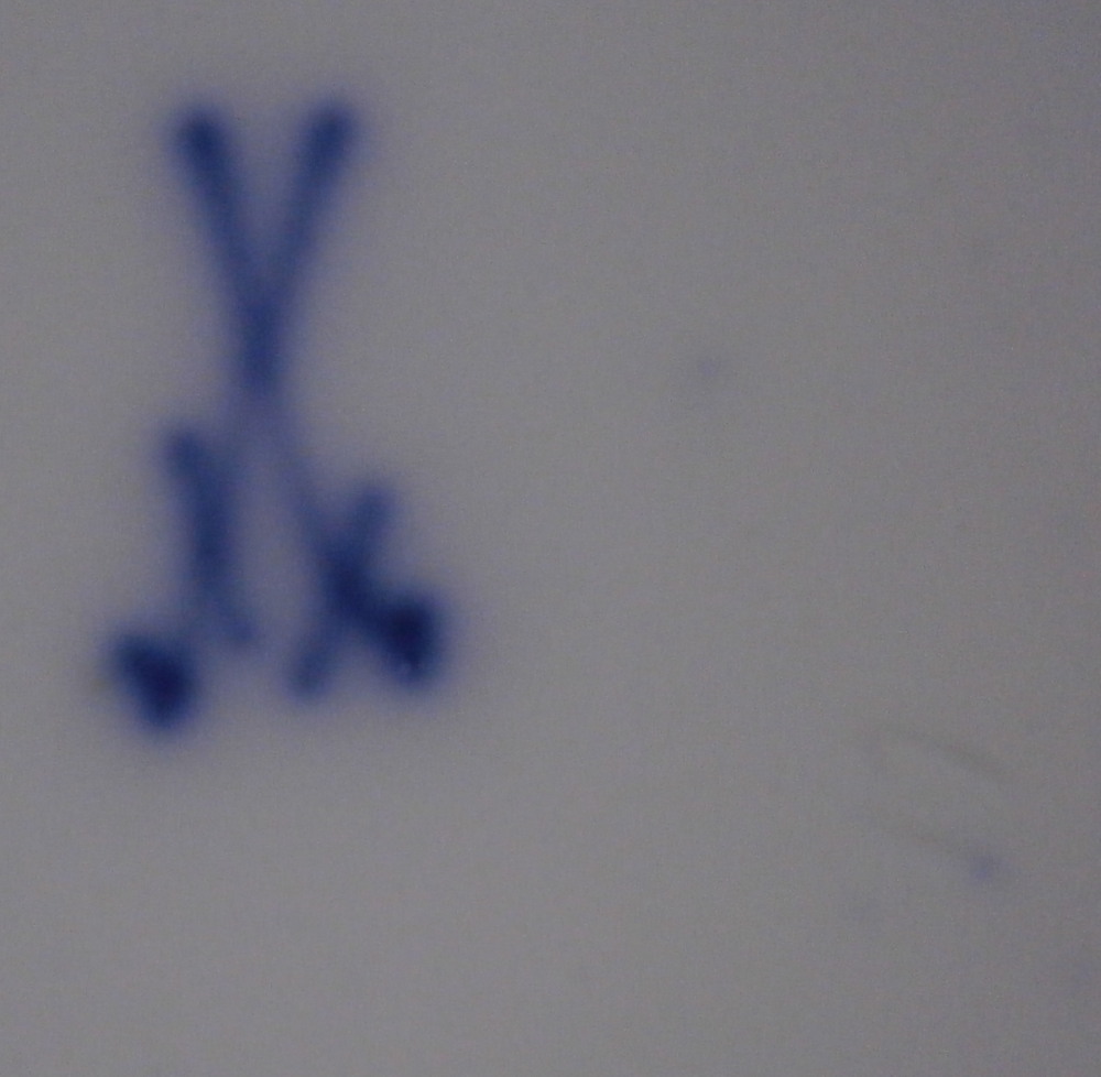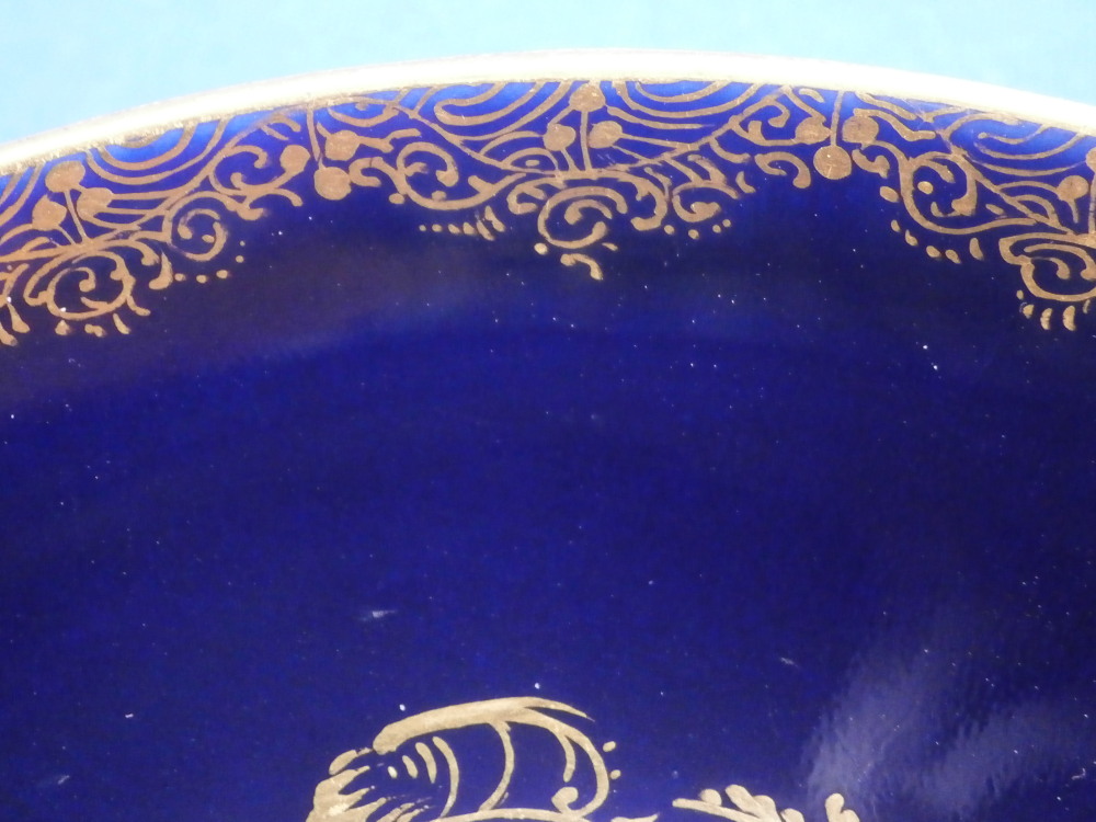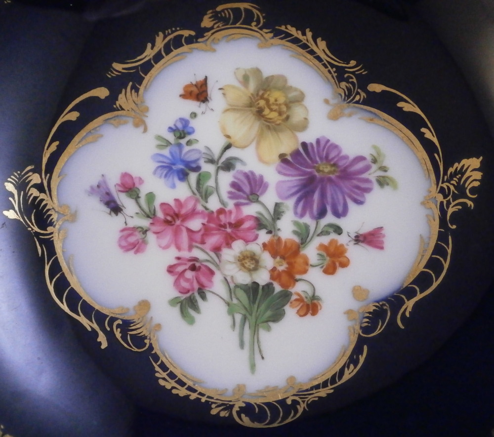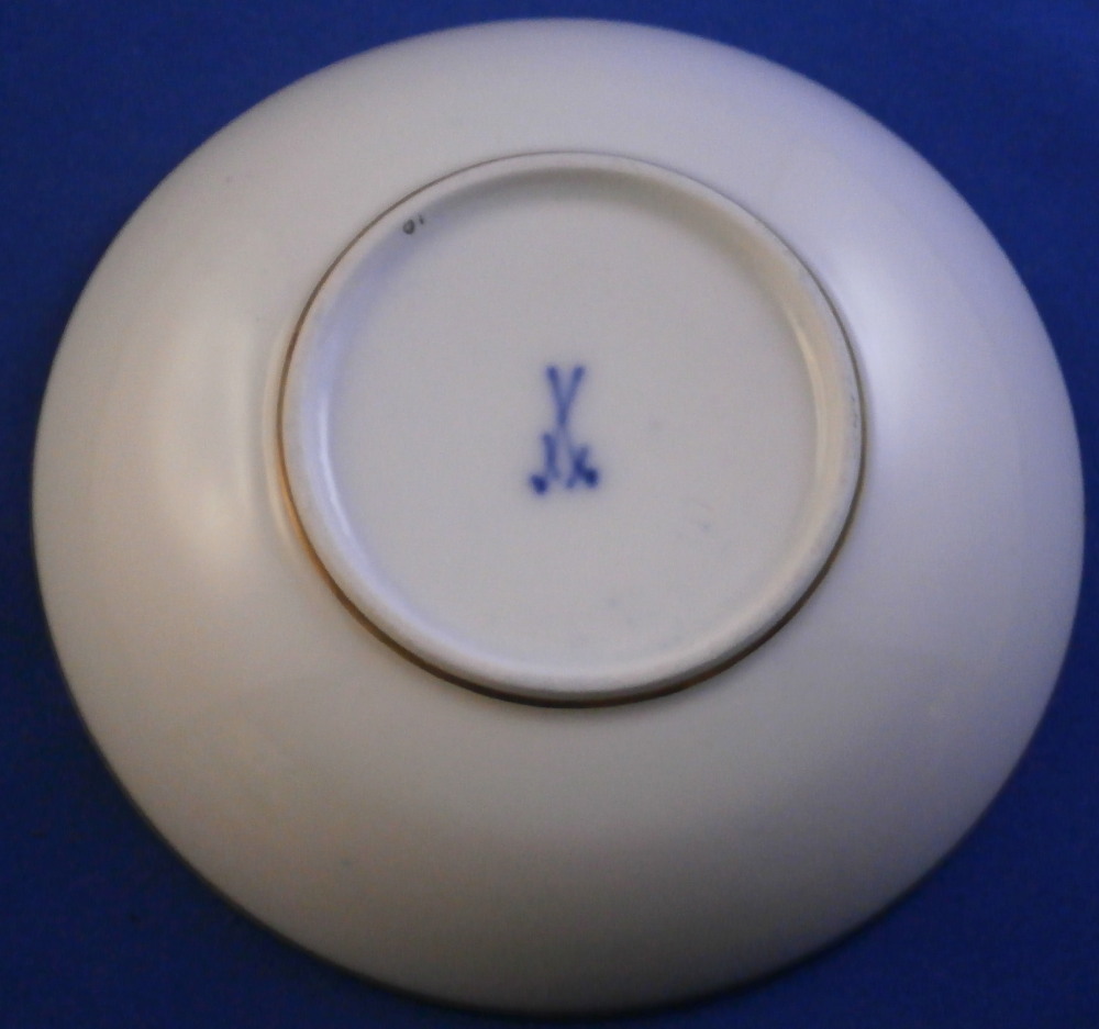 This is a really nice demitasse saucer made by Meissen in the late 19th or early 20th century . The piece is hand painted with a panel of a floral arrangement on white ground in the center surrounded by some fancy gold trim with the rest of the piece having a deep cobalt blue ground color and some more fancy gold trim to the rim and a gold line to the outside of the foot ring underneath. That blue and gold combination has to be among the very best in the porcelain world! Looks amazing. The saucer is in perfect condition which is always nice and is marked with the under glaze blue crossed swords mark underneath as well as the usual impressed number and a black painter's mark 10 as shown. The saucer is 0.875 inches tall with a diameter of 4.375 inches. Please email me for more information or other pictures.