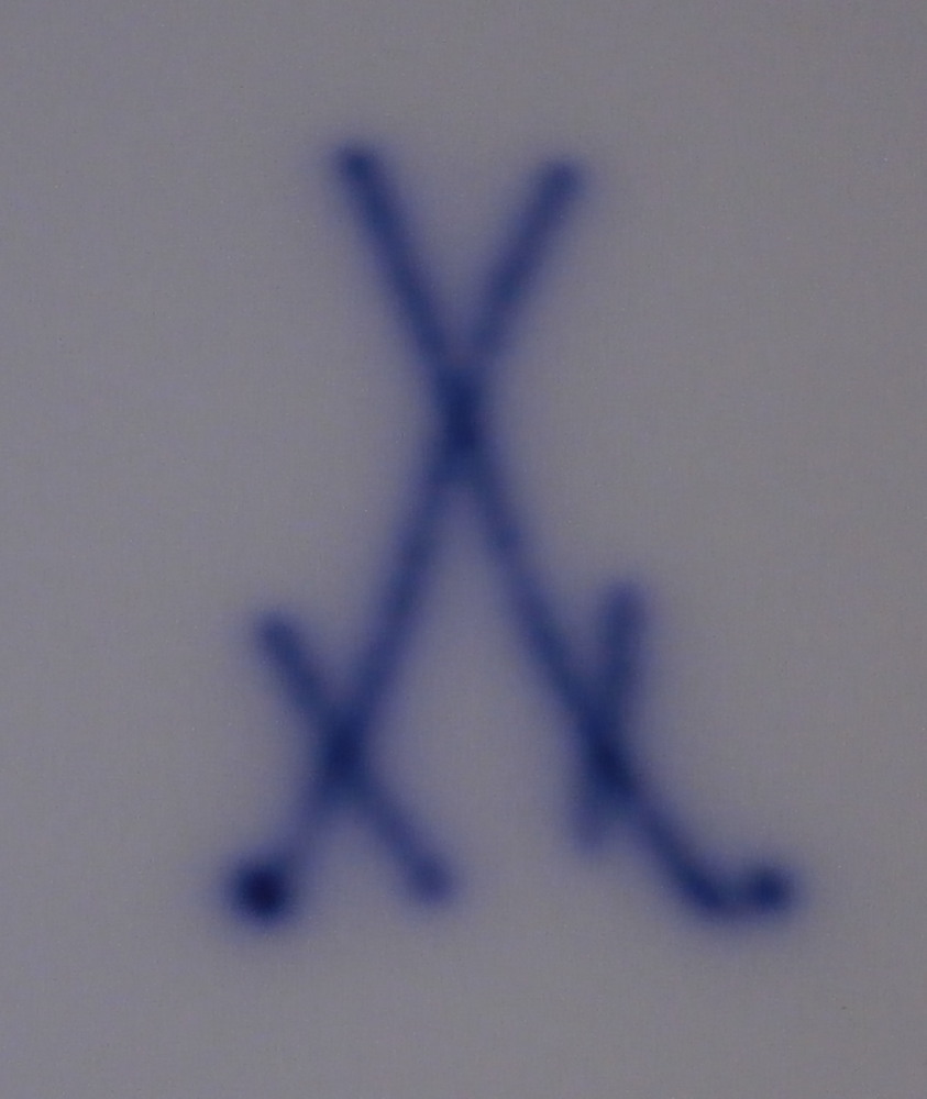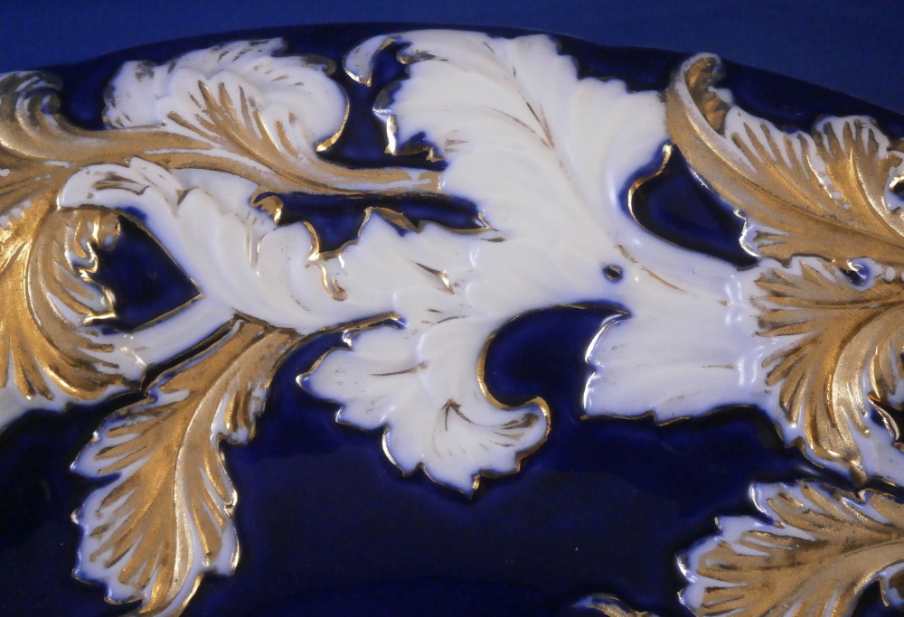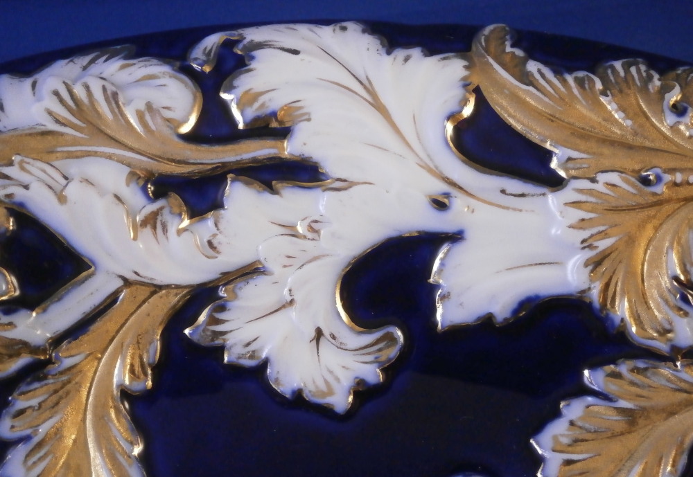This is a nice large display plate / bowl / charger made by Meissen during the mid 19th century. Not the most exciting decoration ever but as my youngest said - it is really pretty. The dish is of a nice size and the cobalt blue ground color with the relief leaf design highlighted with gilding looks stunning. Sometimes simpler is better! The plate has a ring of relief leaves around the rim that are alternated in terms of decoration. One set is mostly white with just some gold veins while the other set is mostly gilded. That on the blue background really does look pretty. The piece is in good condition with some wear to the gilding though not bad at all and it displays nicely! It is a great size for being able to use it being 2.25 inches tall and having a diameter of 11.875 inches. The piece is marked underneath with the under glaze blue swords mark (first choice) as well as an incised model number and an impressed number as shown plus the blue painter's number. Please email me for more information or other pictures.