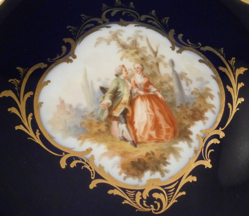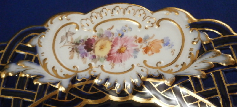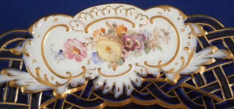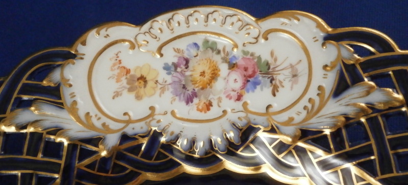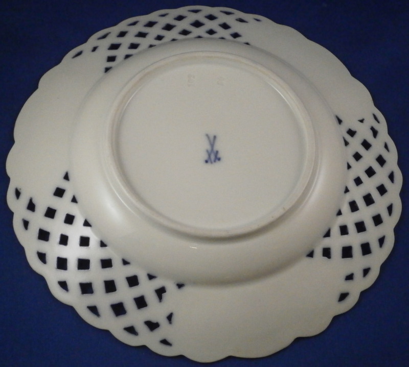 This is a really stunning reticulated Watteau scene plate made by Meissen in the late 19th century. The piece is hand painted with a top notch scene in the center of a couple in a landscape surrounding with some nice gold trim around it. The edge has three panels of floral arrangements on white ground to it with the rest of the plate having a cobalt blue ground color - even the reticulated area which is uncommon. Superb gilding to the retiuclated as well. A truly amazing and elegant plate! The plate is in perfect condition which is always nice. It is marked with the under glaze blue crossed swords mark underneath as well as the usual impressed numbers of the period. The plate is 1.25 inches tall and 8 inches in diameter. Please email me for more information or other pictures.