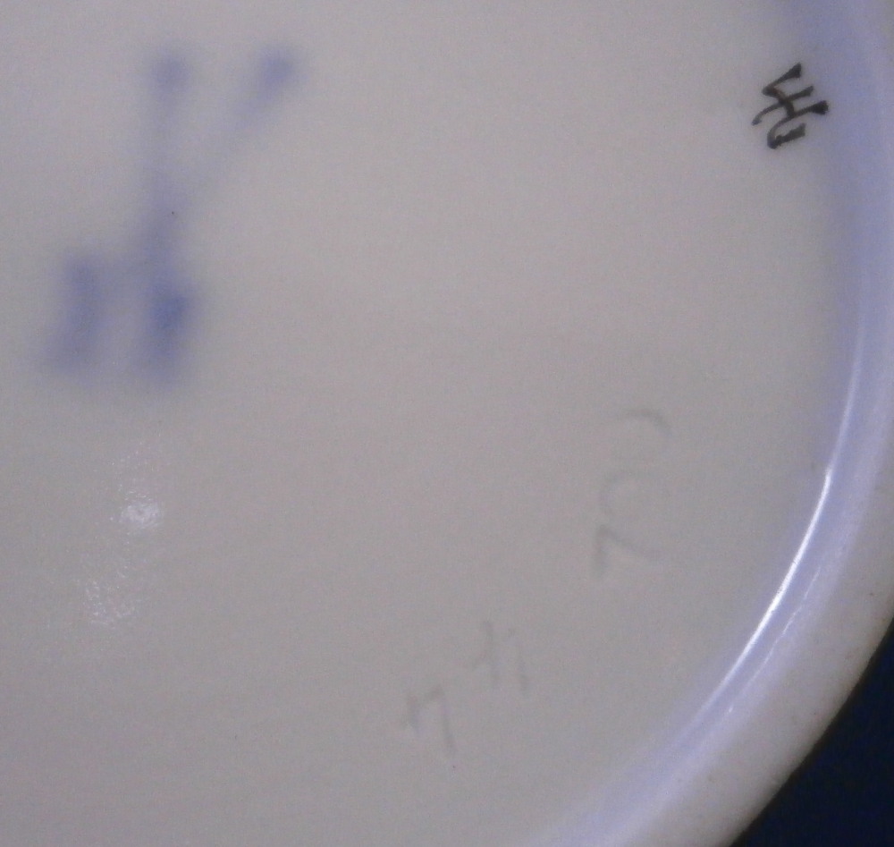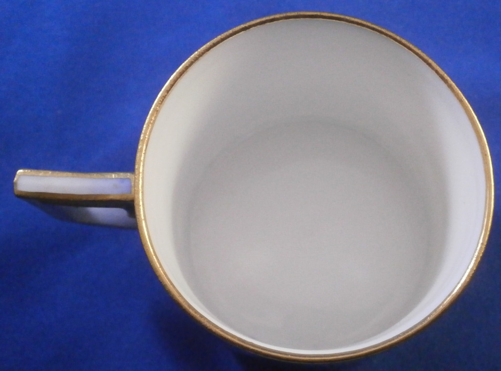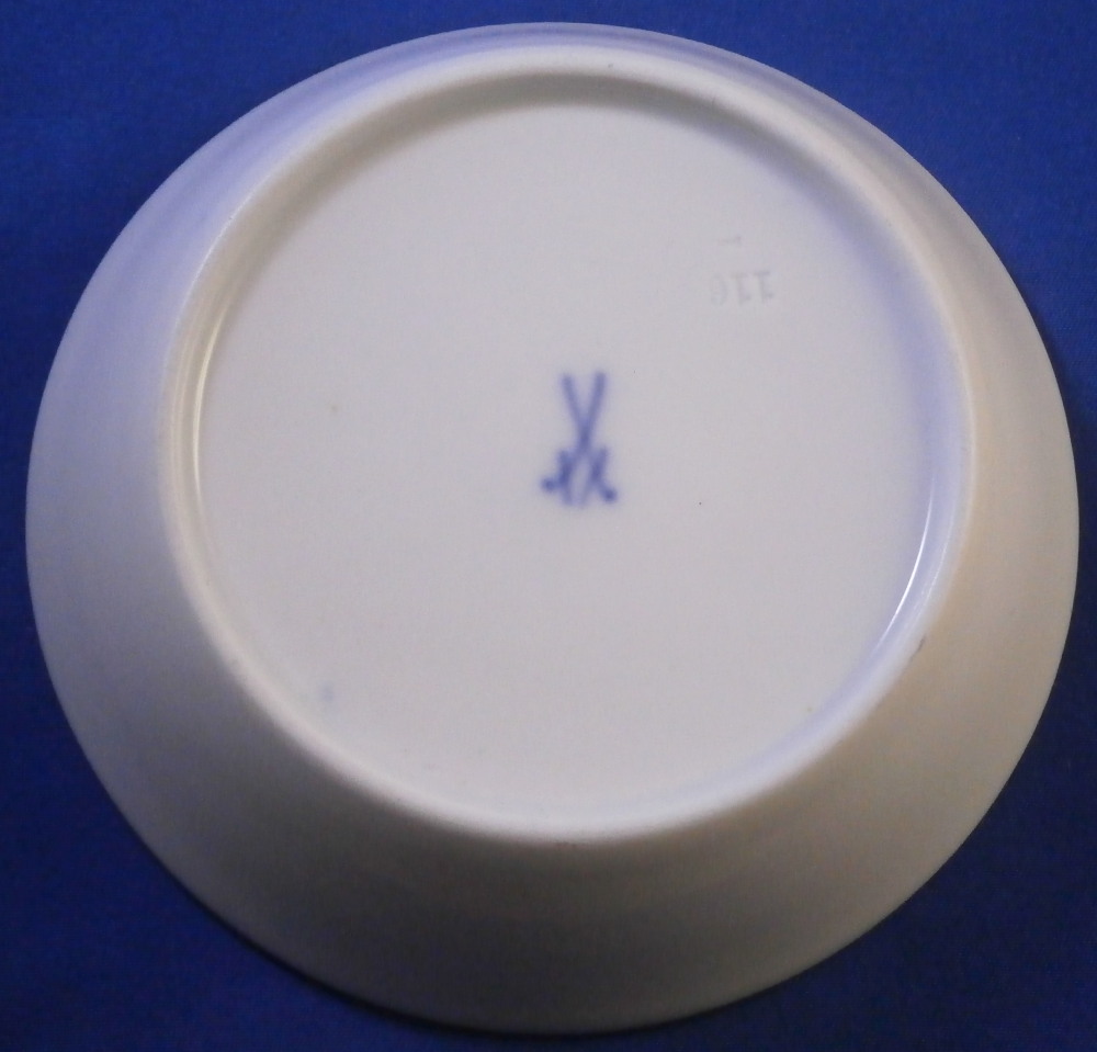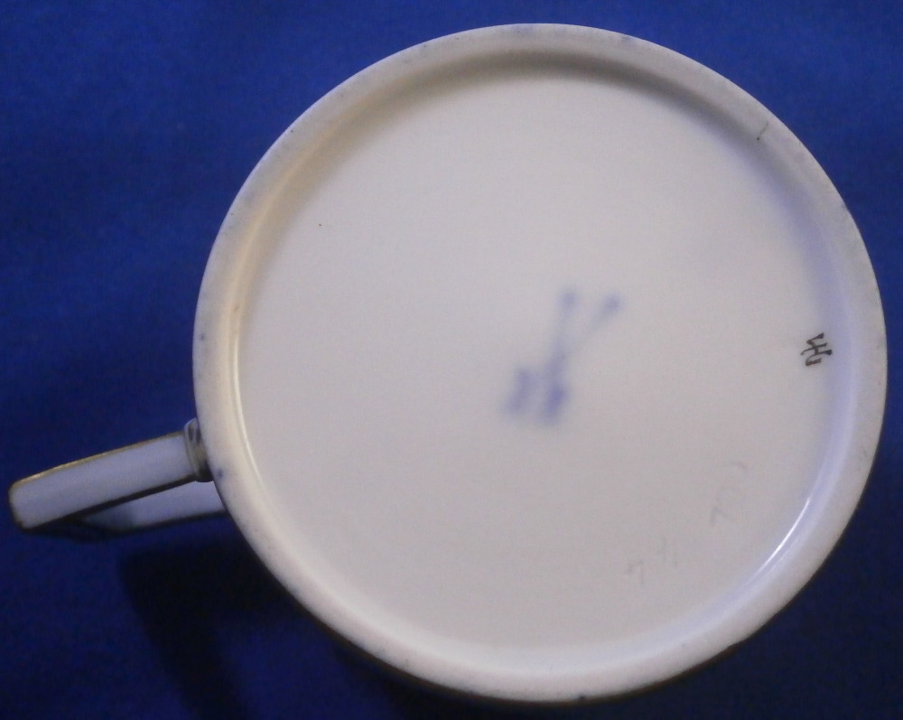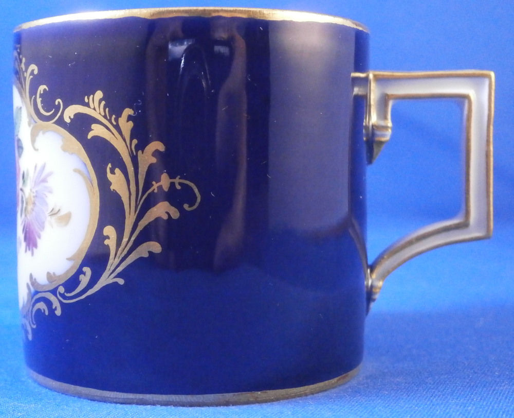 This is a cute little cup and saucer set / demitasse / mocha or espresso coffee cup & saucer made by Meissen during the earlier 20th century. The cup has that superb cobalt blue ground color with a white panel to the front on which a polychrome floral arrangement was painted. It is surrounded by some fancy gilding. Gold trim to the edge and the white classicism syle handle. The saucer is simple in design with the entire piece having a cobalt blue ground color to it with just a simple gold line to the edge but it works well with the fancier cup. The cobalt blue and gold combo always looks stunning! The set is in perfect condition. Both are marked underneath with the under glaze blue crossed swords mark as well as the usual impressed numbers and a black painter's number under the cup as shown. The cup is 2 inches tall with a diameter of 2.125 inches. The saucer is 0.875 inches tall and 4.25 inches in diameter. Please email me for more information or other pictures.