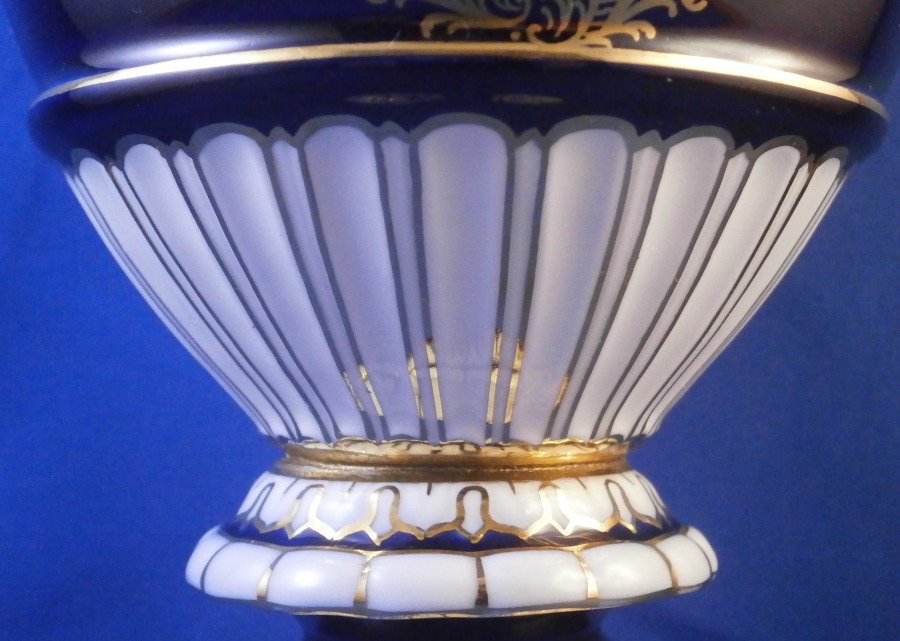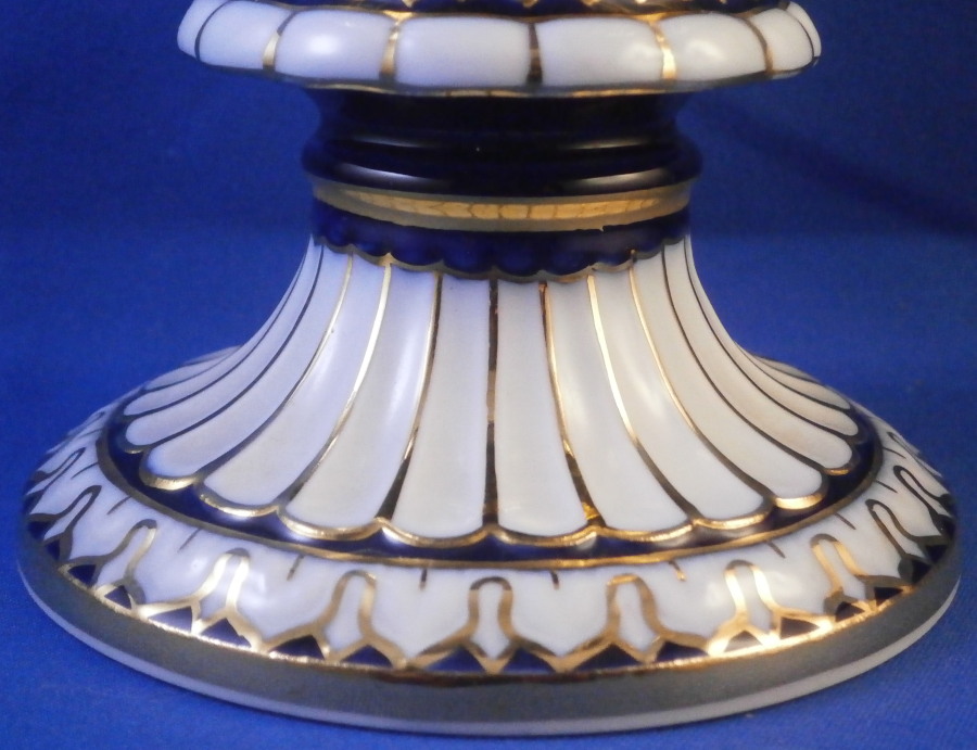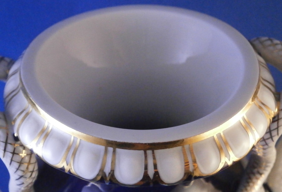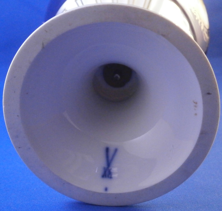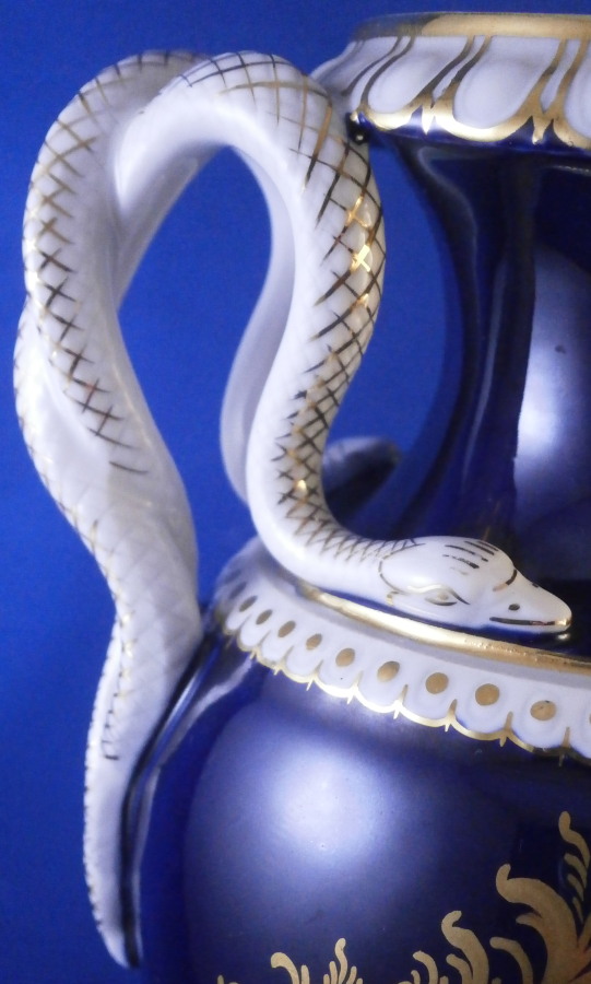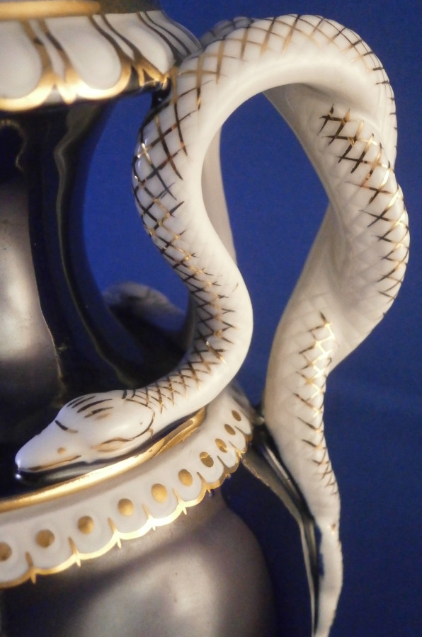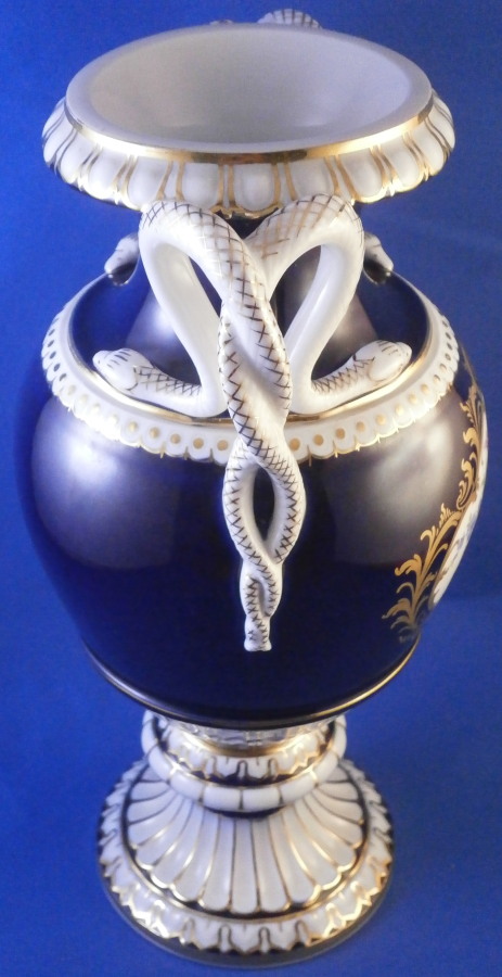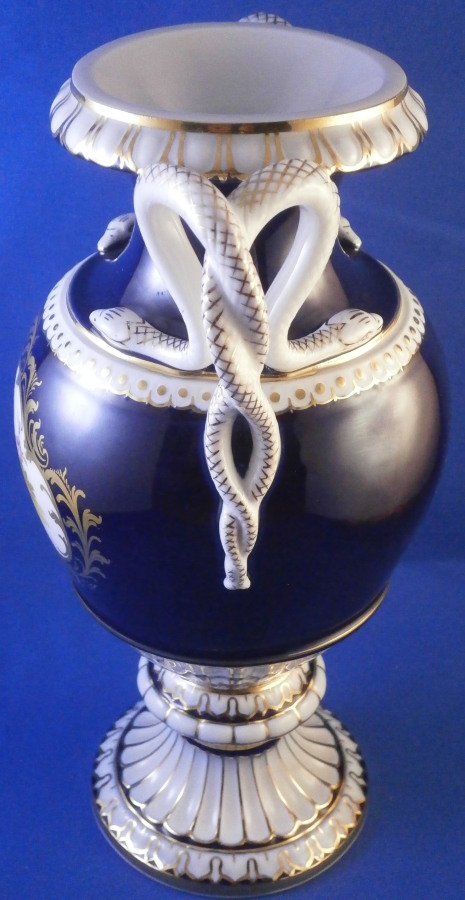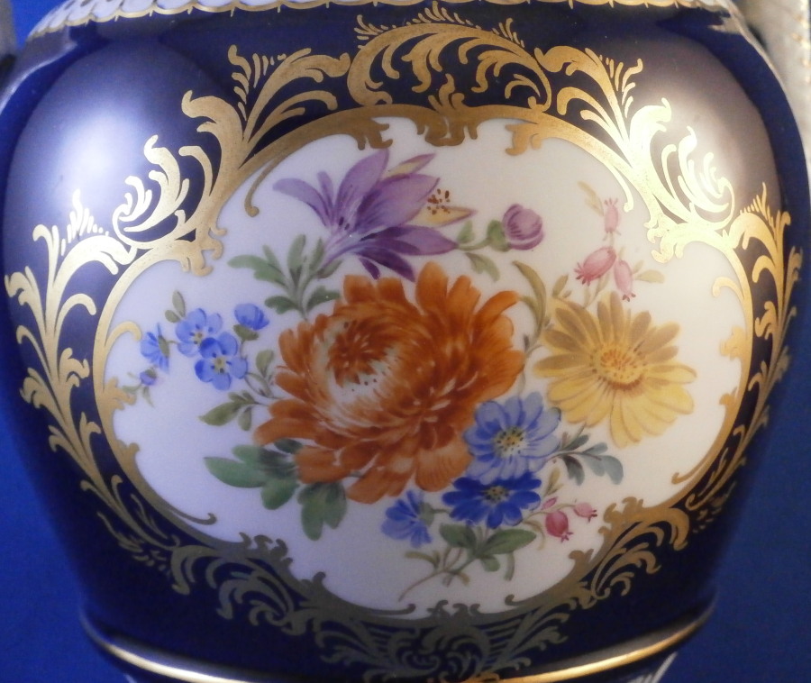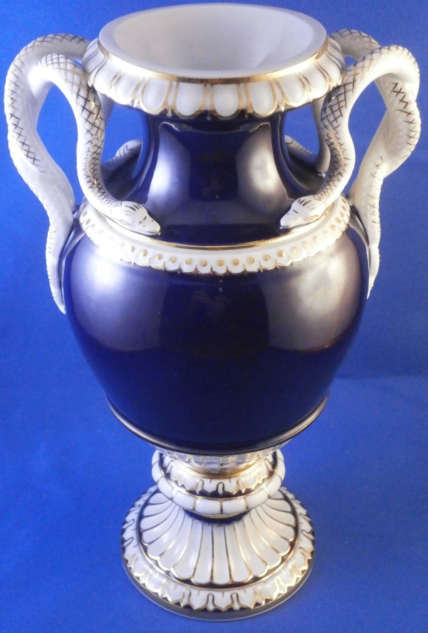 This is a really nice amphora shaped vase made by Meissen in the late 19th or early 20th century. A very popular design with the snake handles on either side! It was first designed by Ernst August Leuteritz in 1861 and is still very popular today. It is ahrd to find the cobalt blue ground version like this with the gilding in perfect codntion! The vase has a large hand painted floral arrangement on white ground in the front surrounded by fancy gilding with the main areas having that rich dark cobalt blue ground color to it. It has a gilded foot and mid section with a bit of cobalt blue to them as well and more gold trim to the top and just under where the heads of the snakes are located. The snakes have a relief scale design to them highlighted with gilding that looks stunning! What makes the piece special is that it is an older version and the gilding is in amazing condition! Often times these very gilded versions have a lot of wear and it does not look good with the wear or they have damage or have been restored so to get one in this superb condition is definitely a plus! The piece comes in two pieces that are connected with a screw which is normal. The vase is marked underneath with the under glaze blue crossed swords with the pronounced hilts mark as well as the usual impressed numbers and letters as shown. It is is 8.75 inches tall, 5.25 inches from handle to handle and 4 inches in diameter in the center. Please email me for more information or other pictures.