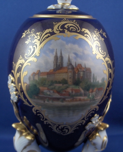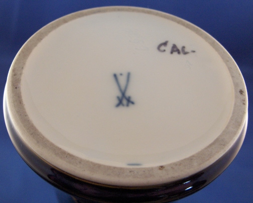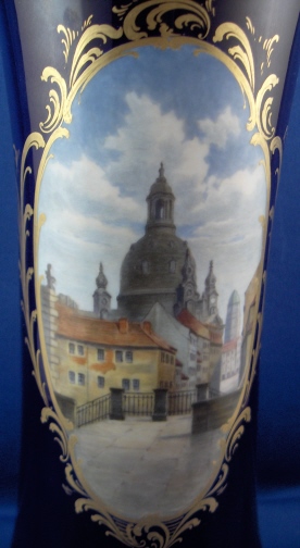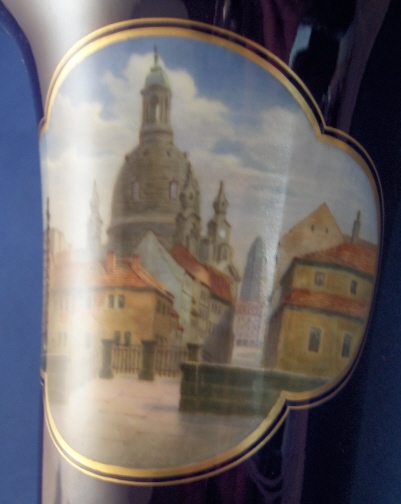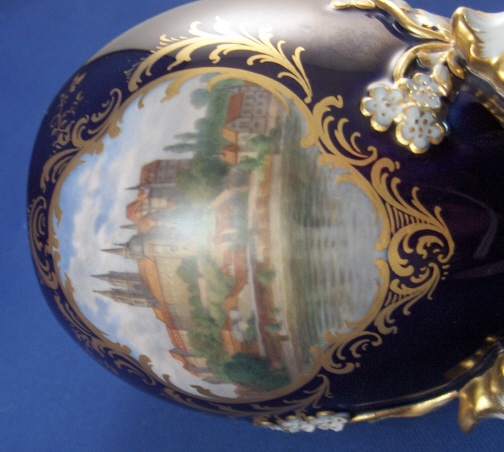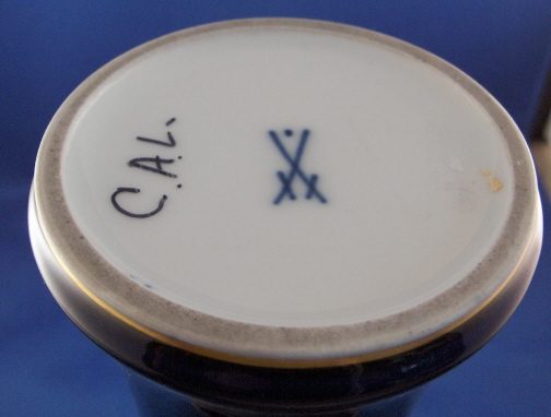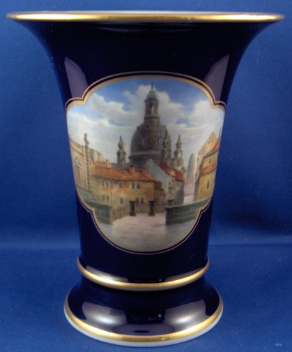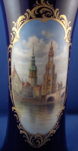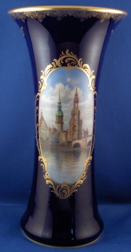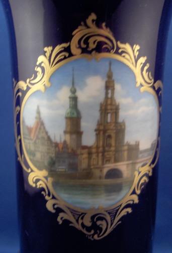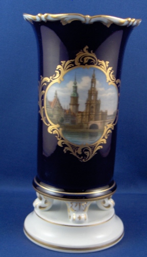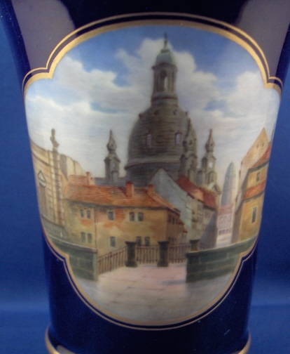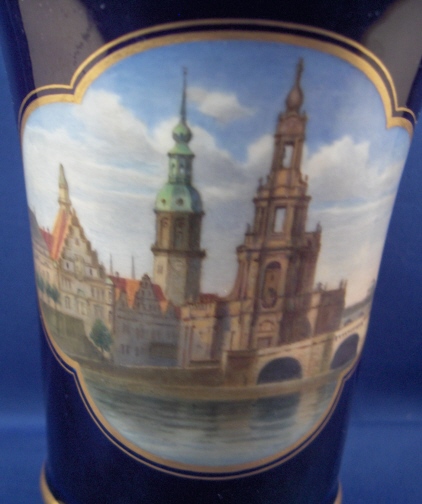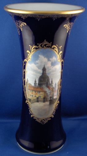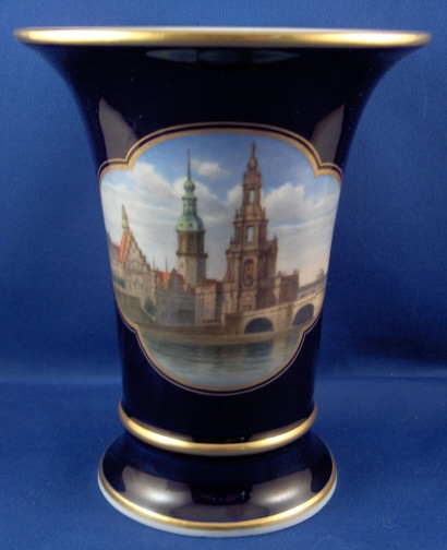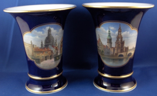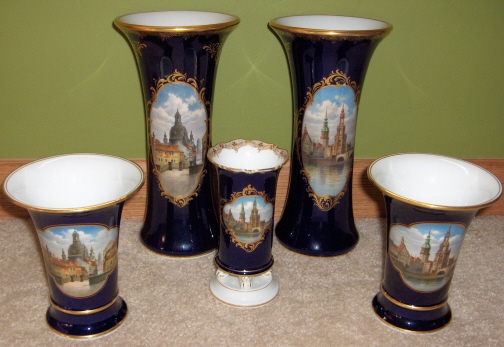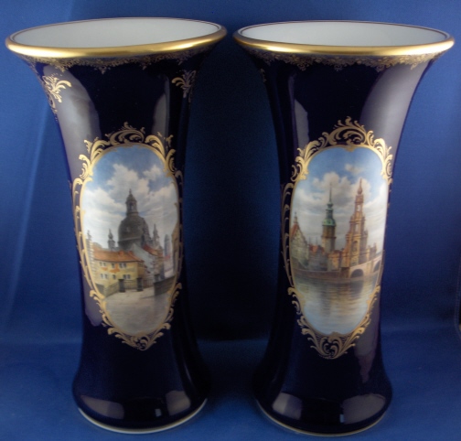 This is probably the nicest set of vases I have ever seen or owned! It is a set of six cobalt ground and scenic vases made by Meissen during the early 20th century until the Pfeiffer period around 1925. All six have a nice cobalt blue ground color with some elegant gilding but the best part is the scenes on each piece which have a touch of Art Nouveau to them which makes sense since they were made during this period. The scenes are of the Frauenkirche - Church of Our Lady in Dresden and the Hofkirche - The Catholic Church of the Royal Courth of Saxony in Dresden. The two pairs of vases each have one of these scenes on them, the small footed vase has the Hofkirche on it and the egg vase has the Albrechtsburg in Meissen on it where Meissen was founded which is extra nice for the collector! This is one superb set and amazingly in perfect condition! The vases are marked underneath with the underglazed blue crossed swords marks as shown. The smaller trumpet vases have the anniversary mark of 1910 on them, the taller vases and the footed vase the Pfeiffer period mark and the egg shaped vase has what is left of the mark from around 1900 with the hilts on it but it is mostly gone due to its location. Some of the usual impressed and incised marks as well as shown. The taller vases are 9.5 inches tall and 4.75 inches in diameter. The trumpet vases are 5.25 inches tall and 4.5 inches in diameter. The small footed vase is 5.5 inches tall and 2.875 inches in diameter. And last but certainly not least the egg shaped lidded piece is 6 inches tall and has a diameter of 3 inches and the legs are 4.25 inches apart at the widest point. Please email me for more information or other pictures.