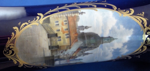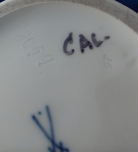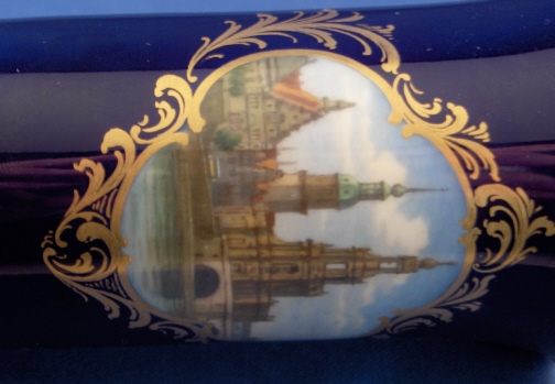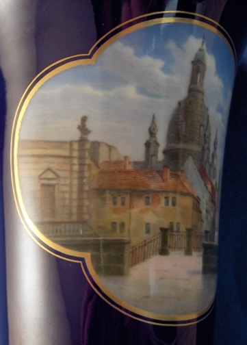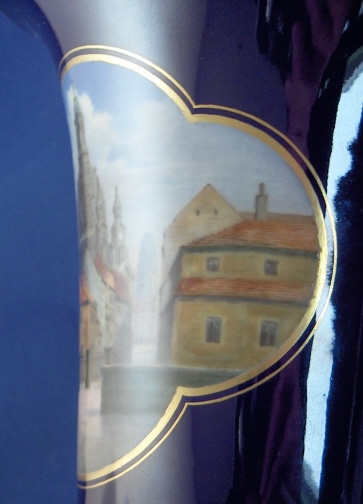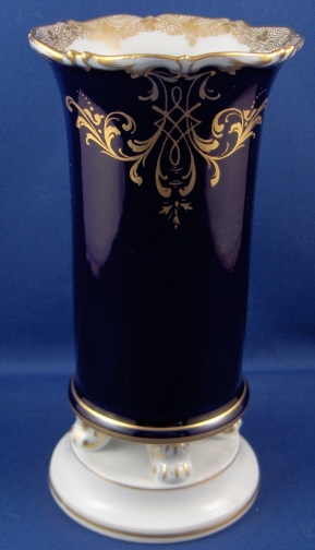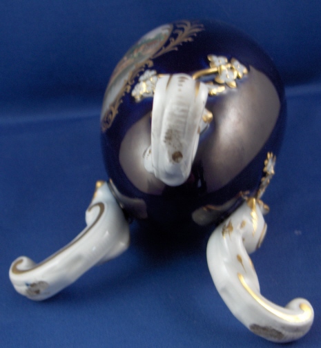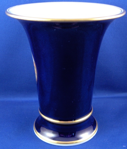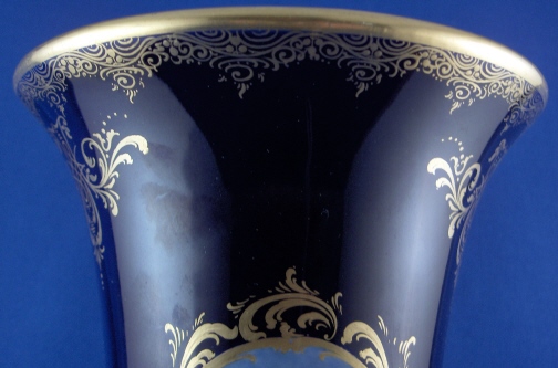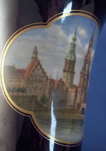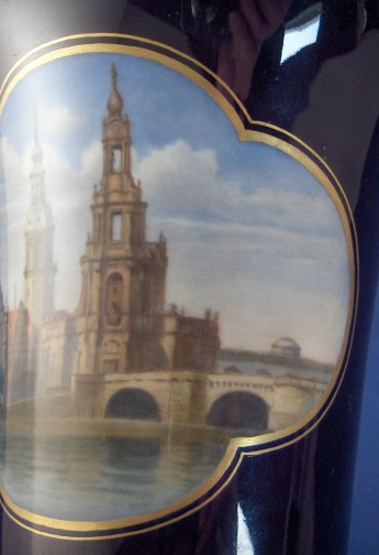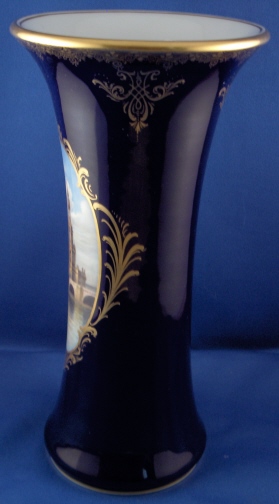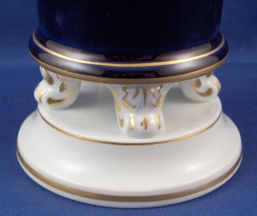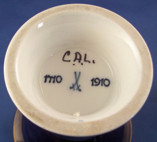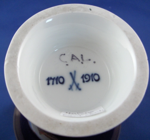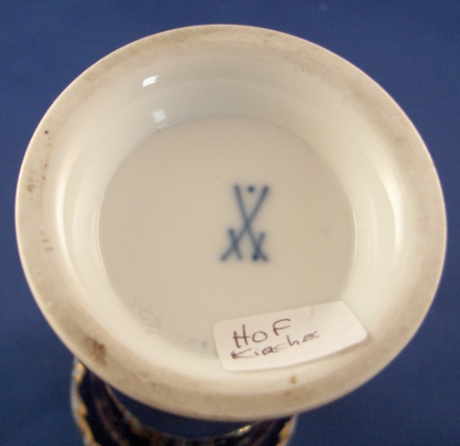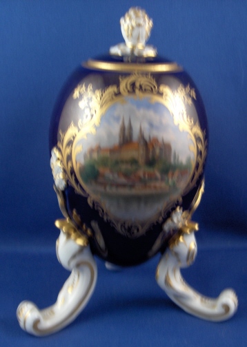 This is probably the nicest set of vases I have ever seen or owned! It is a set of six cobalt ground and scenic vases made by Meissen during the early 20th century until the Pfeiffer period around 1925. All six have a nice cobalt blue ground color with some elegant gilding but the best part is the scenes on each piece which have a touch of Art Nouveau to them which makes sense since they were made during this period. The scenes are of the Frauenkirche - Church of Our Lady in Dresden and the Hofkirche - The Catholic Church of the Royal Courth of Saxony in Dresden. The two pairs of vases each have one of these scenes on them, the small footed vase has the Hofkirche on it and the egg vase has the Albrechtsburg in Meissen on it where Meissen was founded which is extra nice for the collector! This is one superb set and amazingly in perfect condition! The vases are marked underneath with the underglazed blue crossed swords marks as shown. The smaller trumpet vases have the anniversary mark of 1910 on them, the taller vases and the footed vase the Pfeiffer period mark and the egg shaped vase has what is left of the mark from around 1900 with the hilts on it but it is mostly gone due to its location. Some of the usual impressed and incised marks as well as shown. The taller vases are 9.5 inches tall and 4.75 inches in diameter. The trumpet vases are 5.25 inches tall and 4.5 inches in diameter. The small footed vase is 5.5 inches tall and 2.875 inches in diameter. And last but certainly not least the egg shaped lidded piece is 6 inches tall and has a diameter of 3 inches and the legs are 4.25 inches apart at the widest point. Please email me for more information or other pictures.