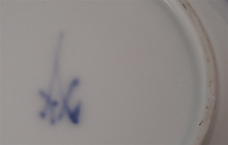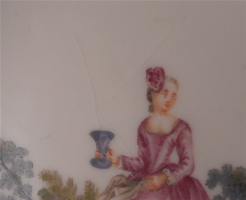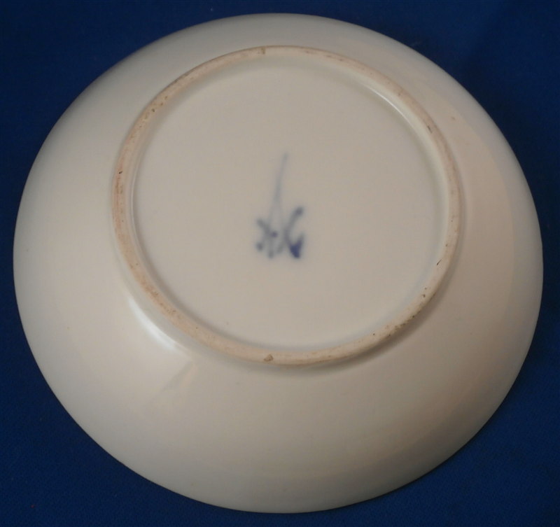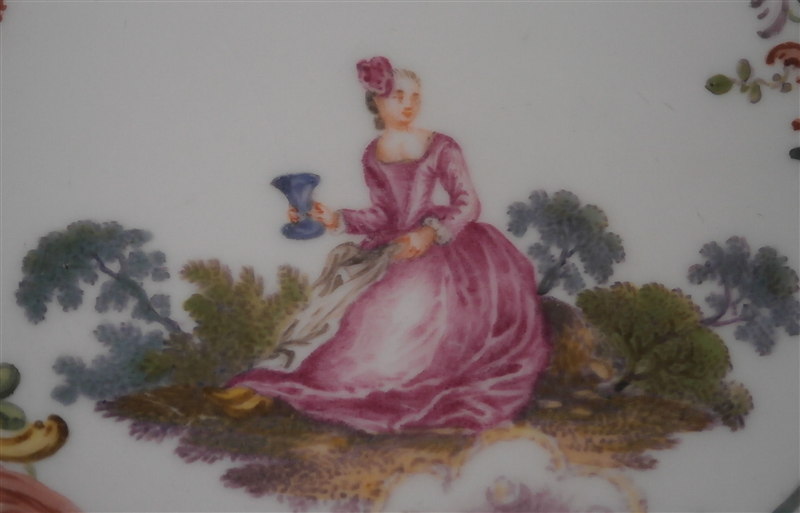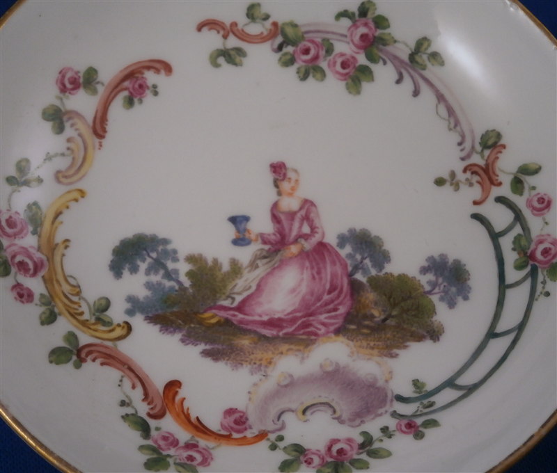 This is a nice saucer made by Meissen in about 1765. It is superbly handpainted with a central scene of a lady holding a cup in a landscape surrounding with a fancy scrollwork / trellis design around it that is quite colorful and has rose garlands growing along it. Gold trim to the rim. The saucer is in great condition with some wear to the gold trim and a glaze starline near the lady's head. That is on the top glaze only and does not go through at all. Something one rarely sees on German porcelain much more common on English! The piece is 1.125 inches tall and 4.75 inches in diameter. It is marked with the blue crossed swords mark underneath with the dot between the hilts and an impressed number near the footring. Please email me for more information or other pictures.