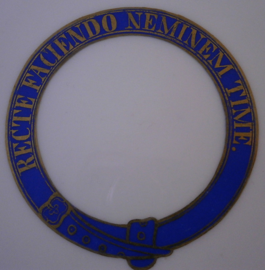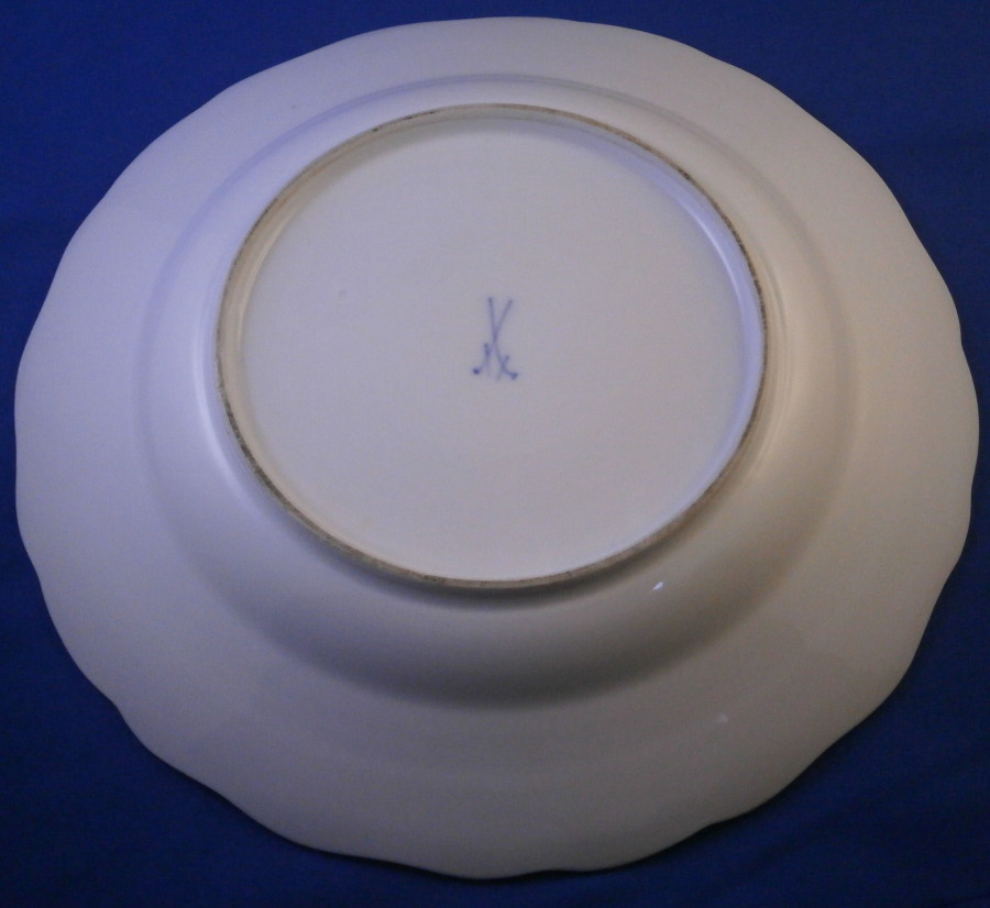 This is an interesting plate made by Meissen in the mid 19th century. It has a very nice armorial / coat of arms to the top for Count Glam Callas with the rest of the edge having a nice royal blue ground color with a bit of gilding to it. Gold trim around the well of the plate. The center has the same blue and gold combo and the words Recte Faciendo Neminem Time. (for timeas or timeo)in a loop with a belt like look to it. This same central design was also used for a plate I once owned for the Order of the Garter award so maybe they are linked through that!?! The Latin words sare an old medieval and Christian knightly motto and it translates to: “By doing right, shall fear no one”- roughly: Safe by doing the right thing. As for the Armorial: Count Eduard Clam Gallas 1805-1891 was a general who received the miltary order of St Theresa, the highest order in Austria. in 1865 he was Imperial Hofmeister (House master to the Emperor). The powerful Von Gallas family were from northern Bohemia. Johan Wenzel Von Gallas built a palace in Prague in the early 18th Century. When the male line died out, Christian Philip Von Clam inherited estates from his uncle in 1757, and the Clam-Gallas line was created. You can see the arms above the massive doors to the palace, the family seat. Beethoven and Mozart performed concerts here for the family, parents of Eduard. Quite the impressive family! The plate is marked with the under glaze blue crossed swords mark on the underside as shown as well as an impressed number 8 (I think). The plate is 1.375 inches tall and 9.5 inches in diameter. It is in superb condition with one light mark in the blue area at around 7 o'clock. Please email me for more information or other pictures.