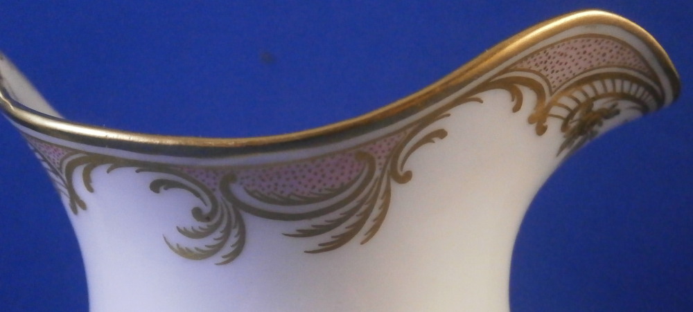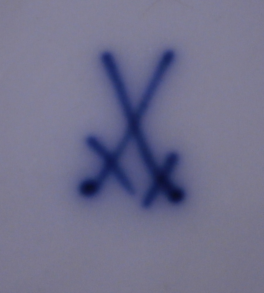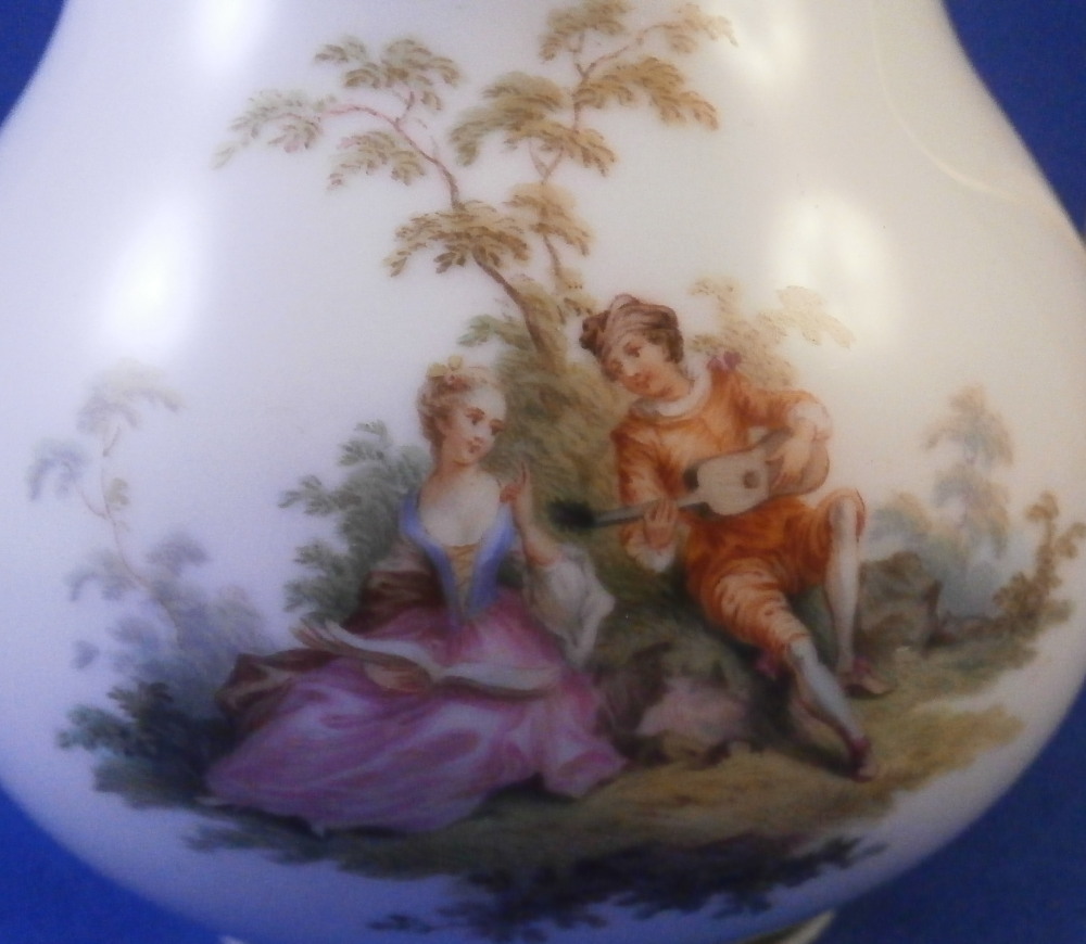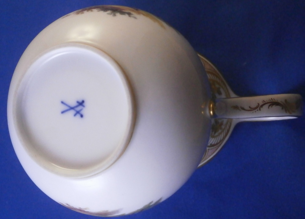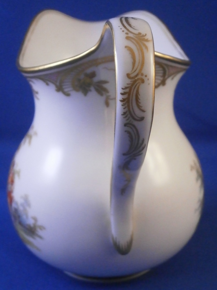 This is a nice creamer made by Meissen in the mid to later 19th century. It has a nice shape to it, a good size as well and is hand painted with a polychrome Watteau style scene on both sides. The scenes include couples in a landscape surrounding. Very nice quality painting! The top rim has a gold design with areas of tiny pink dots in between as shown. Gold line to the inside edge and gold trim to the handle. All in all a very nice example! The creamer is in superb condition with just a spot of two of wear to that tiny thin gold line of the inside edge. As nice as they come! The piece is marked with the under glaze blue crossed swords mark (first choice) underneath as shown. The creamer is 4.125 inches tall at the handle, 3 inches wide and 4.375 inches from spout to handle. Please email me for more information or other pictures.