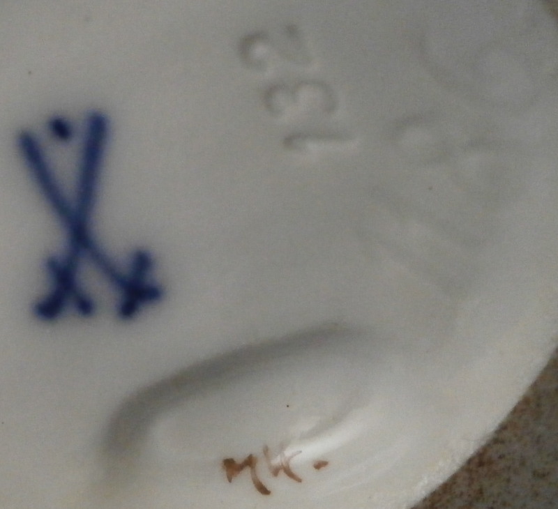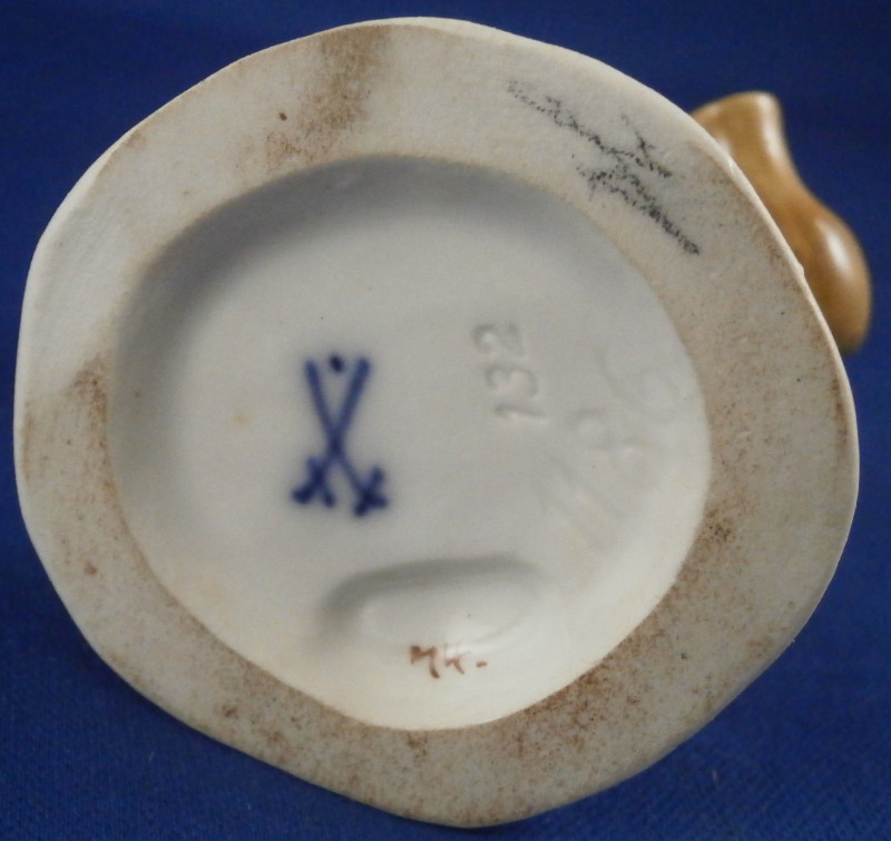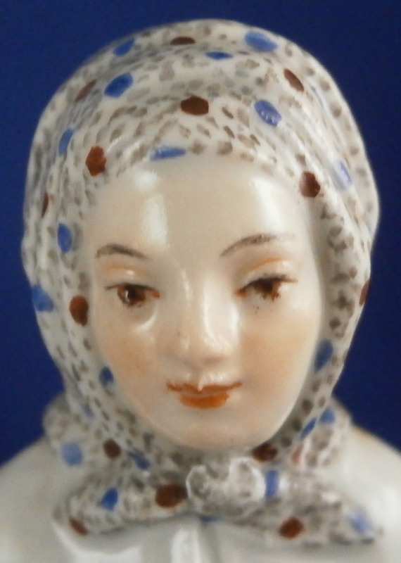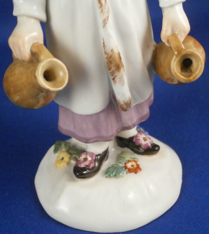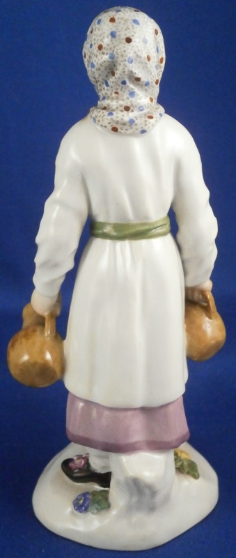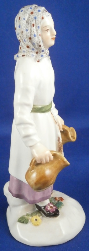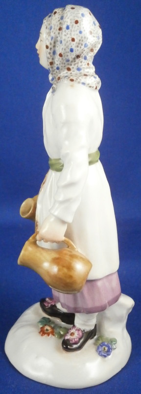 This is a figurine of a peasant girl from the Russian street trader series made by Meissen during the Pfeiffer period of the 20th century. The series is sometimes called the Cris de St. Petersburg - the Russian version of the Cris de Paris from France. First modeled by Peter Reinicke in the 18th century the figurine is of a lady golding a jug in each hand while wearing a long coat, a head scarf and standing on a white base with some flowers on it. A really well modeled and hand painted figurine. The figure is in perfect condition which is always a ncie bonus with porcelain! She is 5 inches tall, 2.25 inches wide and 2 inches deep and marked with the crossed swords mark underneath with the dots between the top parts the base as well as the usual impressed numbers of the period and a 74. as a painter's mark. Please email me for more information or other pictures.