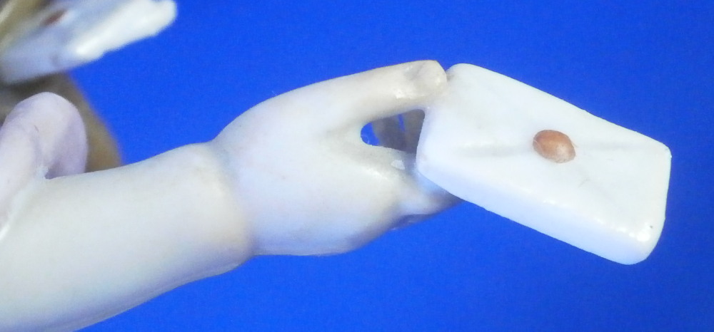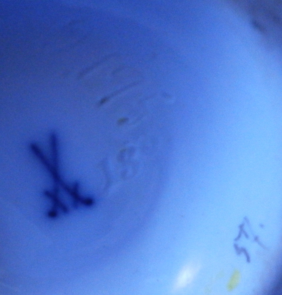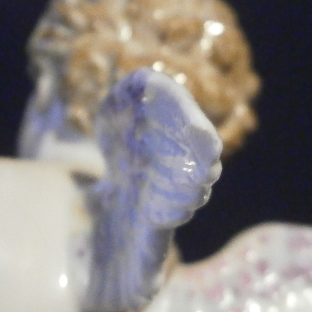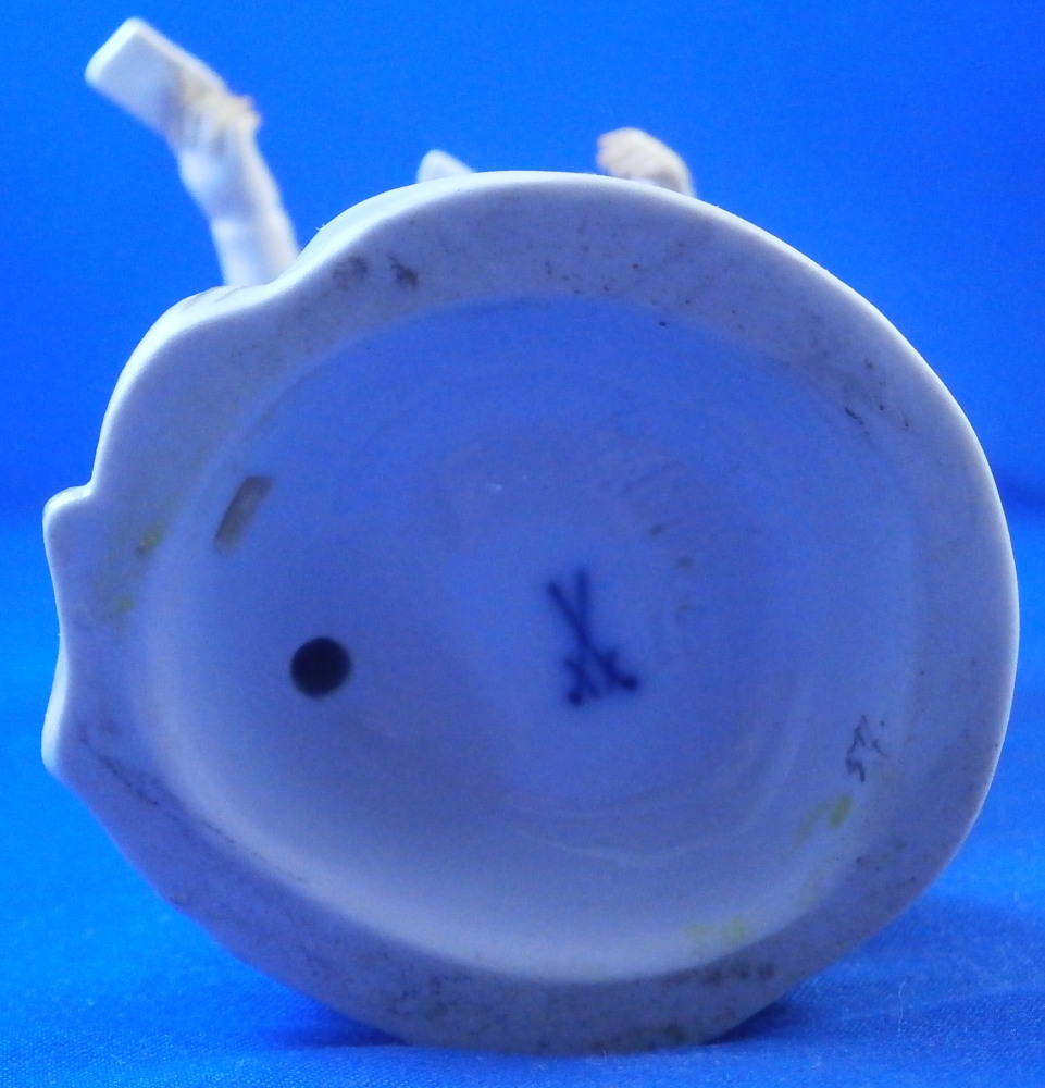 This is a really nice figurine made by Meissen in the late 19th century. It is of a cherub aka Cupid / Amor playing postal service. A nice size figurine that is superbly modeled with lots of details and hand painted to perfection. His wings in the back, a little bag in front with two letters sticking out and another letter in his hand. He is presumably delivering his love letters :) in Nice base with some gilt scrolls to it, a tree stump in the back and another letter on top. Pink cloth around his mid section. The figure is in great condition and displays perfectly but there is a small chip to one of the wing tips as shown. The underside base has the under glaze blue crossed swords mark to it as well as a painter's mark and the usual impressed and incised numbers as shown. The figure is 5.75 inches tall, 2.5 inches wide and 2.875 inches deep. Please email me for more information or other pictures.