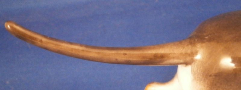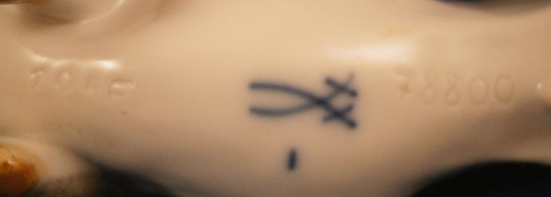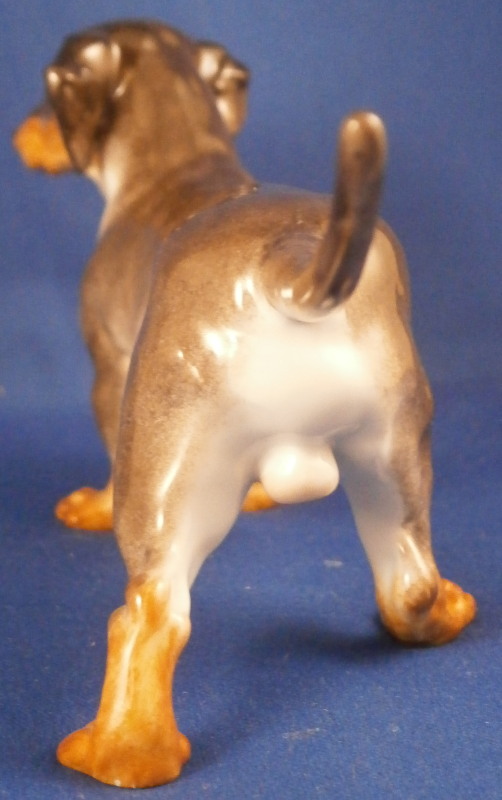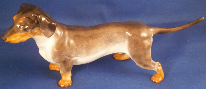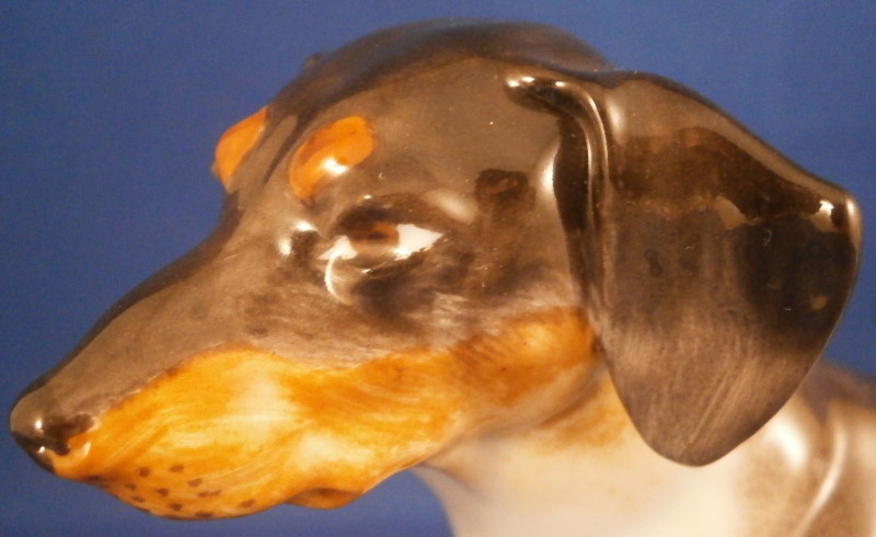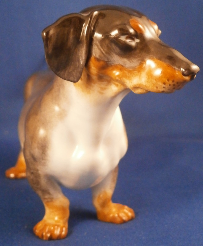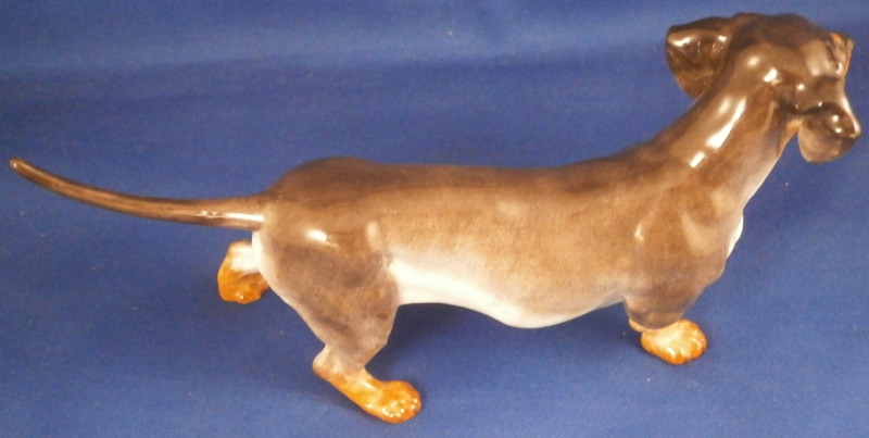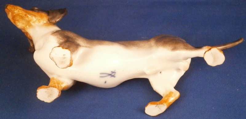 This is a really cute and fun dog figurine made by Meissen in the 20th century. It is of a male Dachshund and is perfectly modeled and hand painted to look like the real thing. Long and skinny with the tail sticking straight out. One of the nicest dog figures they made and not one you see often in perfect condition! The figure is marked underneath with the under glazed blue crossed swords mark as well as a blue line and the usual impressed numbers as shown. The dog is 3.25 inches tall, 2.125 inches wide and 7.5 inches long. Please email me for more information or other pictures.