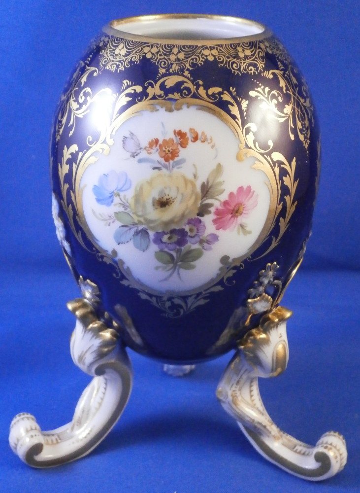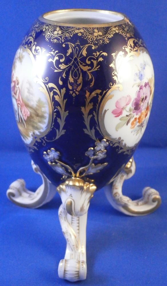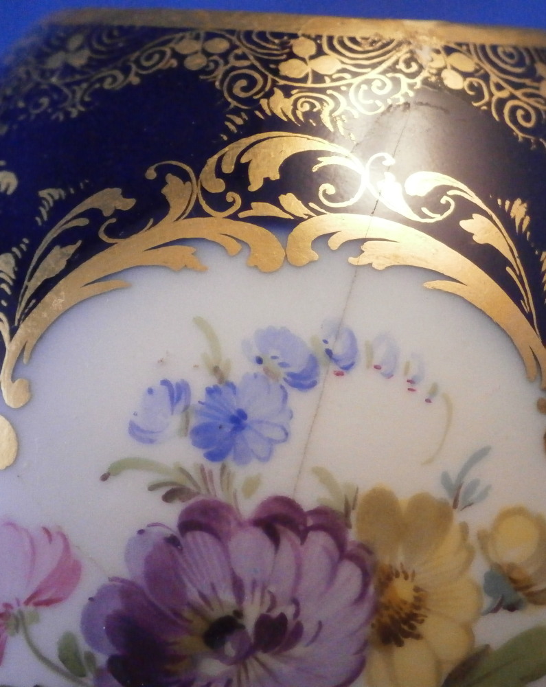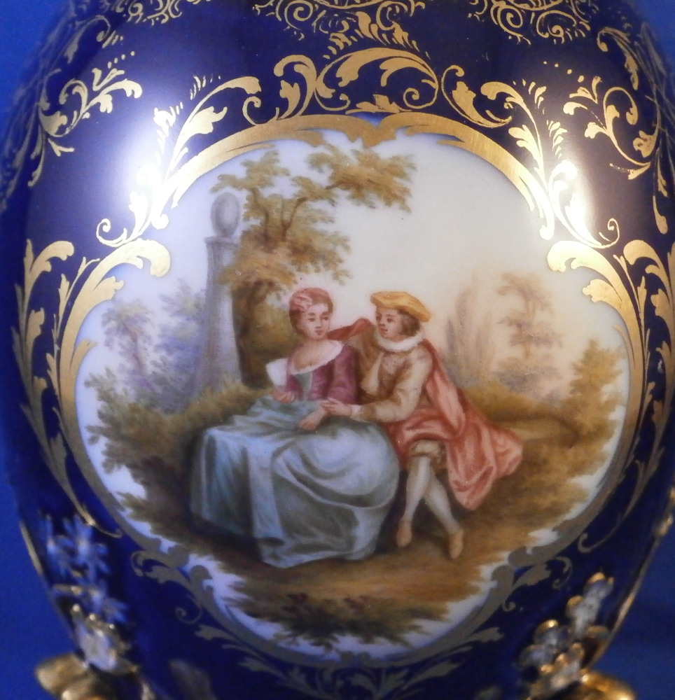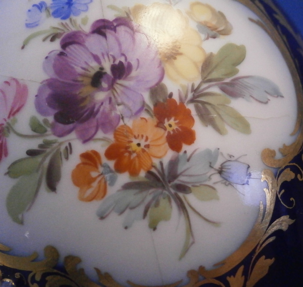 This is a nice tea jar or lidded vase made by Meissen in the late 19th or early 20th century. It is hand painted with a superb cobalt blue ground color with lots of fancy gilding on it and has three cartouches of which two are hand painted with floral arrangements on white ground and the last but certainly not the least with a superb Watteau style scene with two lovers in a landscape surrounding. The legs are nice as well with a branch going up them ending in raised flowers on top. The lid has the same cobalt blue ground with fancy gilding combo with a nice finial to it. The piece displays superbly but has been damaged. The finial was broken out of the lid and reglued though it is hard to spot. The main body has been knocked against in the center of the one floral arrangement and fromthe round small damaged spot three hairline form a star hairline one of which hits the top edge where a small piece was missing and was restored and the other goes down to the bottom and comes back up to under the Watteaus scene. Major damage but hard to spot unless you look for it. Still looks amazing when on display. Or you can just use the lid for one that is missing theirs. The tea caddy is unmarked which is fairly normal since the blue would hide it. Sometimes these are marked underneath one leg but that can rub away over time since that area is not glazed which is probably the case here. Still definitely made by Meissen during this period. The piece with the lid in place is 6 inches tall and has a diameter of 3 inches. Please email me for more information.