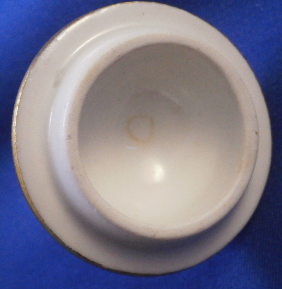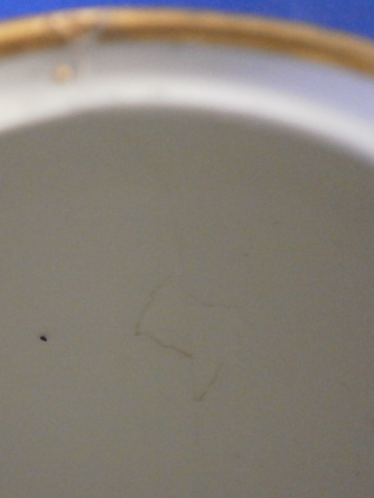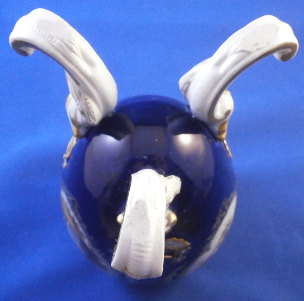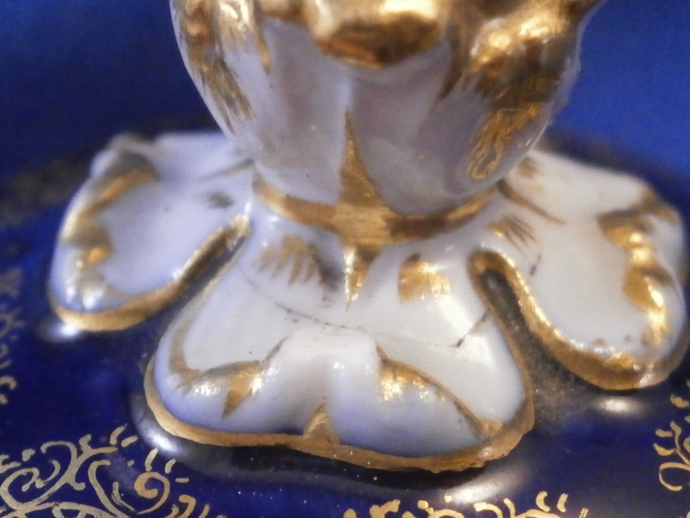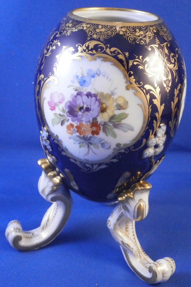 This is a nice tea jar or lidded vase made by Meissen in the late 19th or early 20th century. It is hand painted with a superb cobalt blue ground color with lots of fancy gilding on it and has three cartouches of which two are hand painted with floral arrangements on white ground and the last but certainly not the least with a superb Watteau style scene with two lovers in a landscape surrounding. The legs are nice as well with a branch going up them ending in raised flowers on top. The lid has the same cobalt blue ground with fancy gilding combo with a nice finial to it. The piece displays superbly but has been damaged. The finial was broken out of the lid and reglued though it is hard to spot. The main body has been knocked against in the center of the one floral arrangement and fromthe round small damaged spot three hairline form a star hairline one of which hits the top edge where a small piece was missing and was restored and the other goes down to the bottom and comes back up to under the Watteaus scene. Major damage but hard to spot unless you look for it. Still looks amazing when on display. Or you can just use the lid for one that is missing theirs. The tea caddy is unmarked which is fairly normal since the blue would hide it. Sometimes these are marked underneath one leg but that can rub away over time since that area is not glazed which is probably the case here. Still definitely made by Meissen during this period. The piece with the lid in place is 6 inches tall and has a diameter of 3 inches. Please email me for more information.
