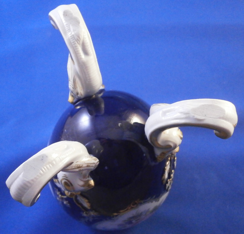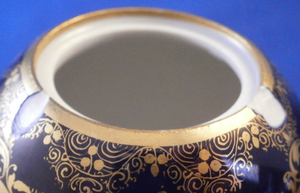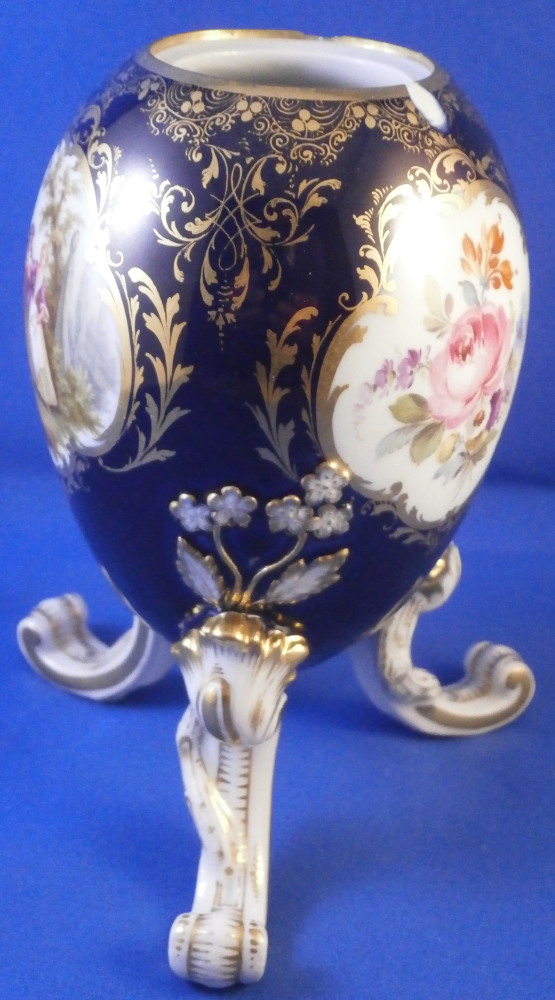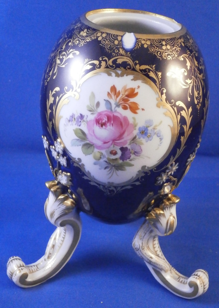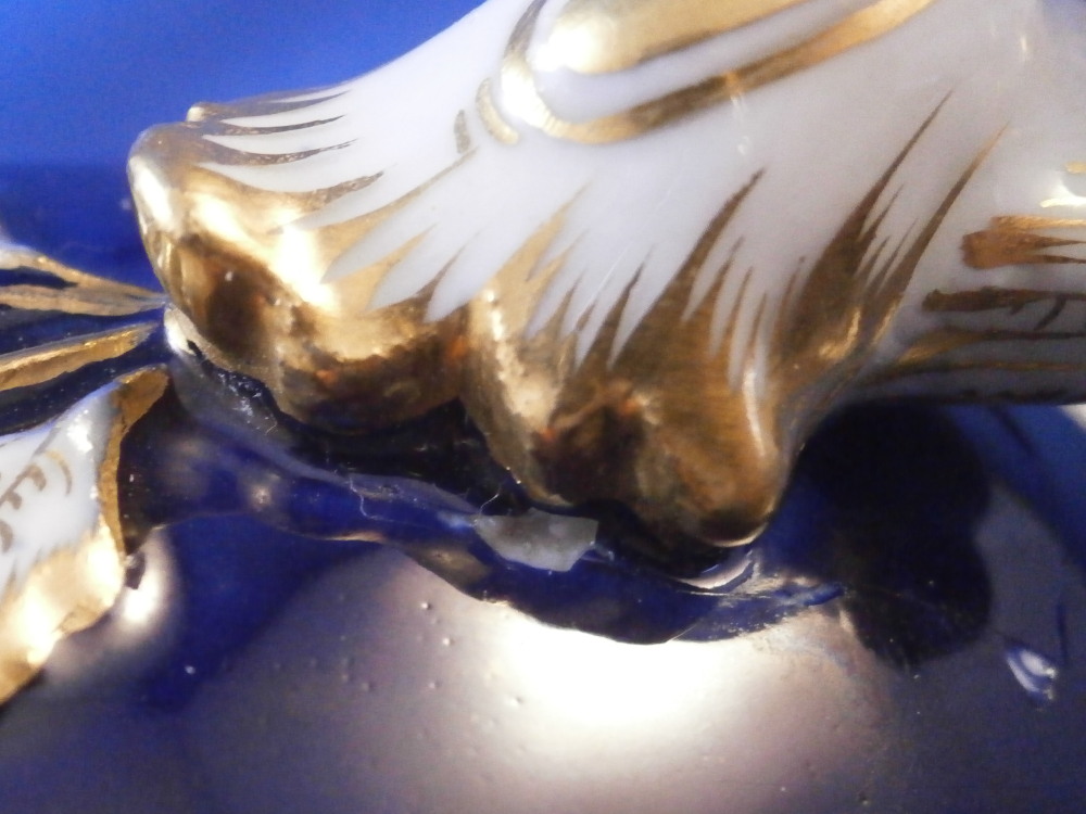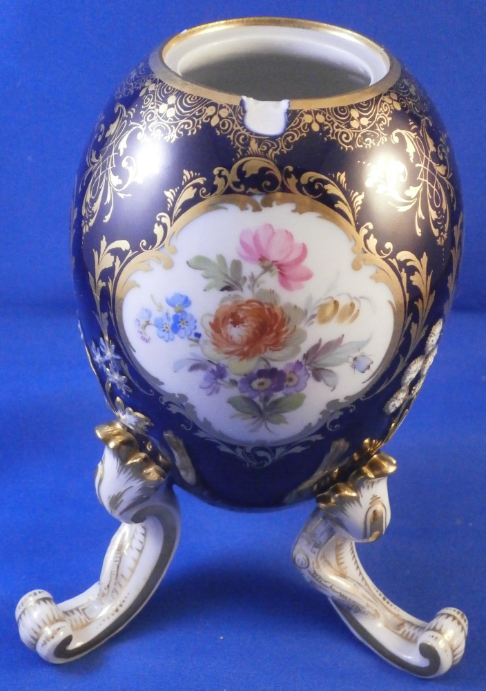 This is a nice tea jar or lidded vase made by Meissen in the late 19th or early 20th century. It is hand painted with a superb cobalt blue ground color with lots of fancy gilding on it and has three cartouches of which two are hand painted with floral arrangements on white ground and the last but certainly not the least with a superb Watteau style scene with two lovers in a landscape surrounding. The legs are nice as well with a branch going up them ending in raised flowers on top. The lid has the same cobalt blue ground with fancy gilding combo with a nice finial to it. The piece displays nicely but has been damaged. The lid was broken and relgued as shown with a small piece missing. Could be done much better. The main body has two flat chips to the top edge as shown and two of the legs were broken off the body taking with them some of the main body. Oddly enough that dmage is not obvious unless you look closely and could be fixed perfectly. Major damage but not outside of a good restorer's abilities! Still looks amazing when on display. The tea caddy is unmarked which is fairly normal since the blue would hide it. Sometimes these are marked underneath one leg but that can rub away over time since that area is not glazed which is probably the case here. Still definitely made by Meissen during this period. The piece with the lid in place is 6 inches tall and has a diameter of 3 inches. Please email me for more information.
