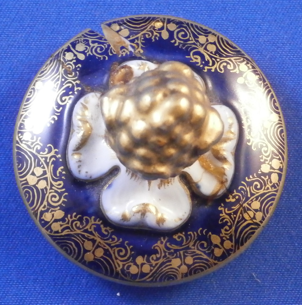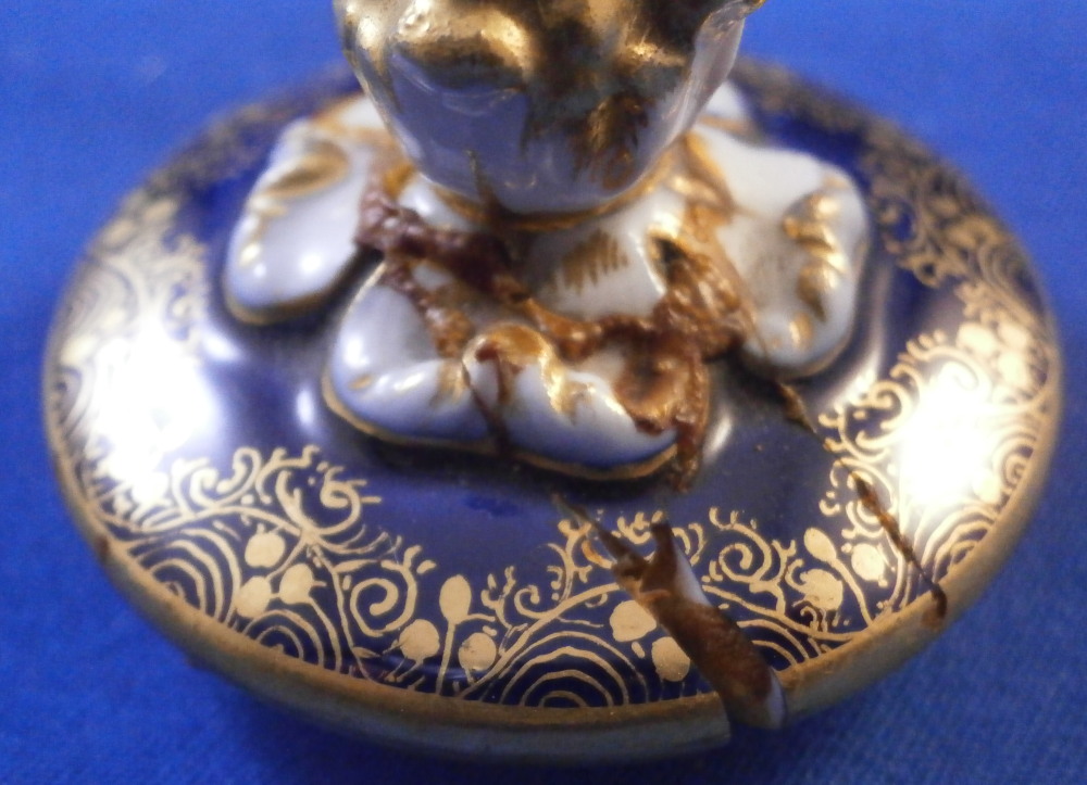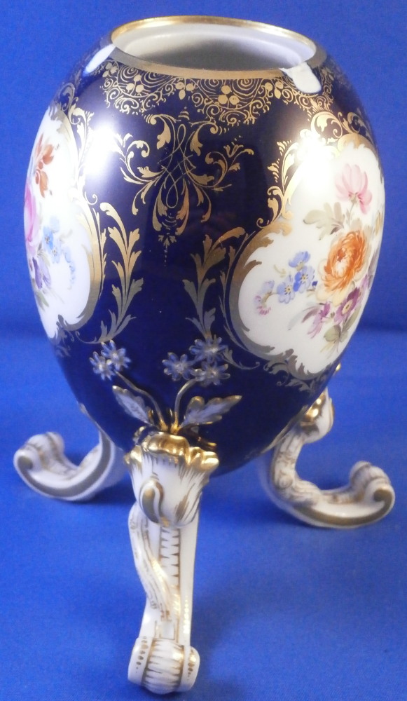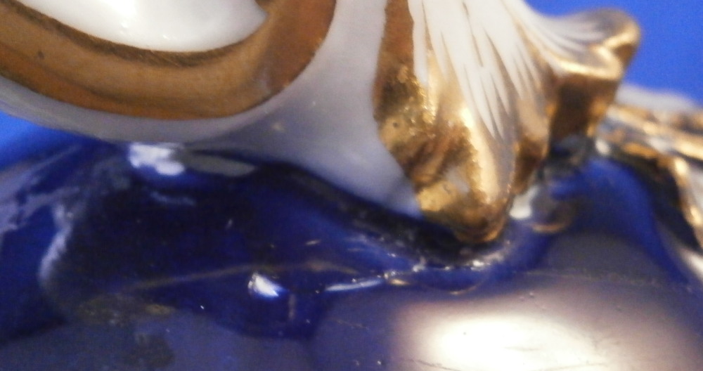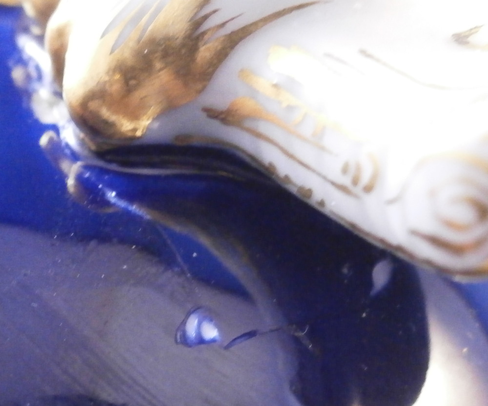 This is a nice tea jar or lidded vase made by Meissen in the late 19th or early 20th century. It is hand painted with a superb cobalt blue ground color with lots of fancy gilding on it and has three cartouches of which two are hand painted with floral arrangements on white ground and the last but certainly not the least with a superb Watteau style scene with two lovers in a landscape surrounding. The legs are nice as well with a branch going up them ending in raised flowers on top. The lid has the same cobalt blue ground with fancy gilding combo with a nice finial to it. The piece displays nicely but has been damaged. The lid was broken and relgued as shown with a small piece missing. Could be done much better. The main body has two flat chips to the top edge as shown and two of the legs were broken off the body taking with them some of the main body. Oddly enough that dmage is not obvious unless you look closely and could be fixed perfectly. Major damage but not outside of a good restorer's abilities! Still looks amazing when on display. The tea caddy is unmarked which is fairly normal since the blue would hide it. Sometimes these are marked underneath one leg but that can rub away over time since that area is not glazed which is probably the case here. Still definitely made by Meissen during this period. The piece with the lid in place is 6 inches tall and has a diameter of 3 inches. Please email me for more information.